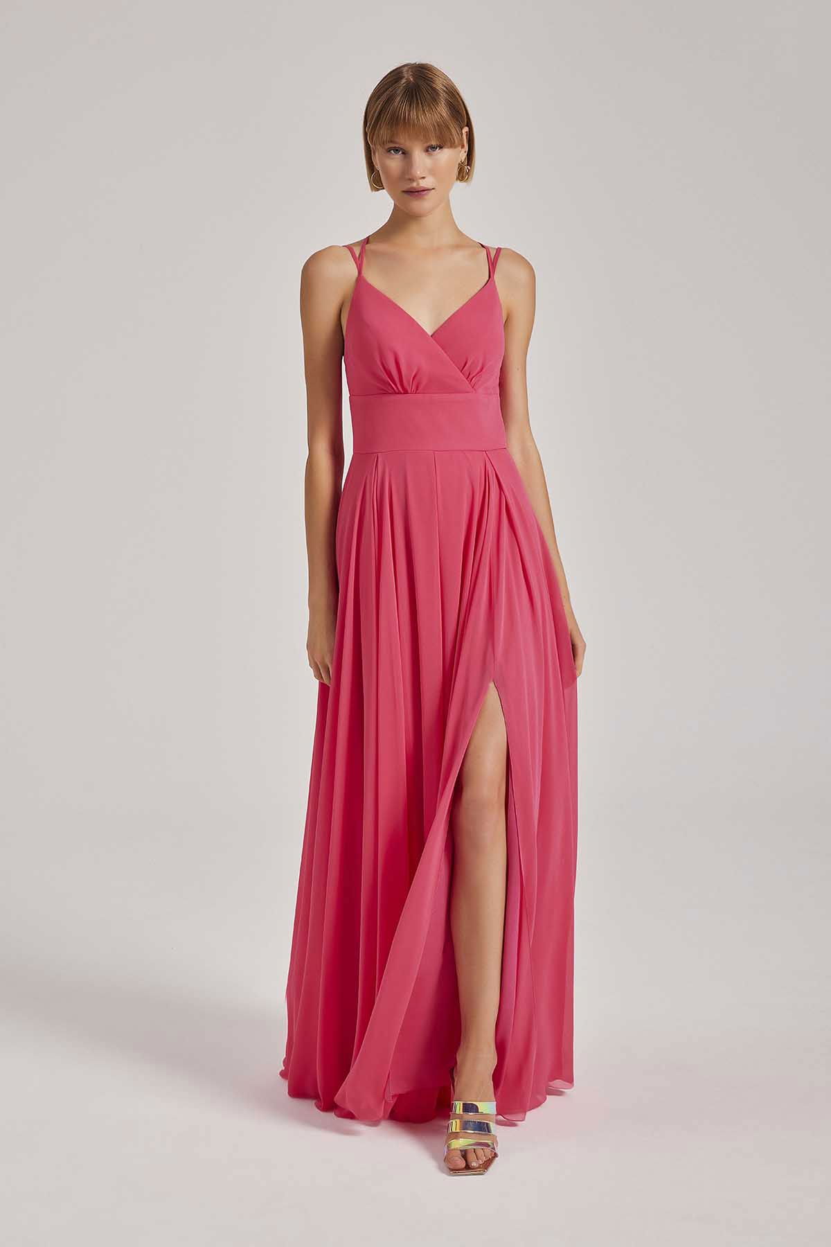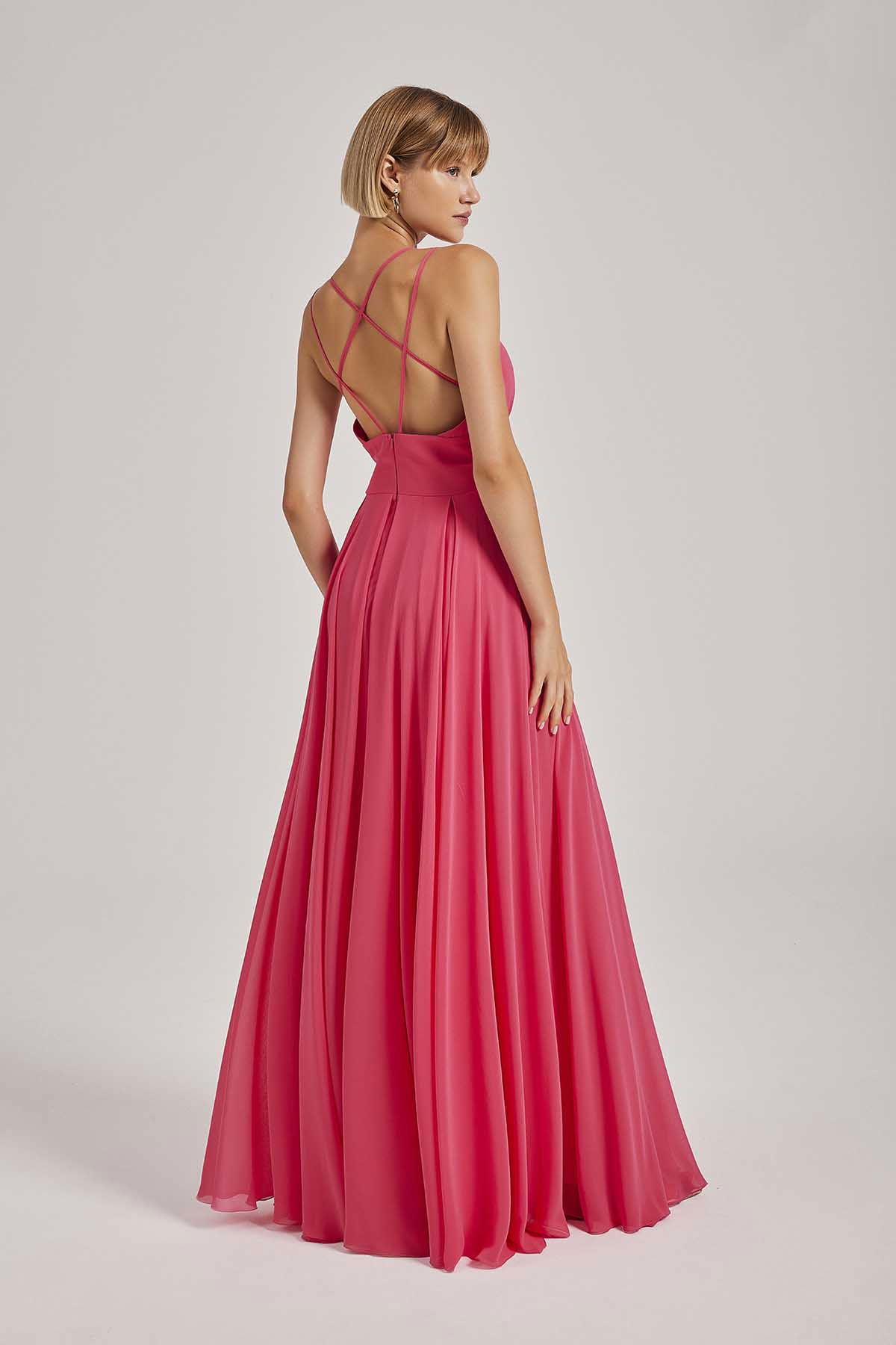 Detay: Sırt dekolteli, derin yırtmaçlı, belden aşağısı kloş, uzun, astarlı abiye elbise;