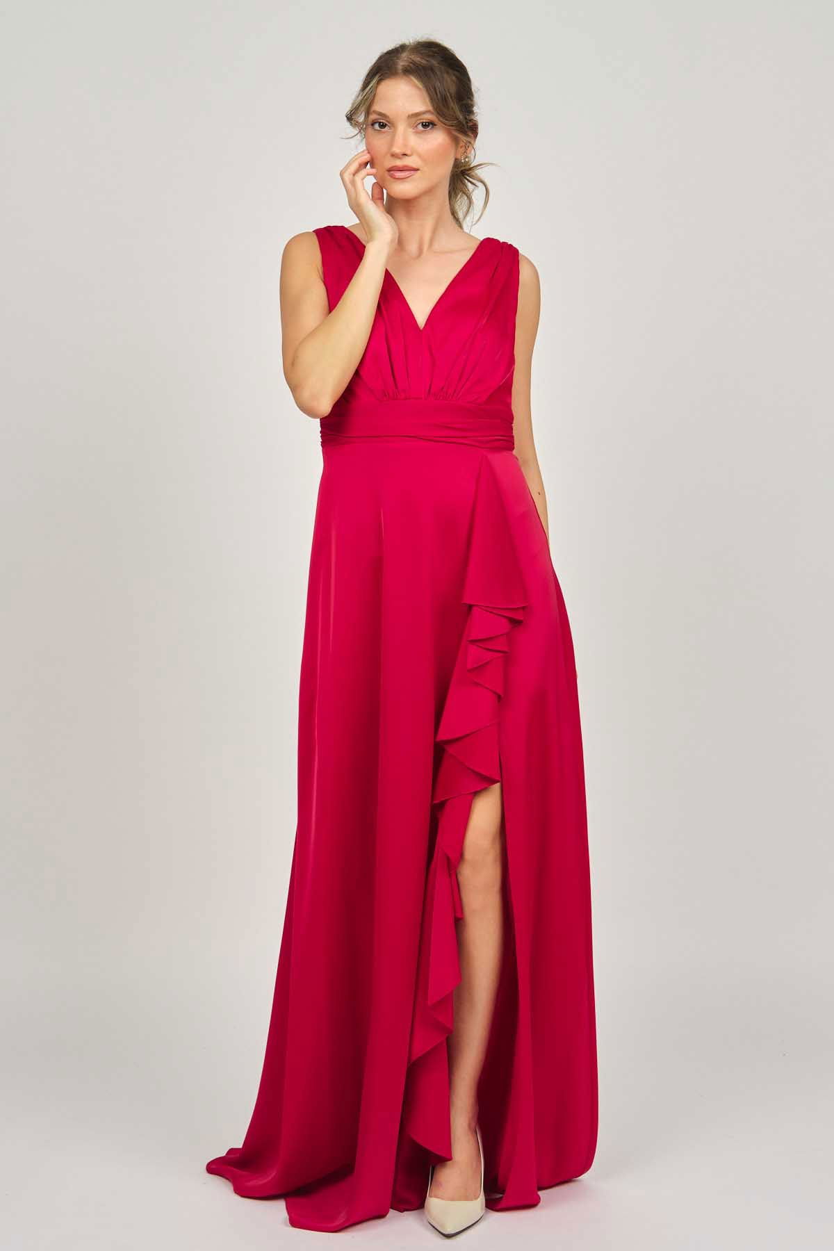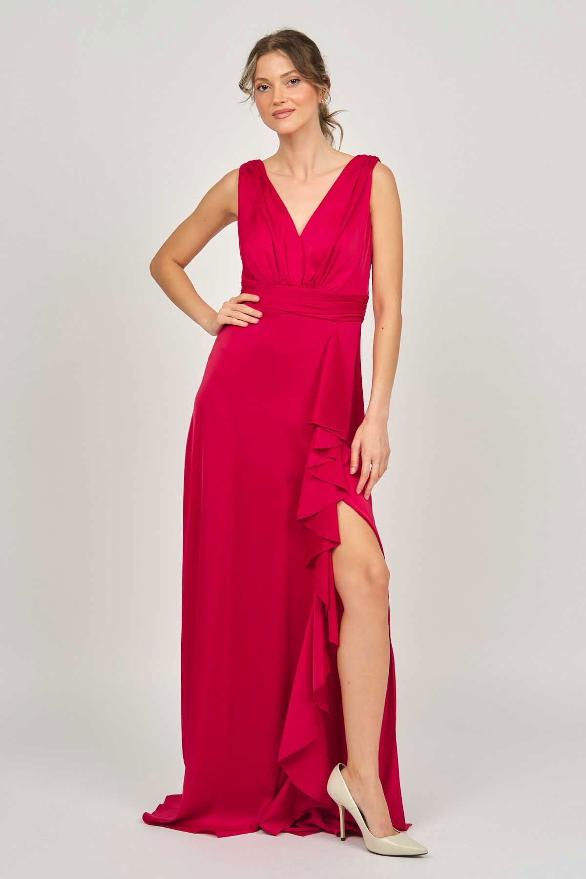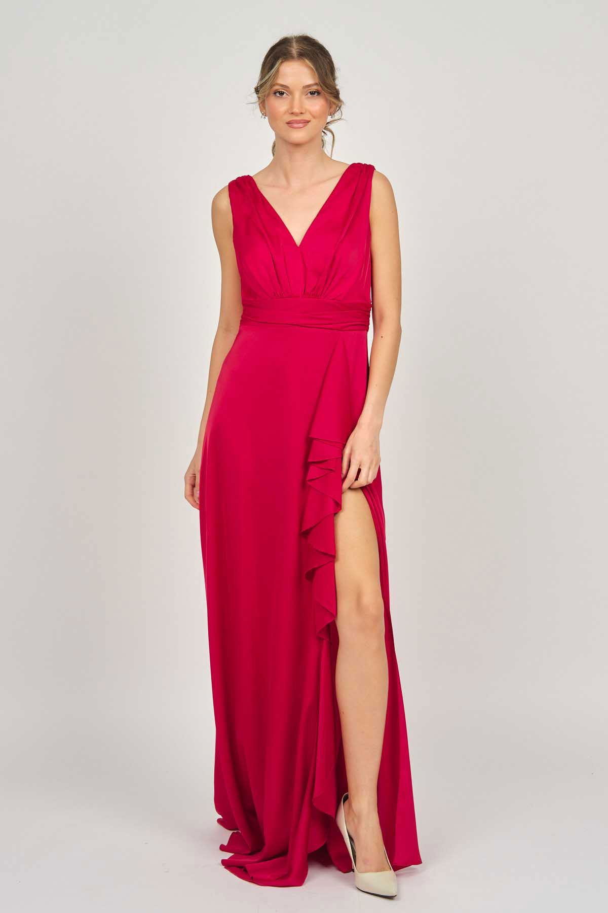 Detay: Derin yırtmaçlı, volanlı, astarlı abiye elbise;