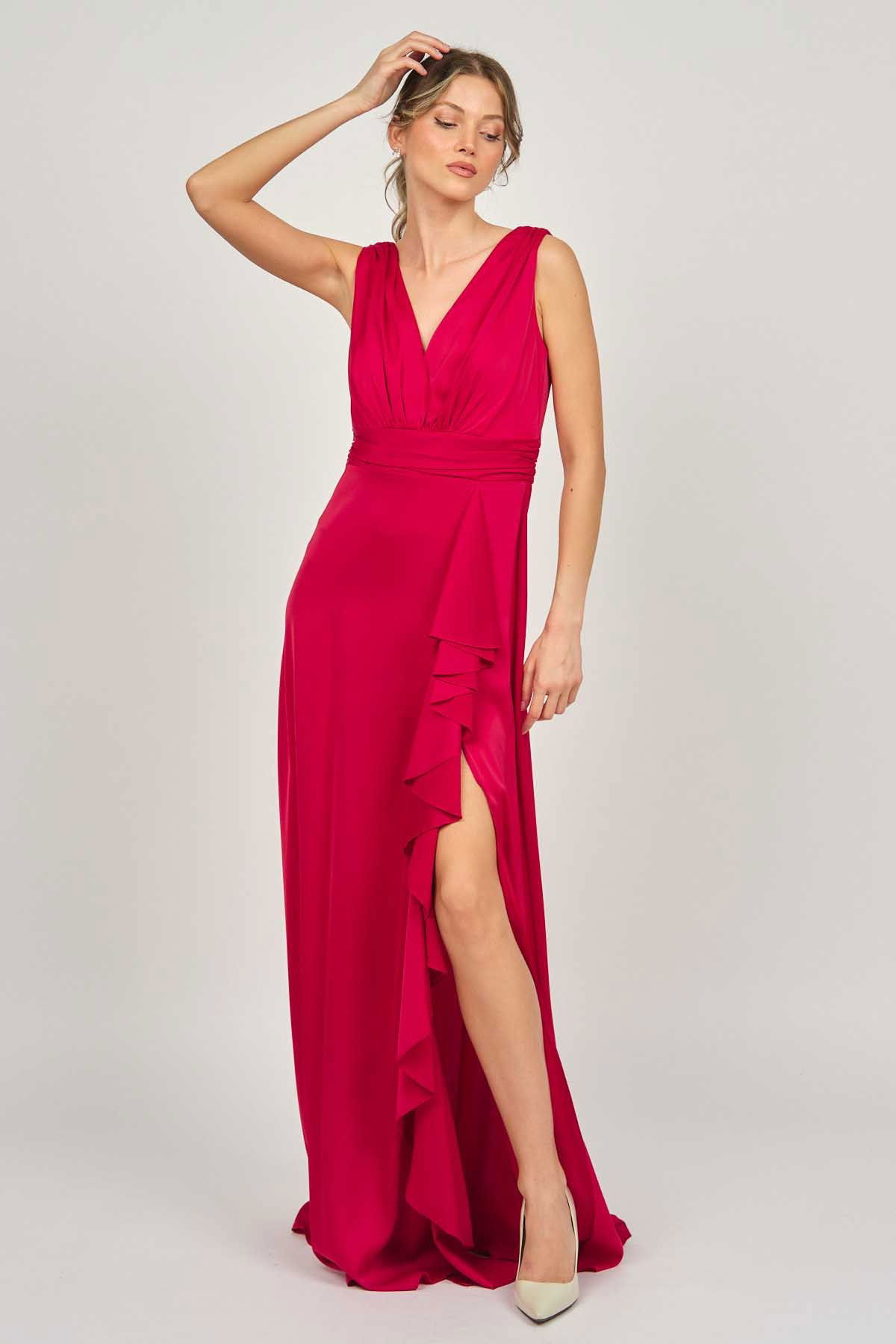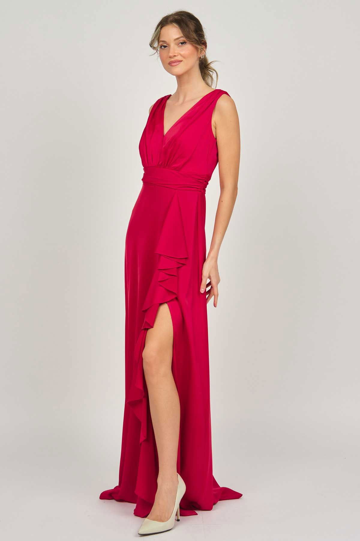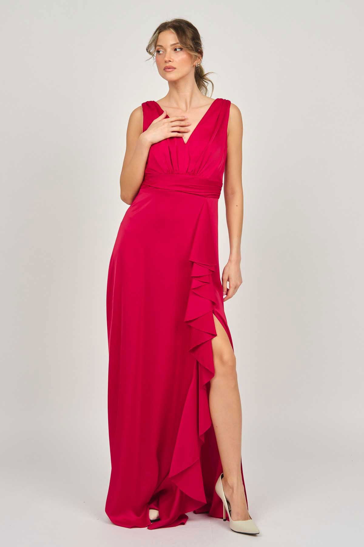 Detay: Derin yırtmaçlı, volanlı, astarlı abiye elbise;
