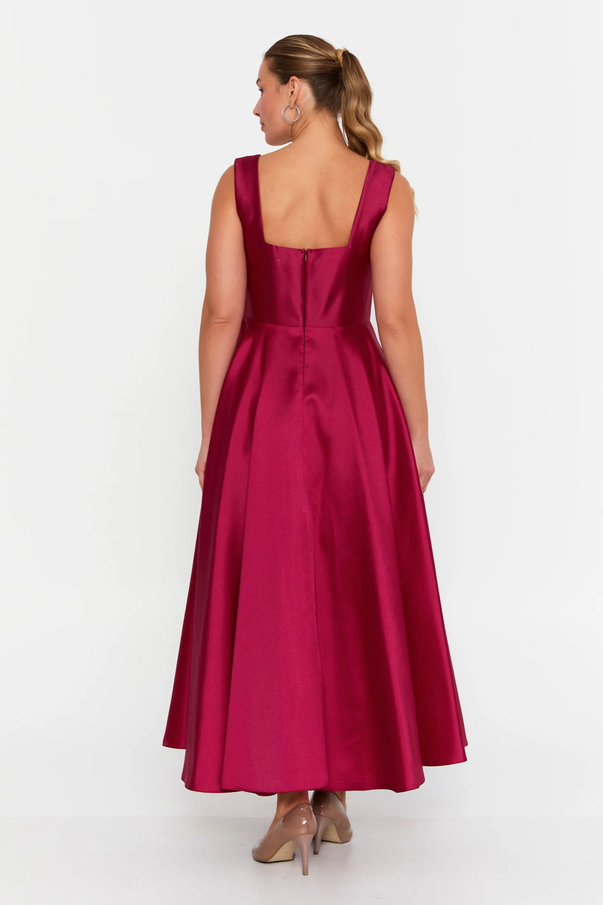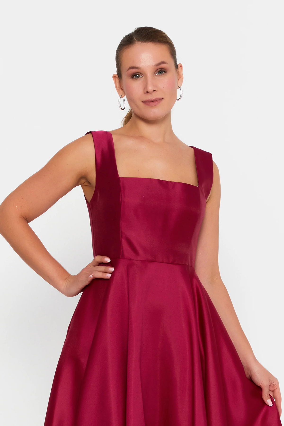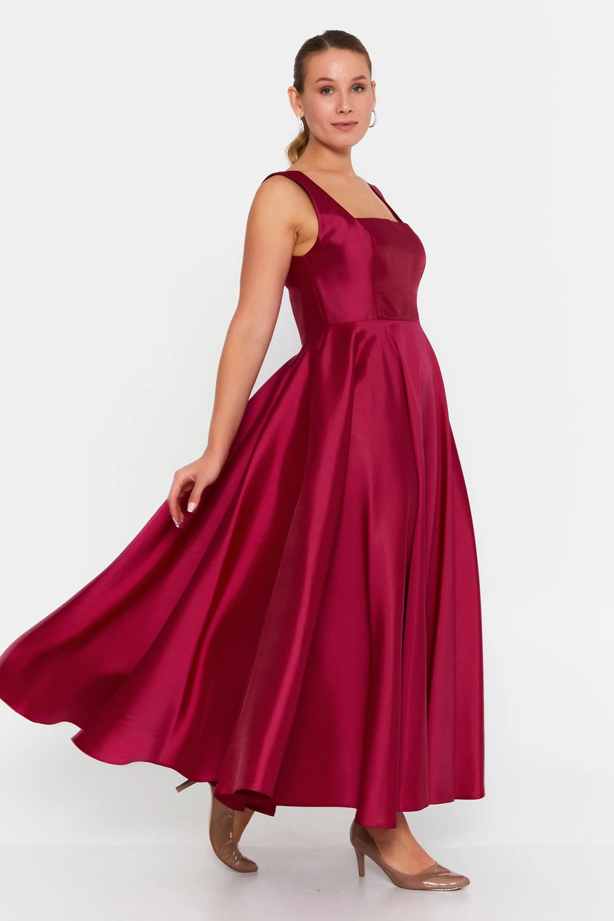 Doridorca Kadın Kare Yaka Kalın Askılı Bilek Boy Saten Abiye Elbise 6098 Vişne