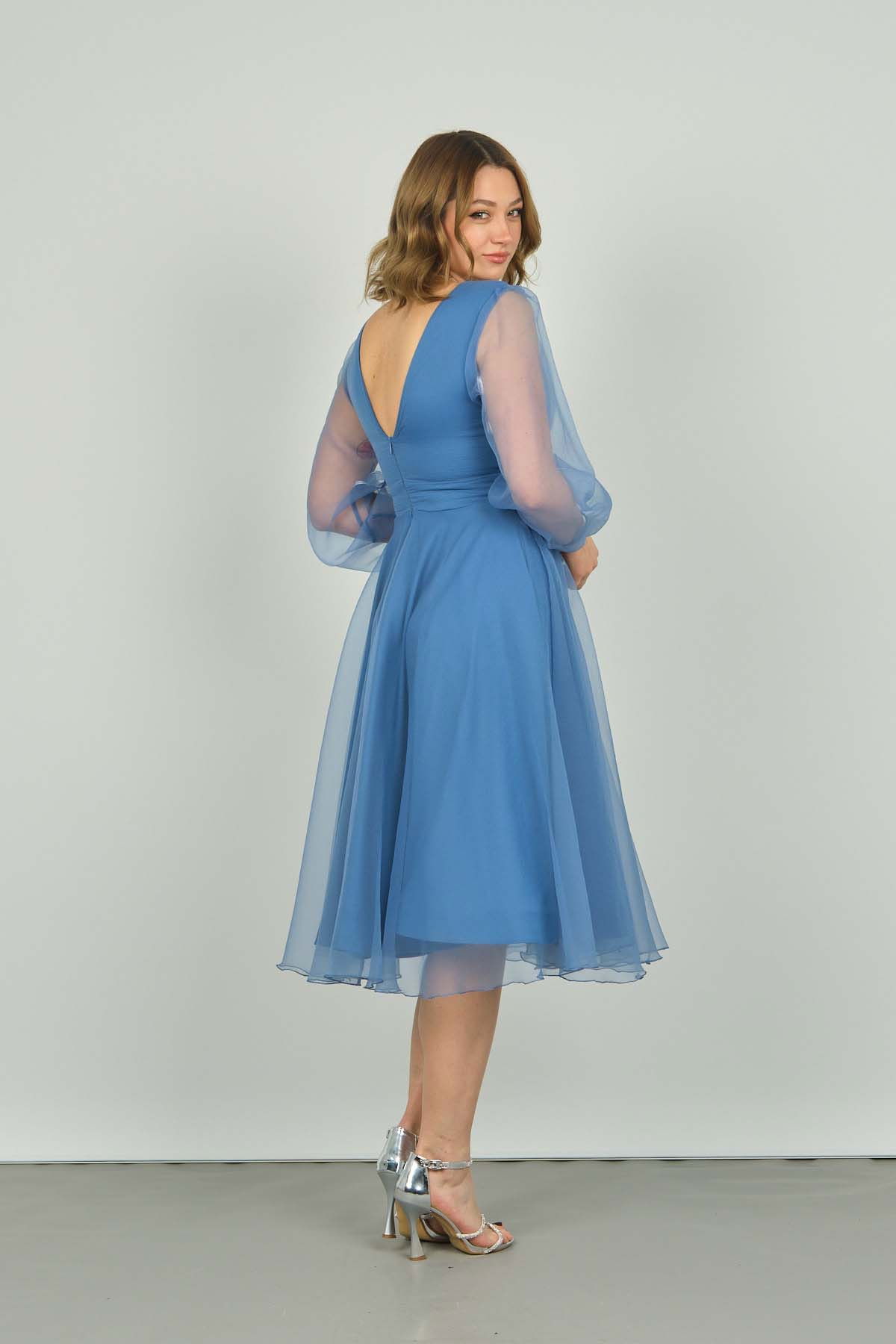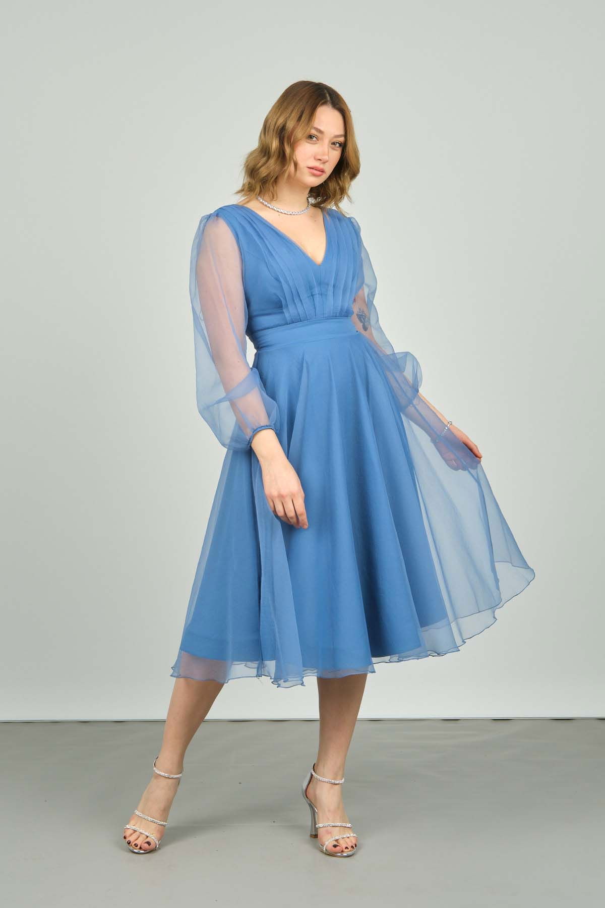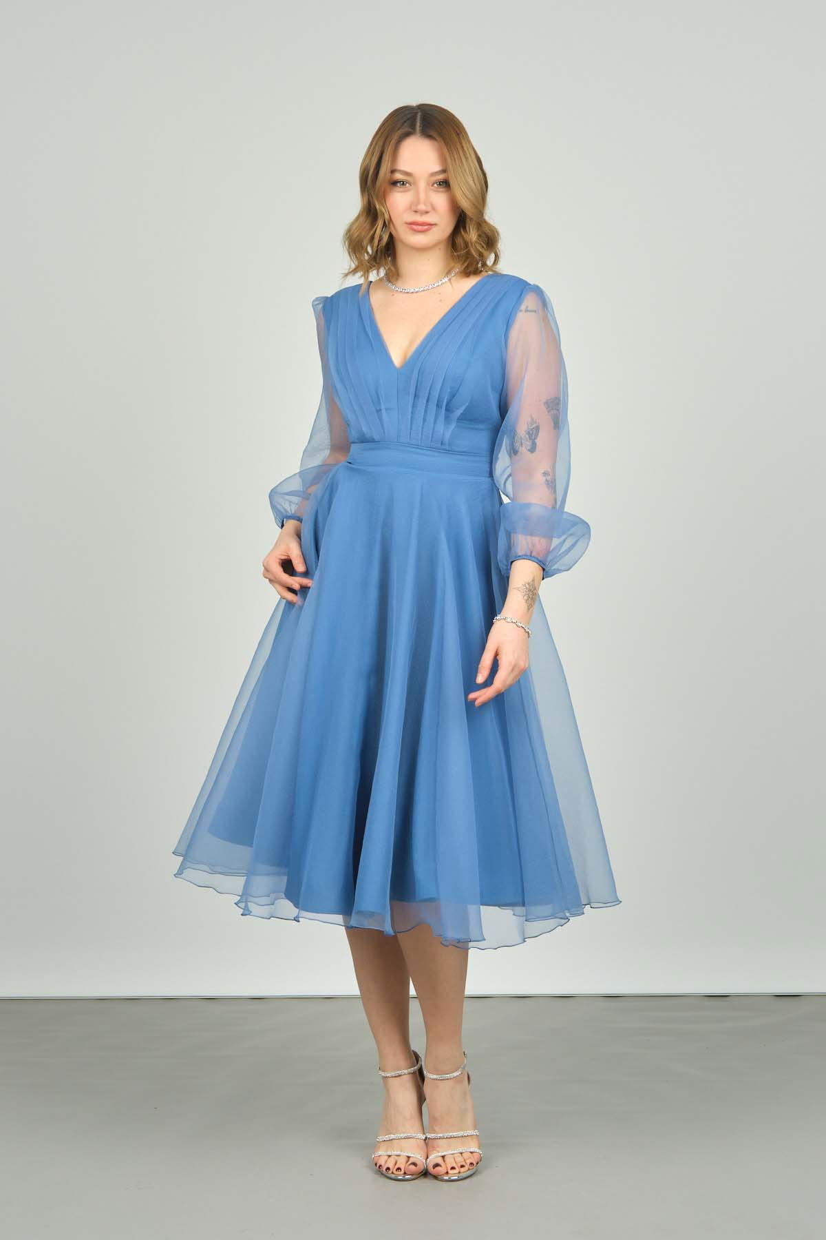 Detay: Ön-arka V yaka, kollar ve üst etek tül, astarlı, midi boy abiye elbise ;