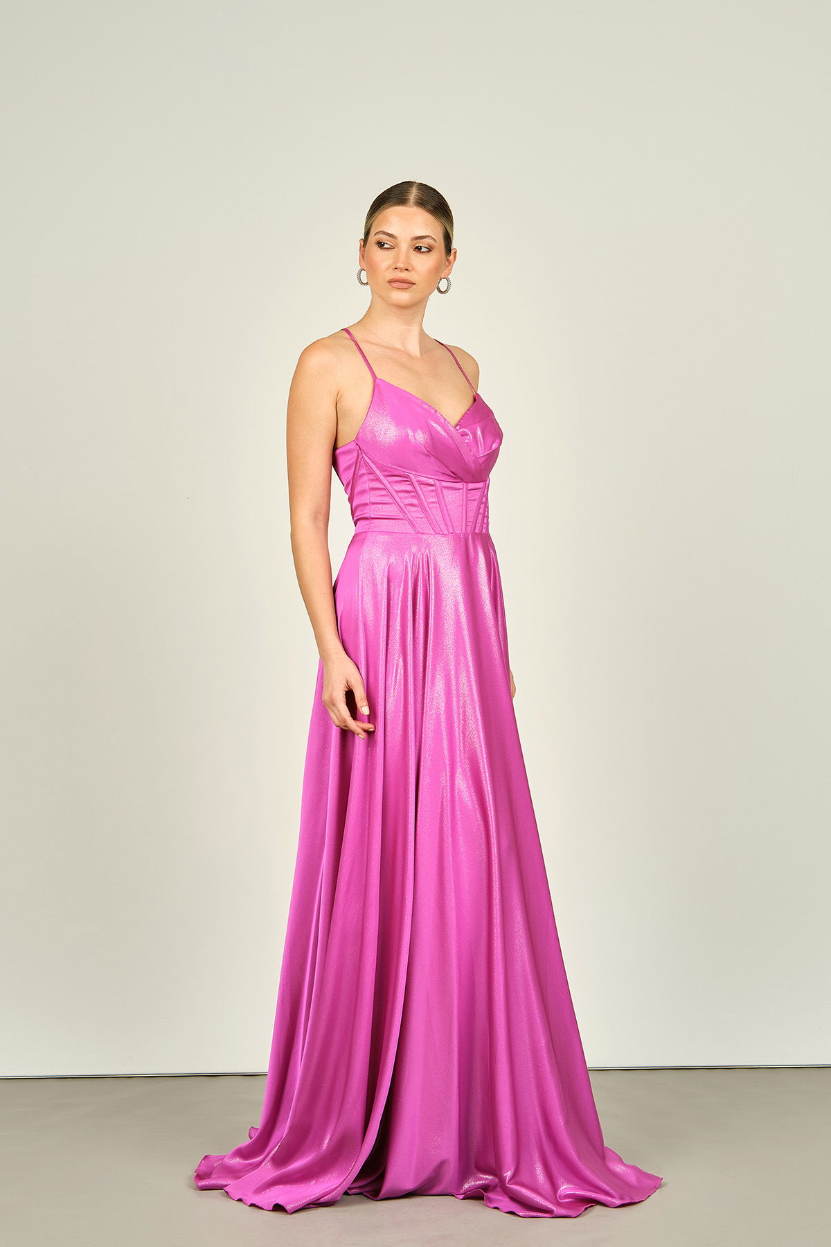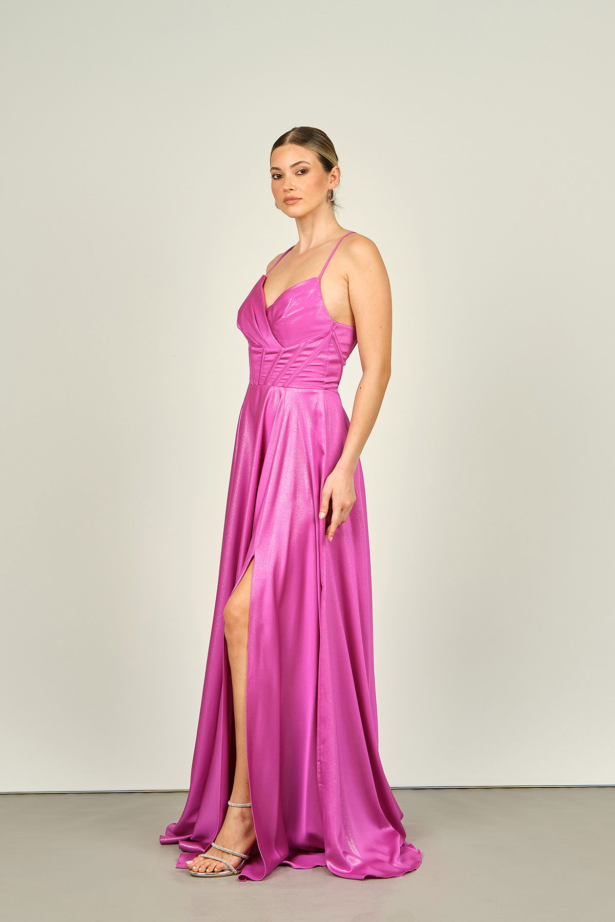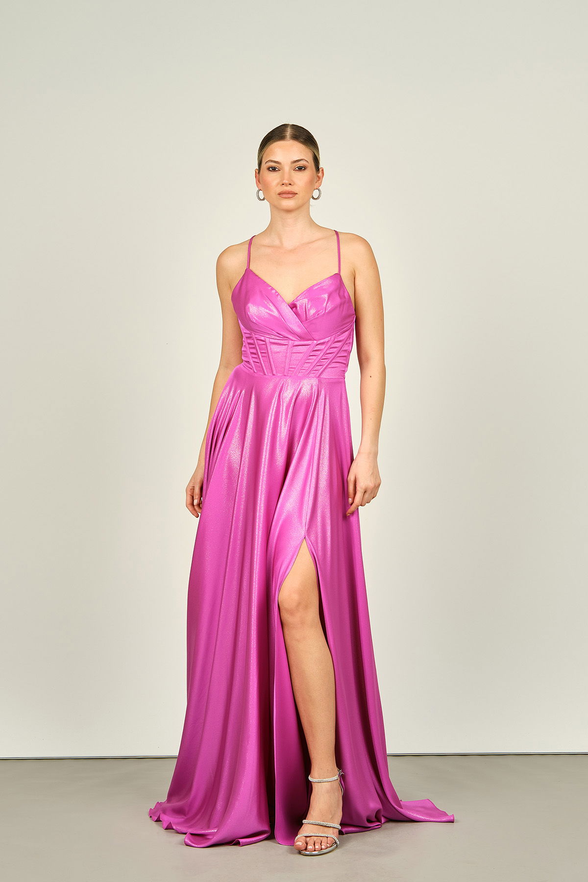 Detay: Parlak kumaş, derin yırtmaçlı, kruvaze, astarlı, uzun abiye elbise;