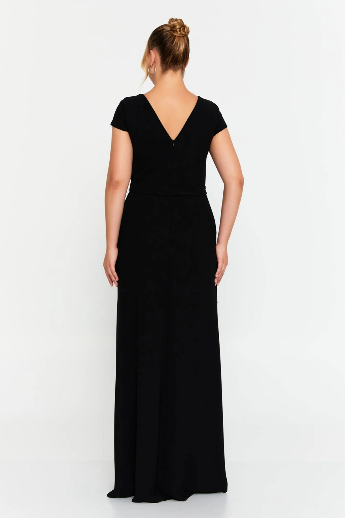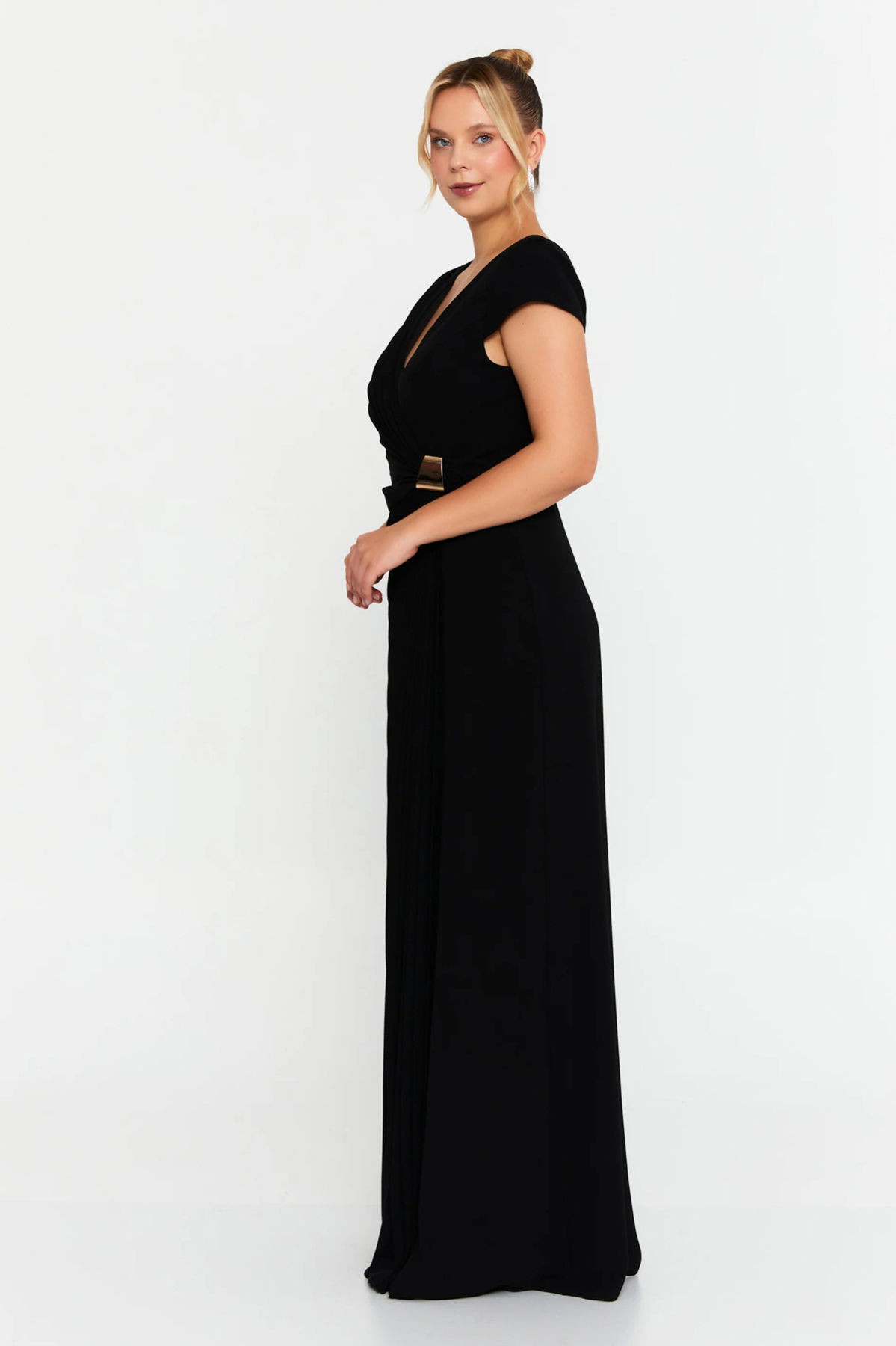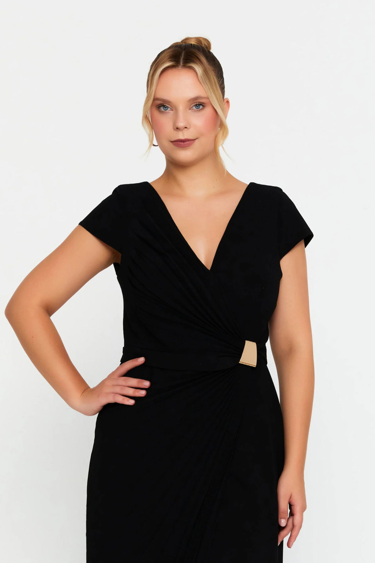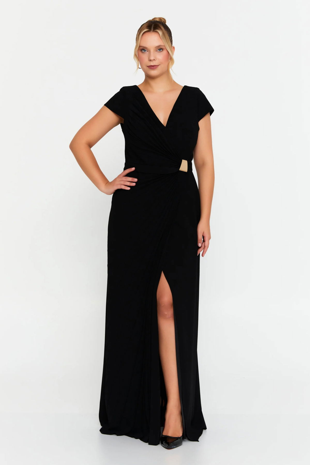 Detay: Krep kumaştan üretilen kruvaze yaka uzun abiye elbise, tek tarafı piliseli tasarımı ve sabit gold toka detayıyla zarif ve modern bir şıklık sunar. Kısa kollu yapısı, anvelop etek formu ve düz kesimiyle vücuda uyumlu bir siluet oluştururken özel davetler ve gece organizasyonları için ideal bir görünüm sağlar. Astarlı yapısı, fermuarlı kapaması ve geniş beden aralığıyla hem konforlu hem de her vücut tipine hitap eden şık bir uzun abiye elbise seçeneğidir;