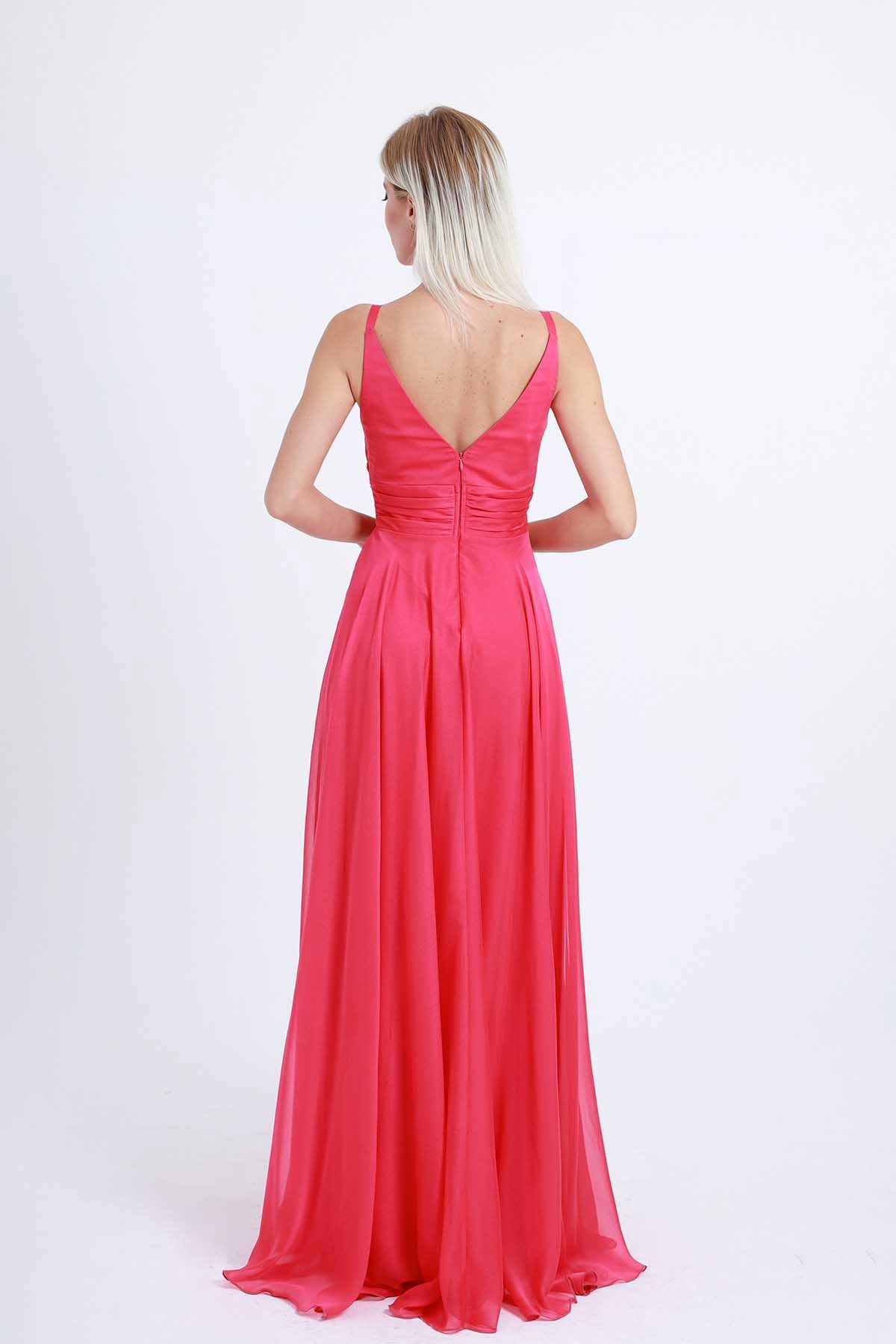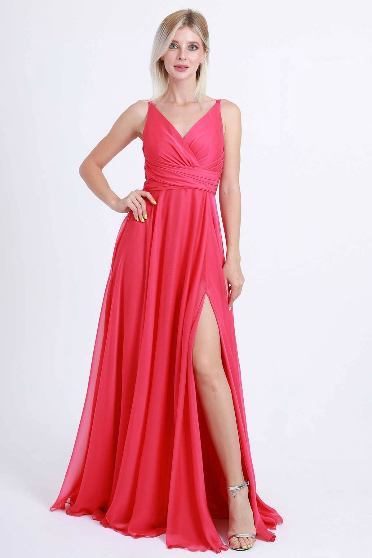 Detay: Ön-arka V yaka, derin yırtmaçlı, astarlı abiye elbise;