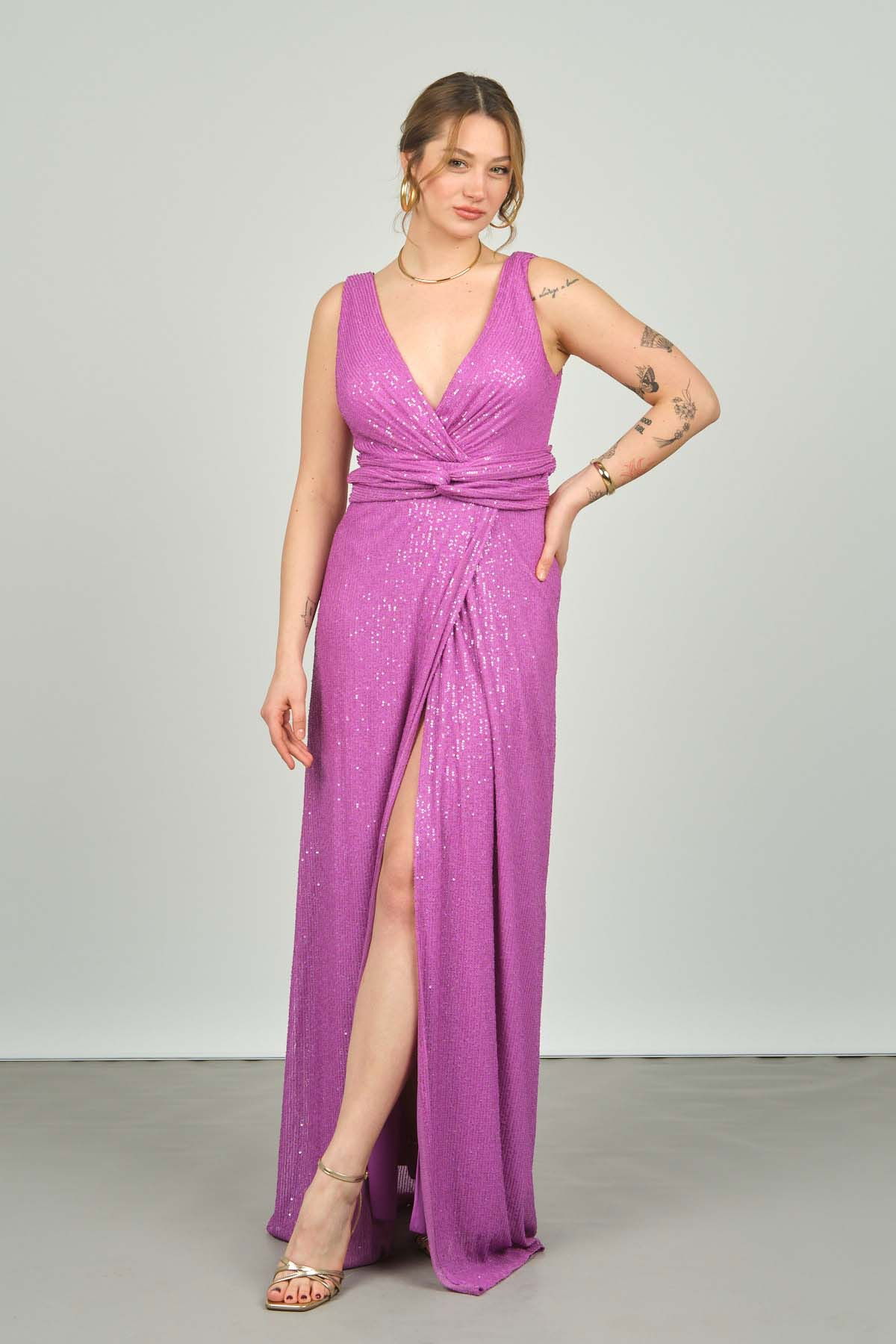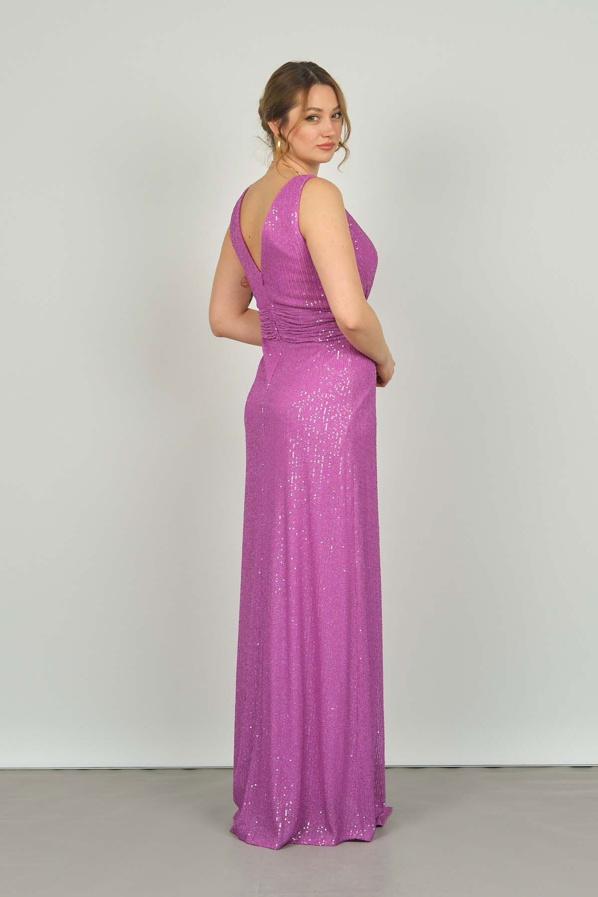 Detay: Derin V yaka, pullu, uzun, astarlı abiye elbise ;
