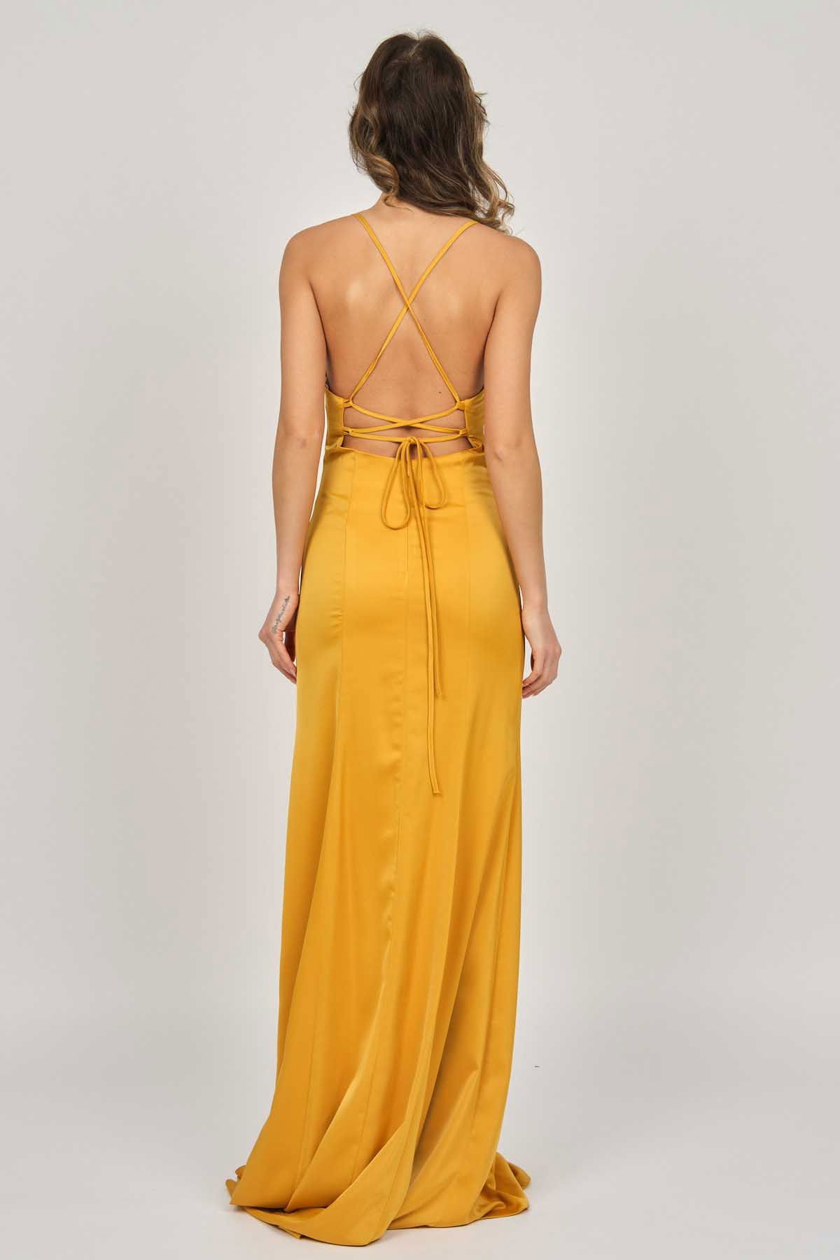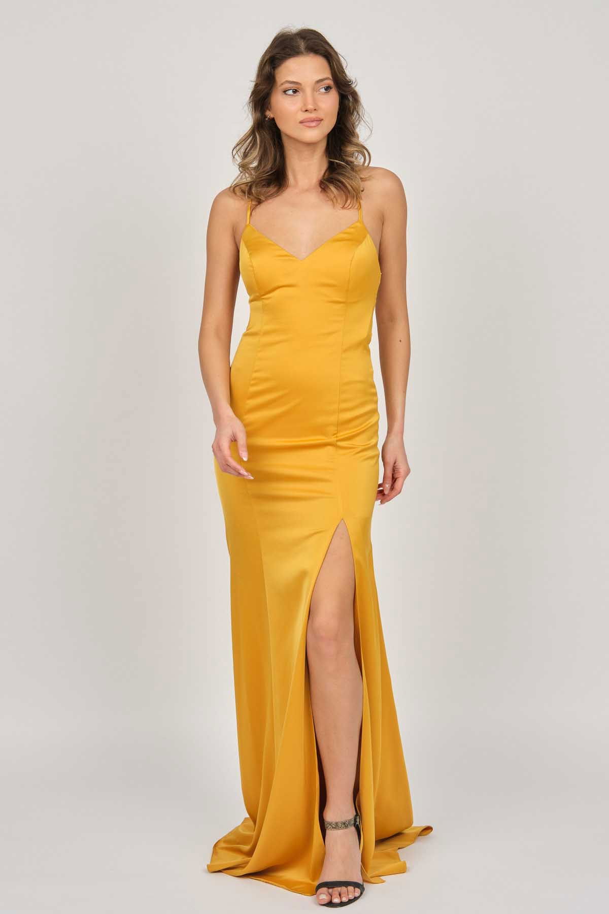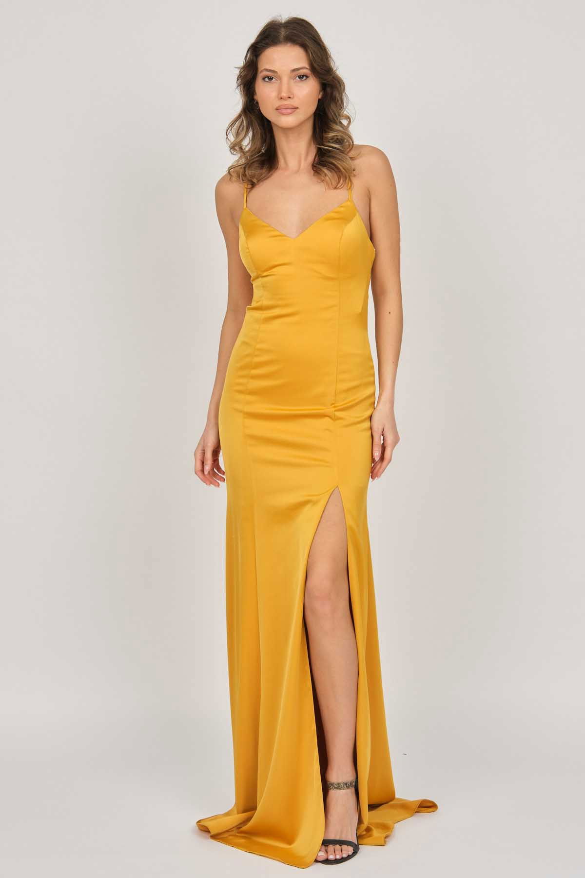 Detay: Derin yırtmaçlı, arka kısmı dekolte, uzun abiye elbise;