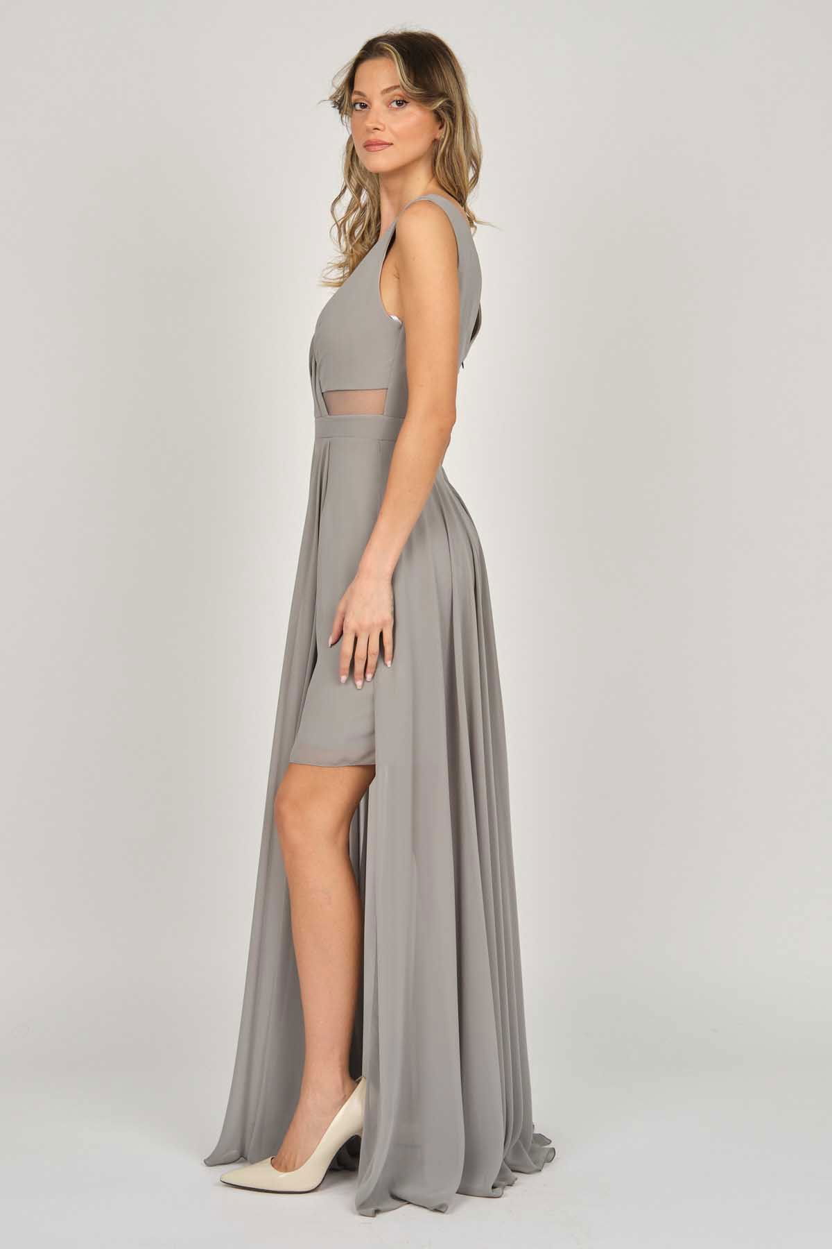 Detay: Kolsuz, iç etek mini, üst etek uzun, astarlı abiye elbise;