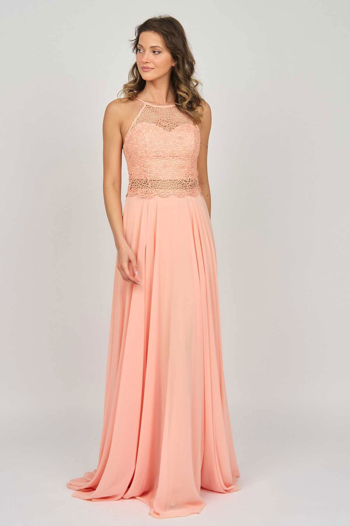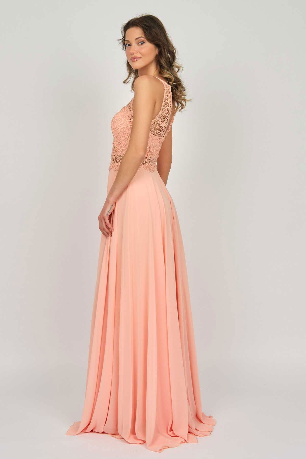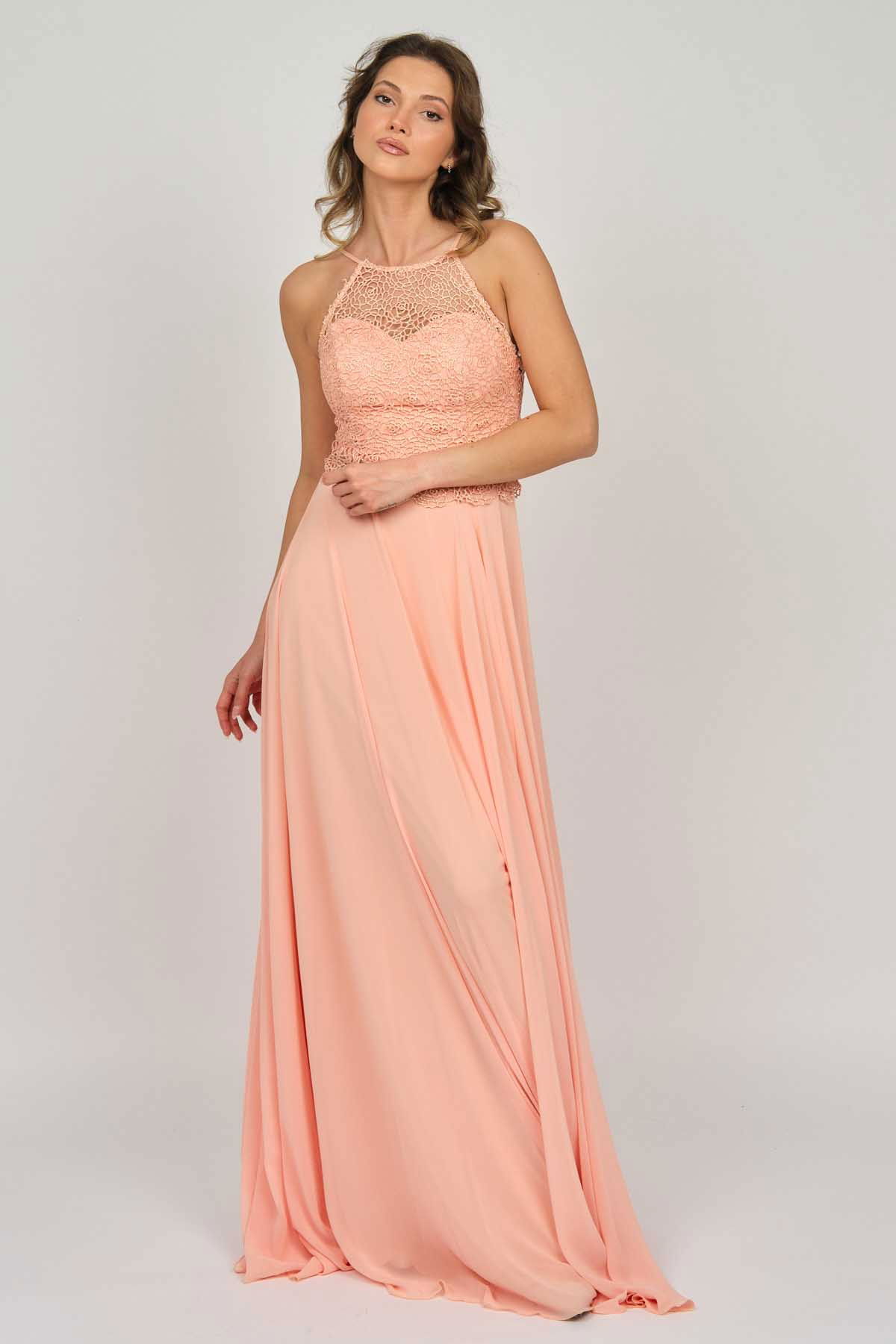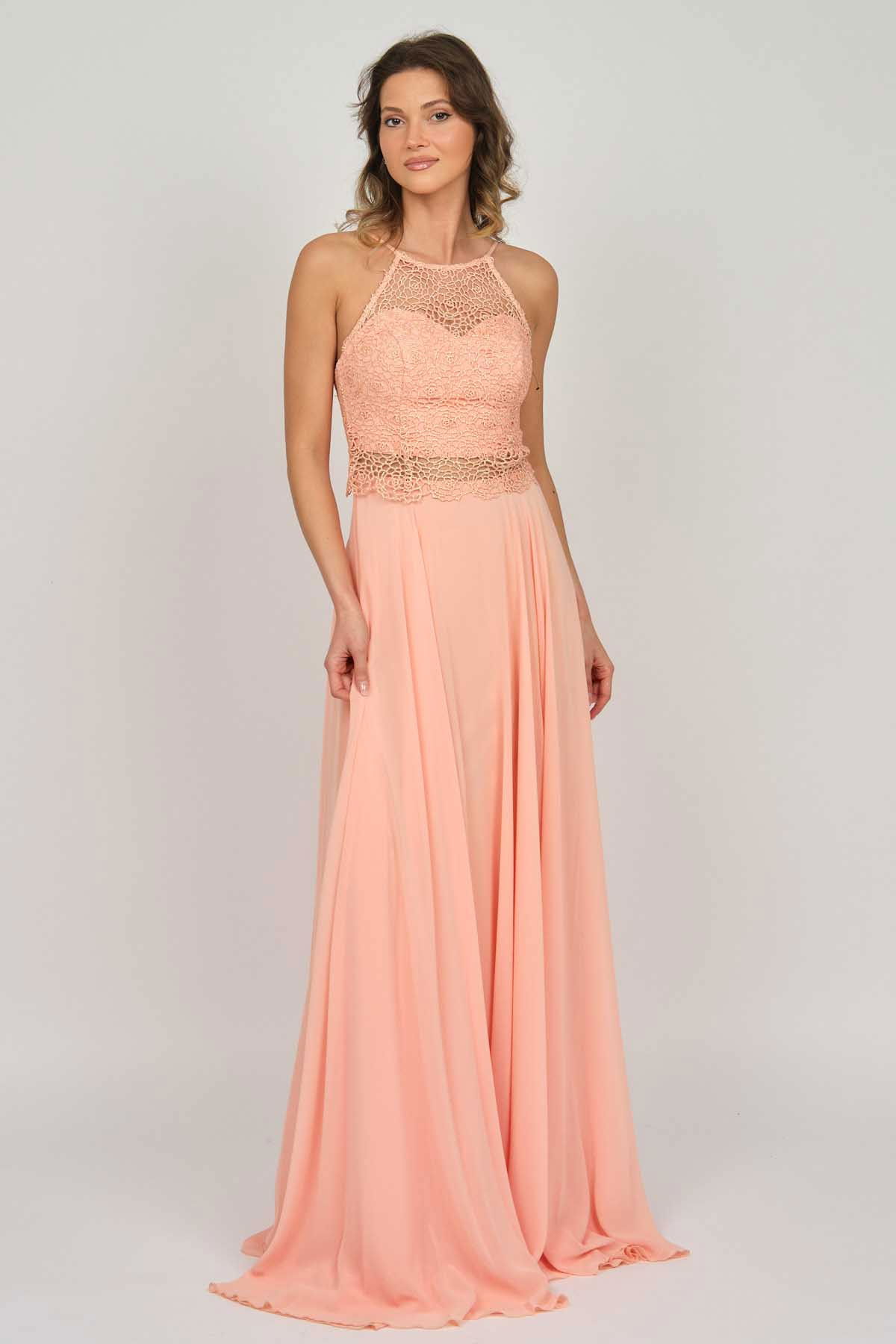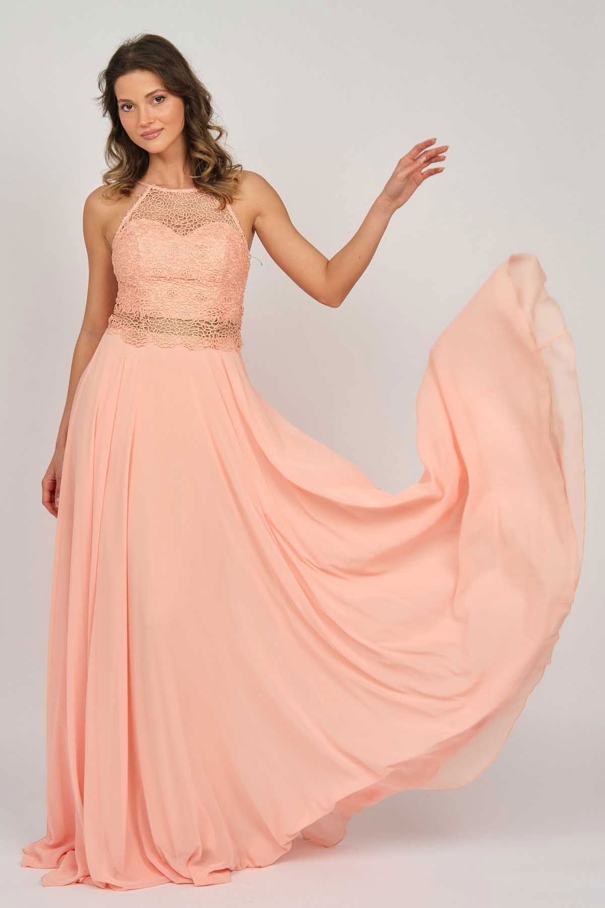 Detay: Üst kısım dantel, alt kısım şifon, uzun abiye elbise;