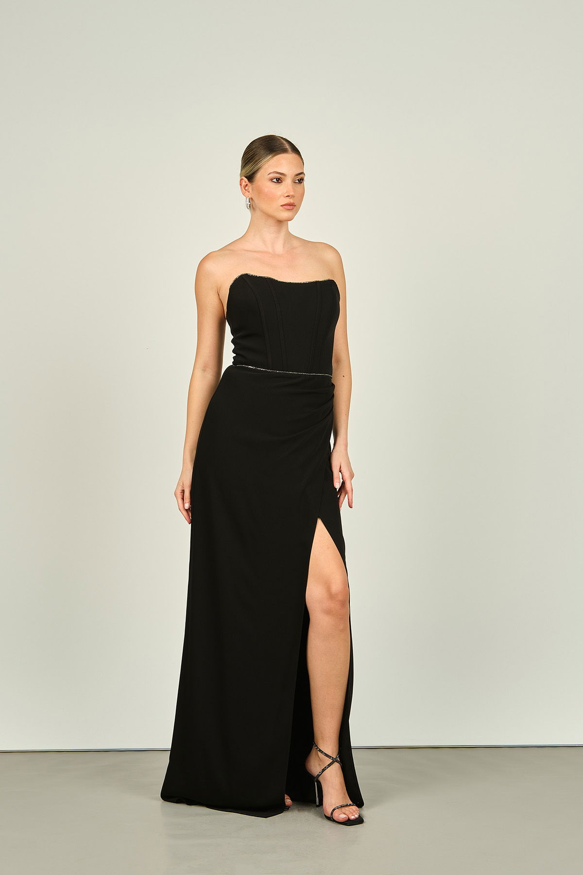 Doridorca Kadın Straplez Beli Korsajlı Balık Form Abiye Elbise 6087 Siyah