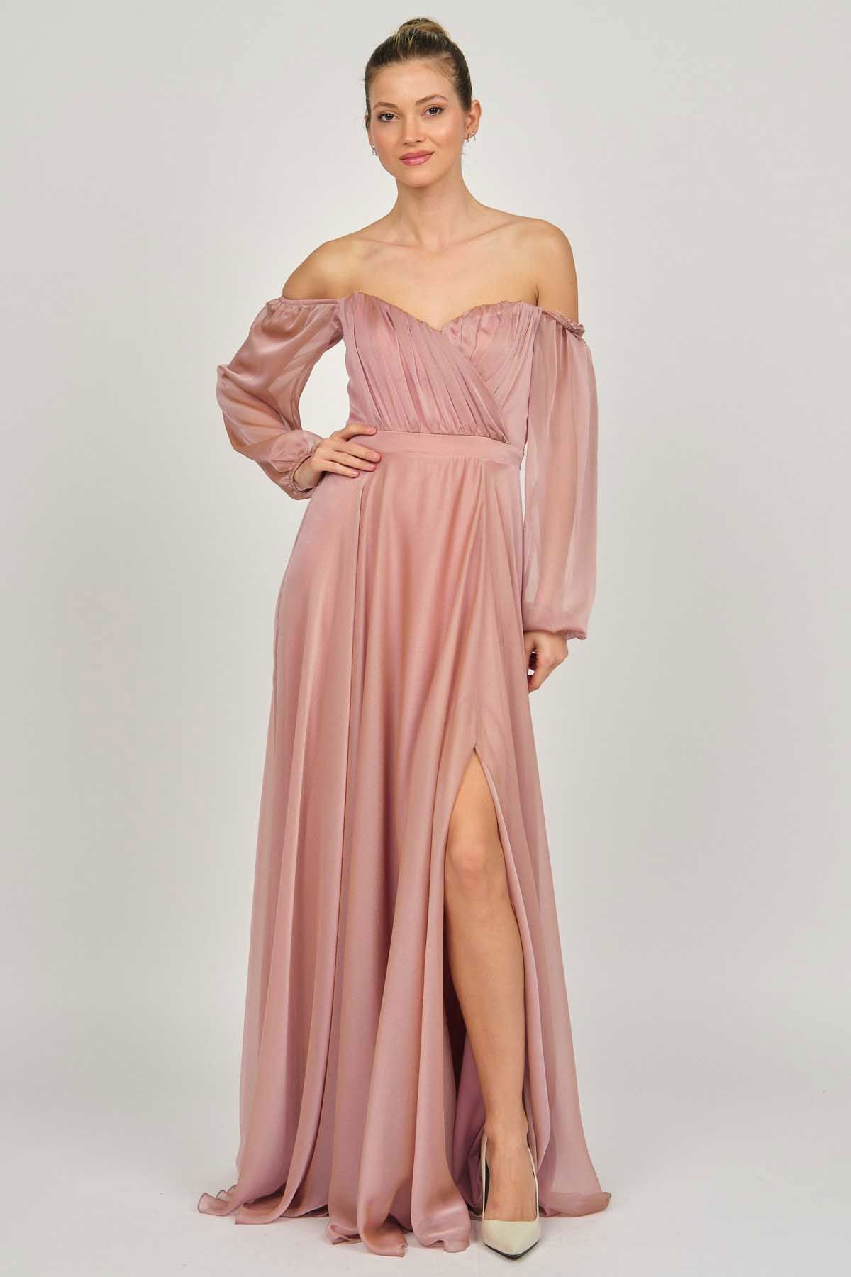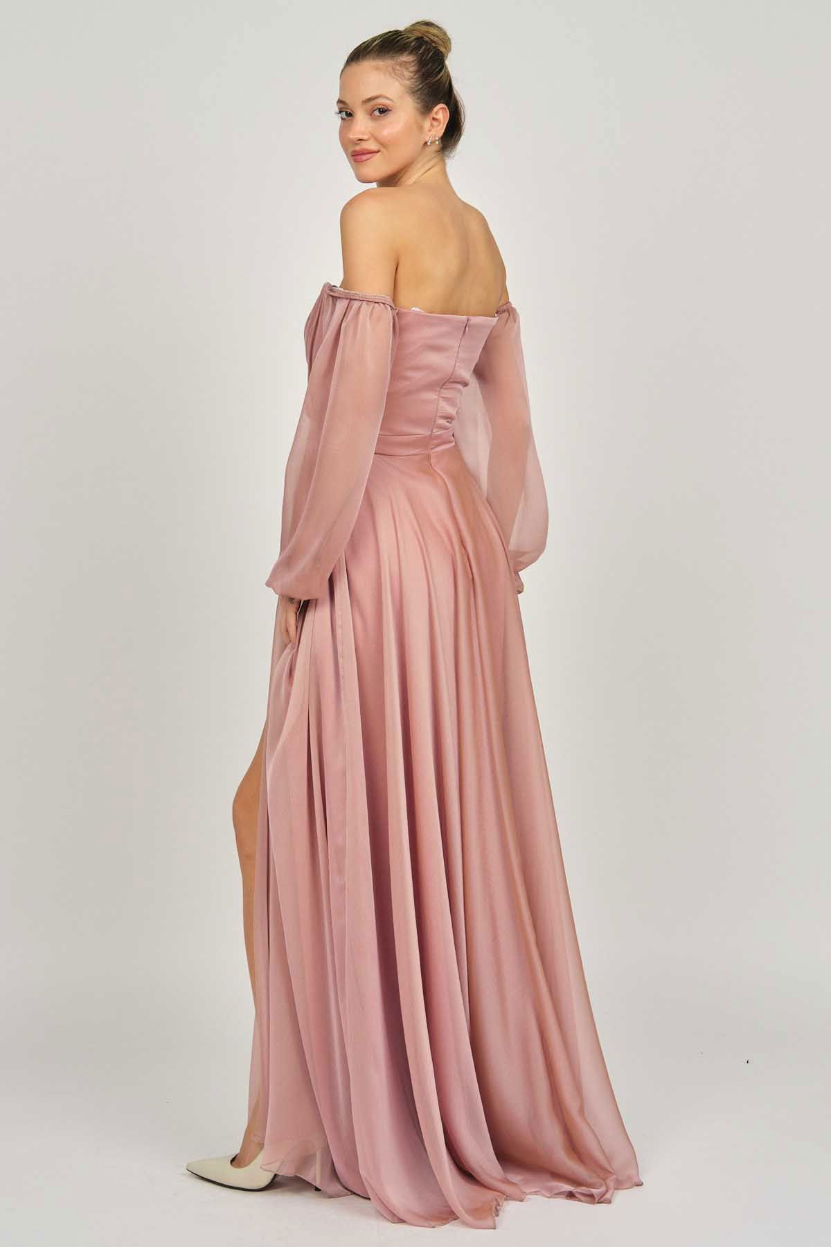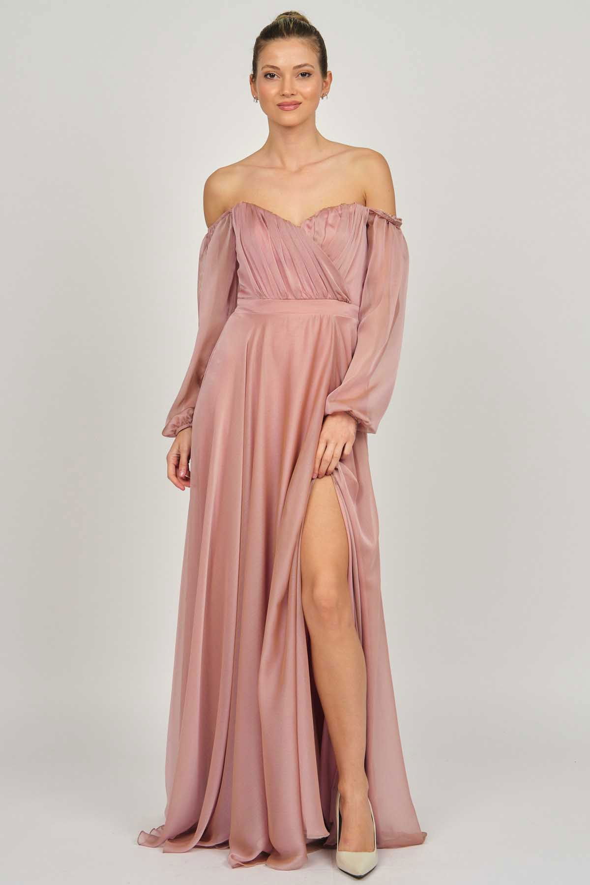 Detay: Straplez kollu, kloş, astarlı abiye elbise;