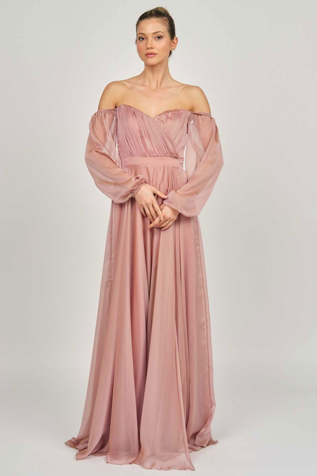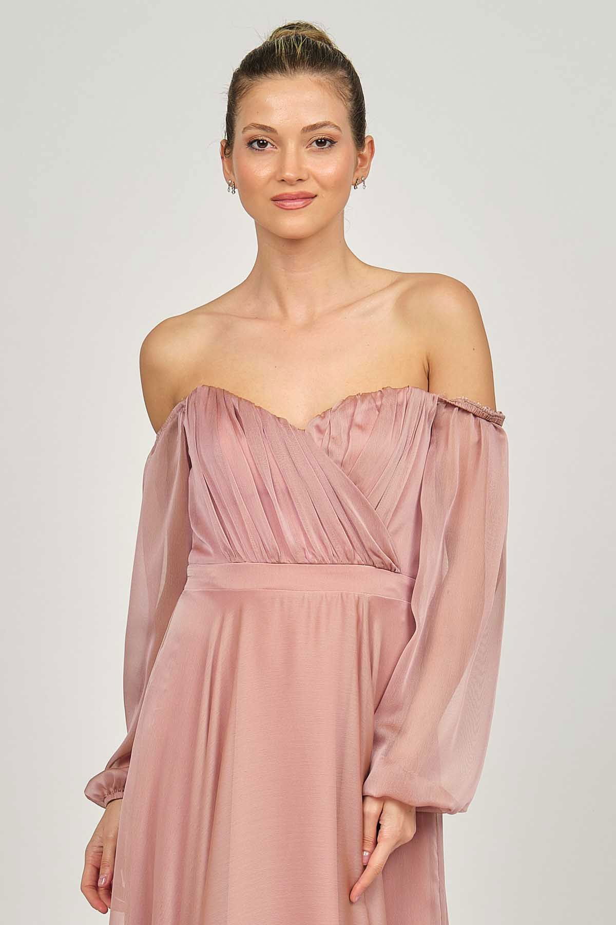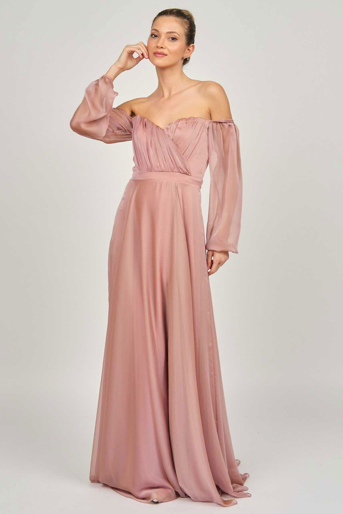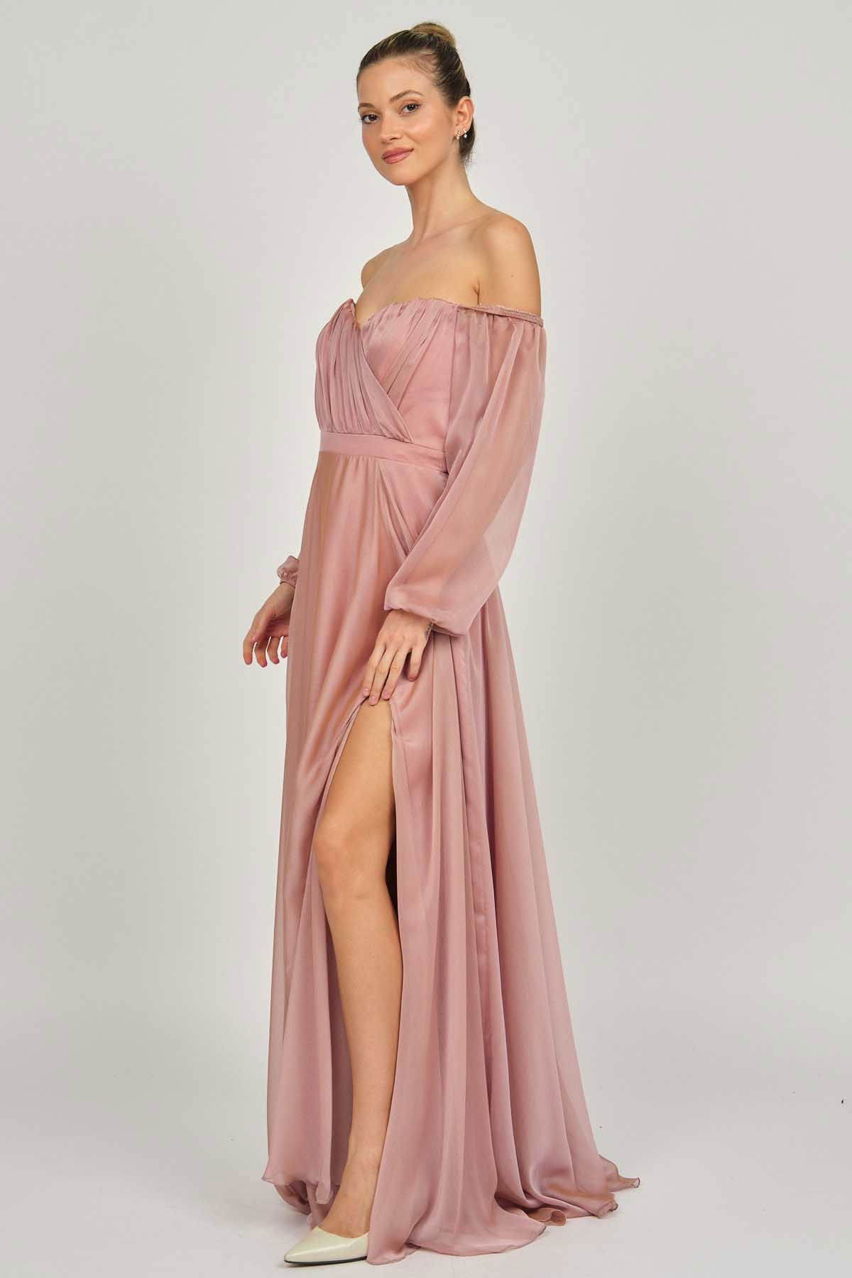 Detay: Straplez kollu, kloş, astarlı abiye elbise;