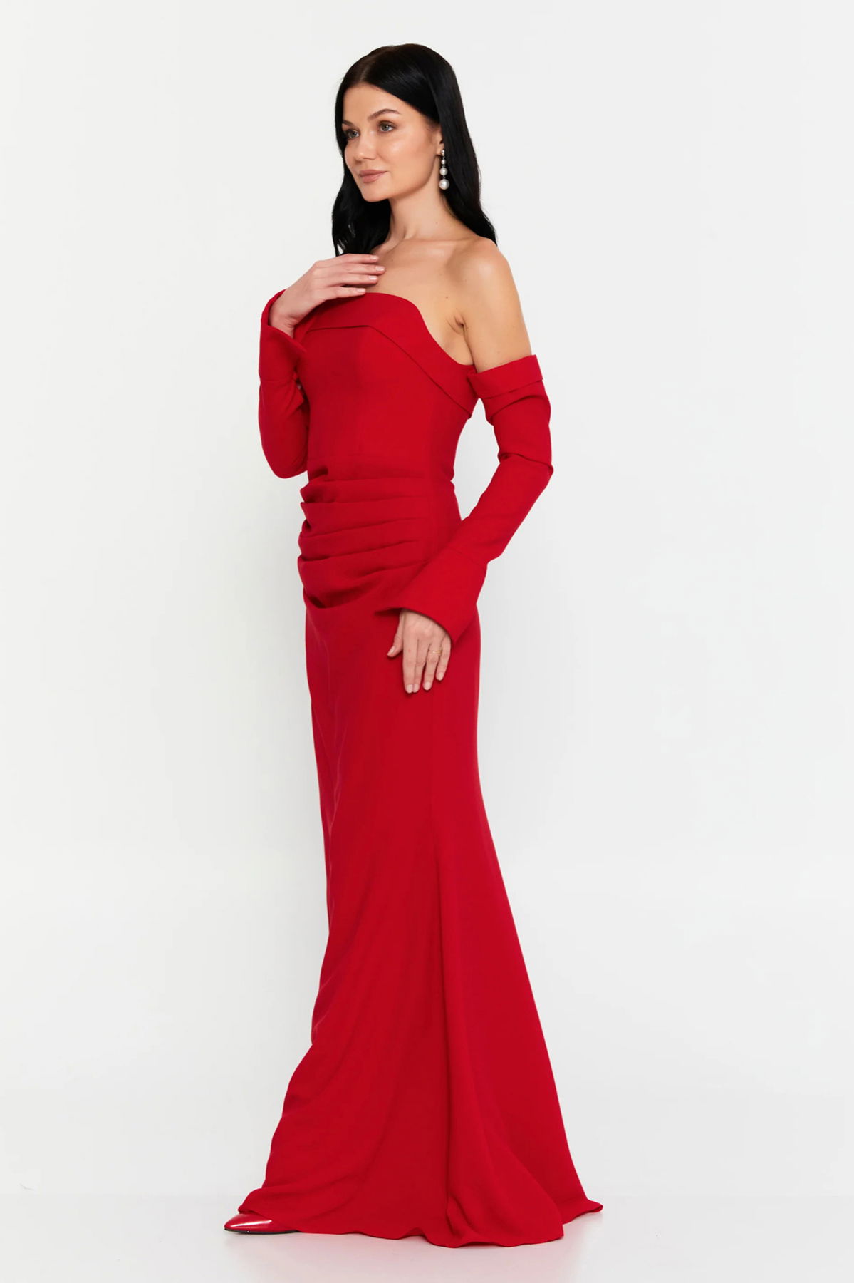 Doridorca Kadın Straplez Seyyar Eldivenli Uzun Abiye Elbise 7145 Kırmızı