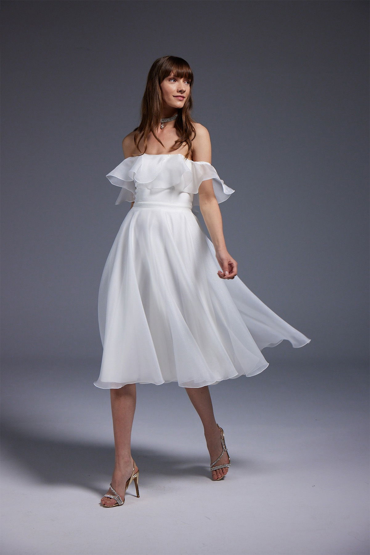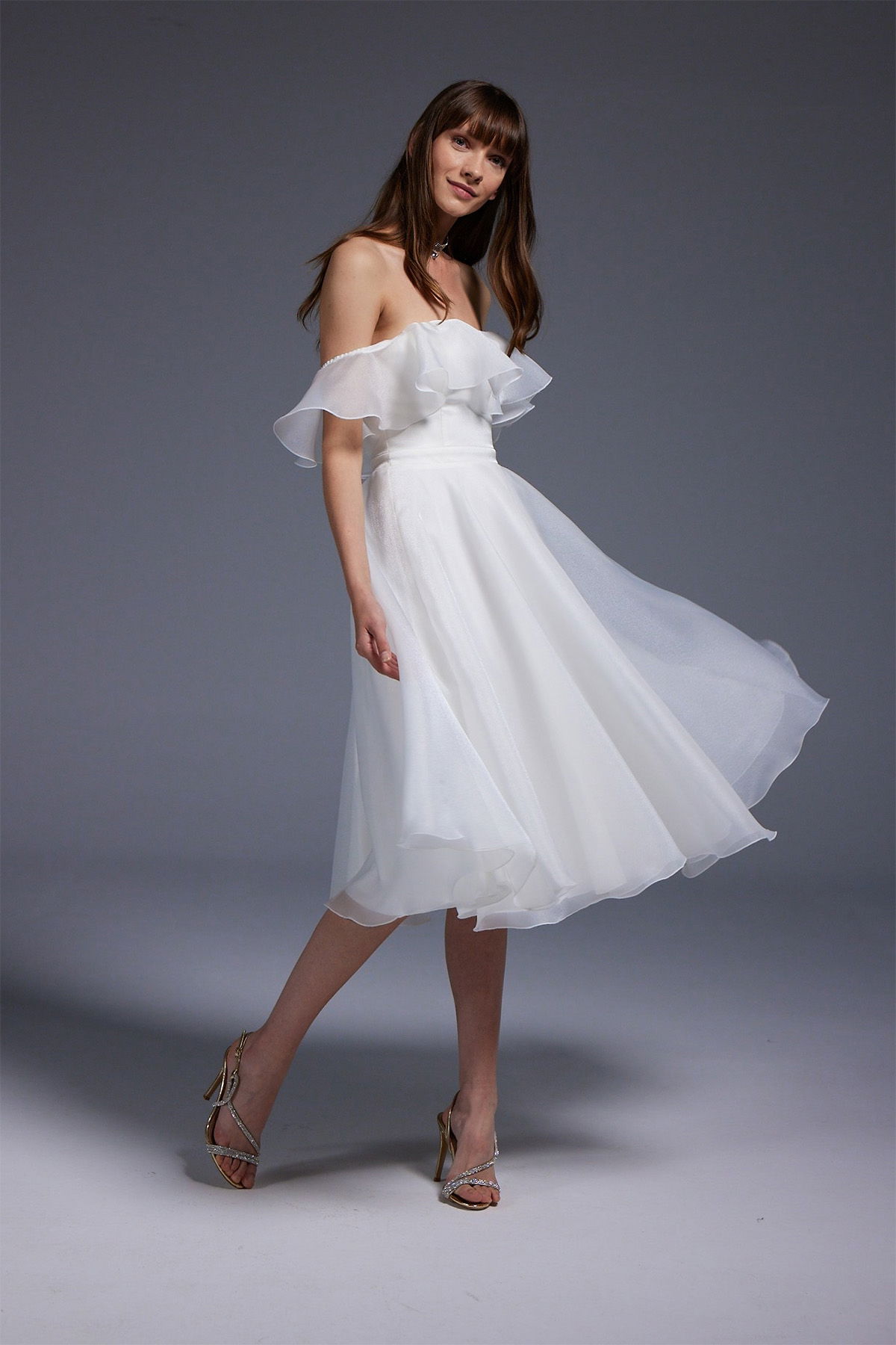 Detay: Straplez yaka, tül detaylı, düşük omuz, midi abiye elbise;