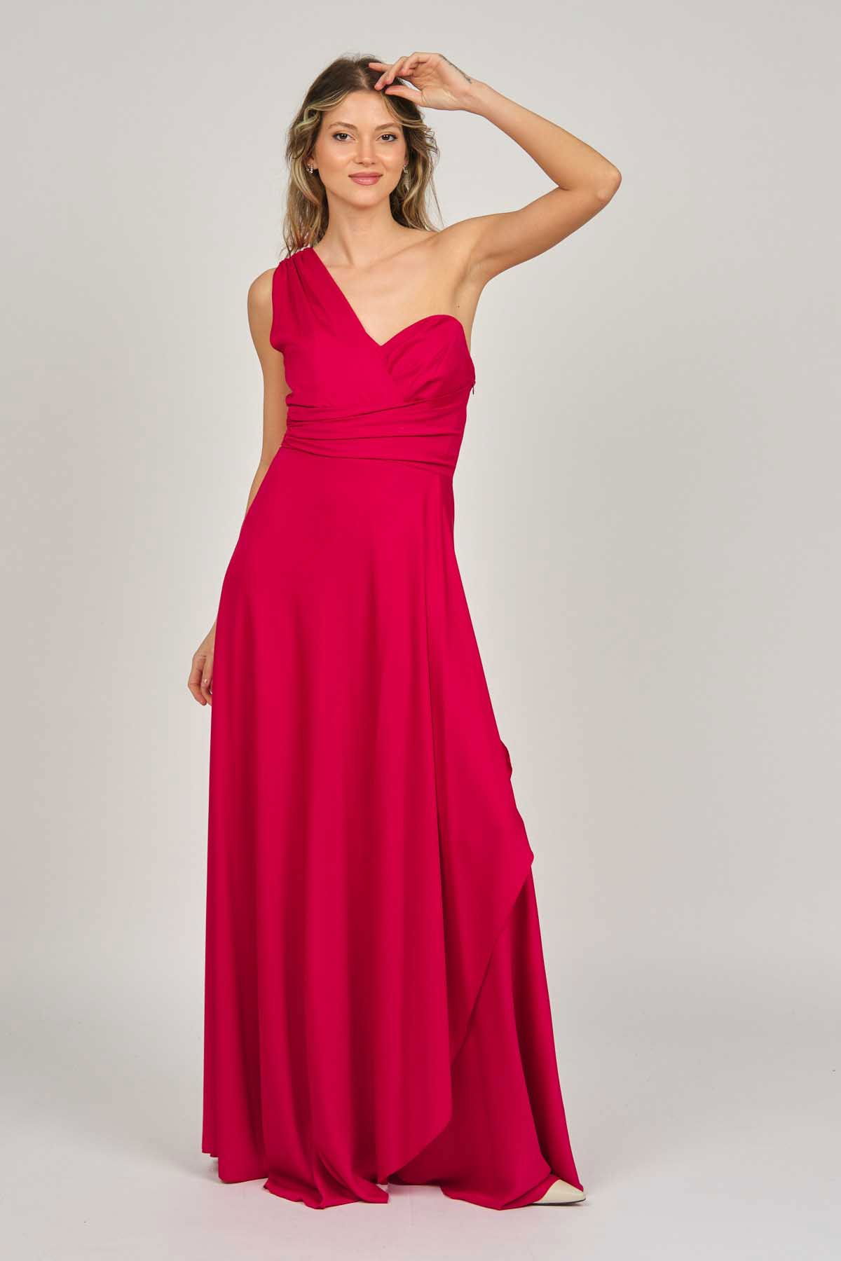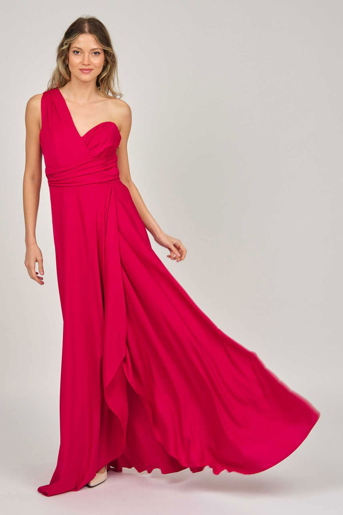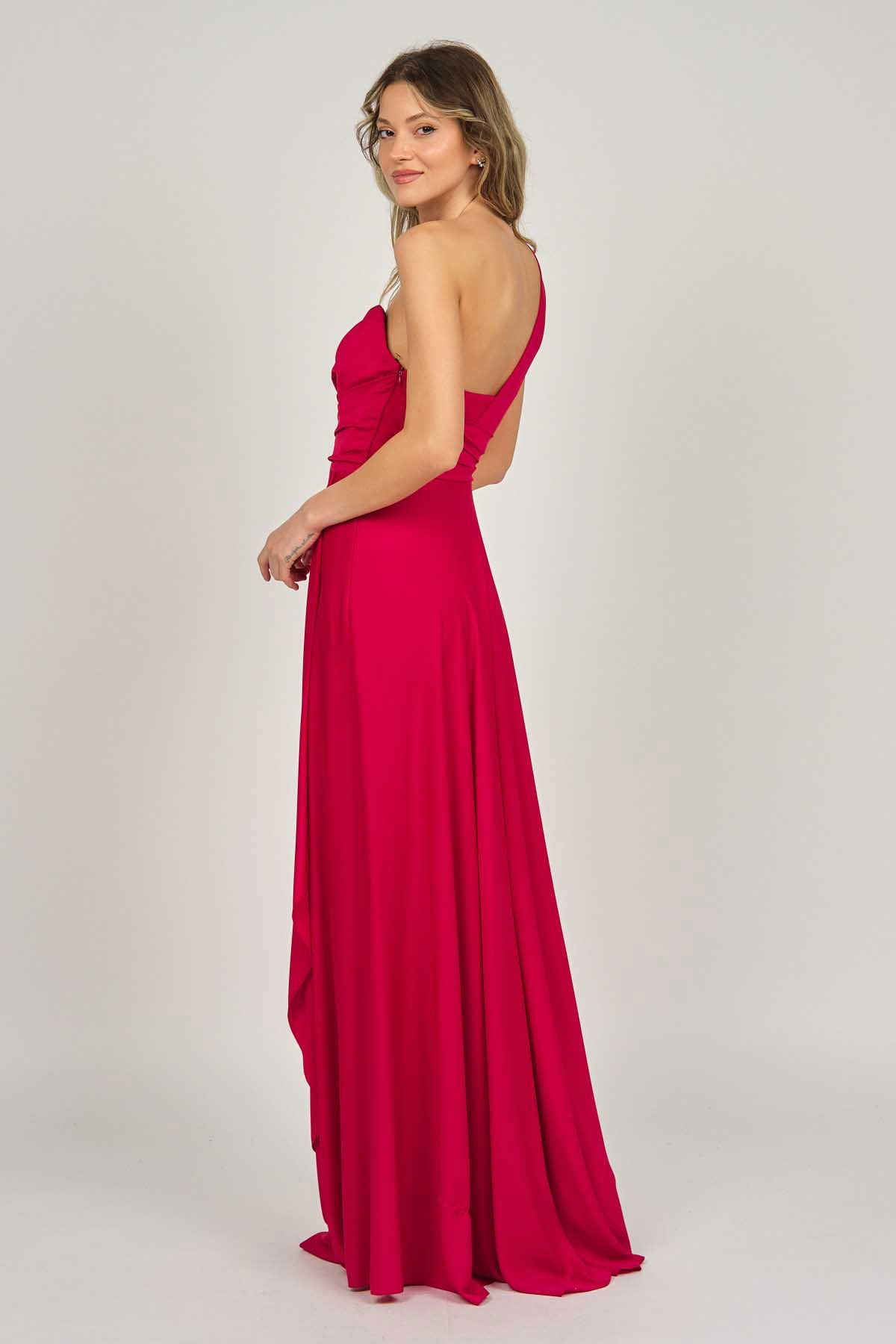 Detay: Tek omuz, anvelop, kloş, astarlı abiye elbise;