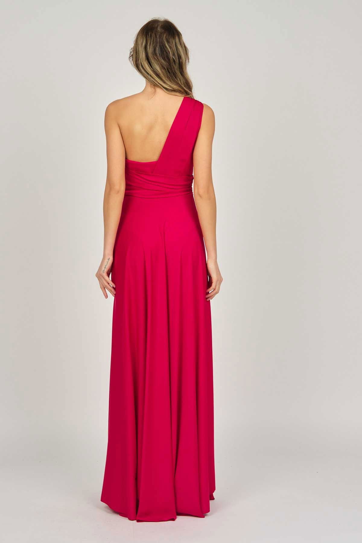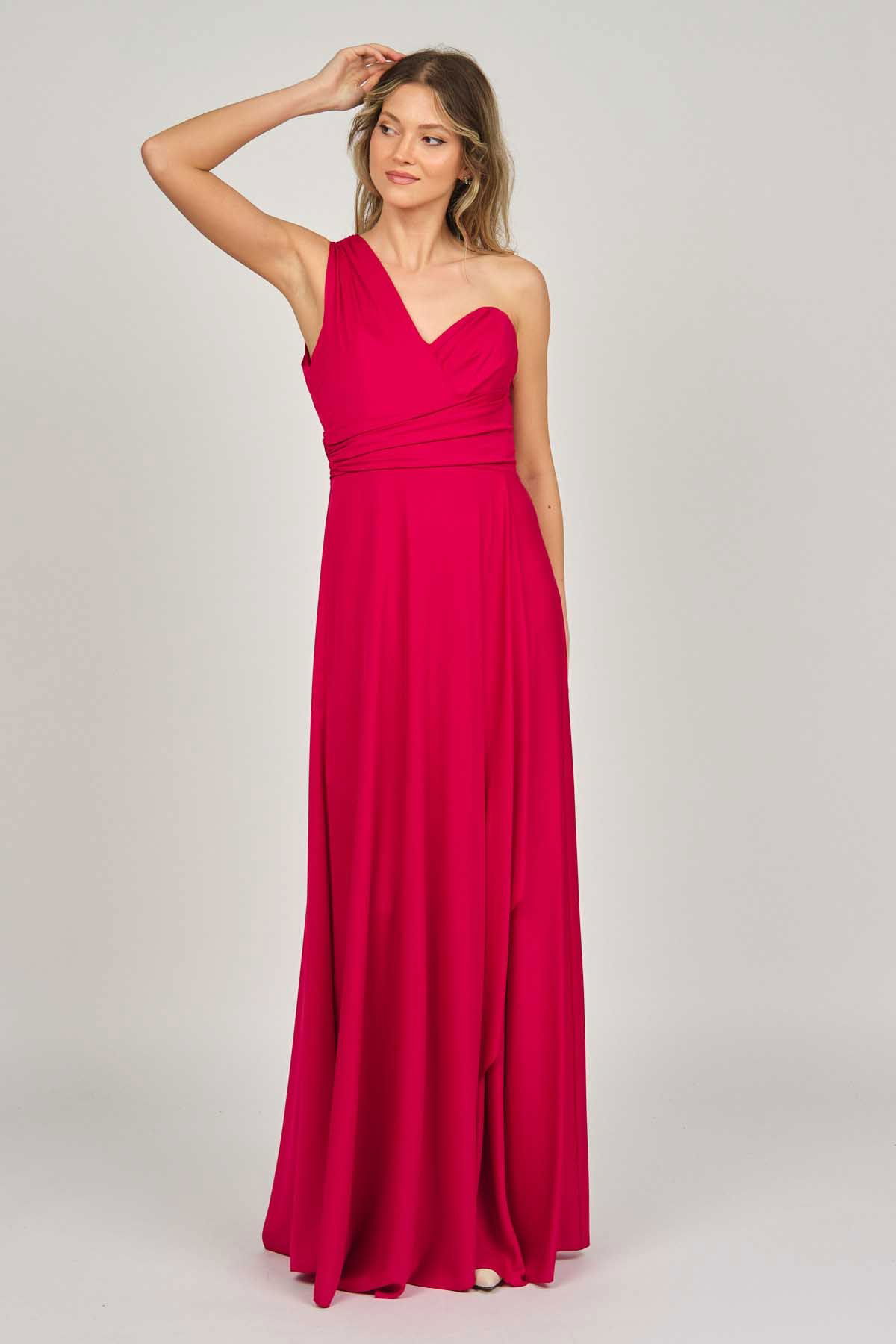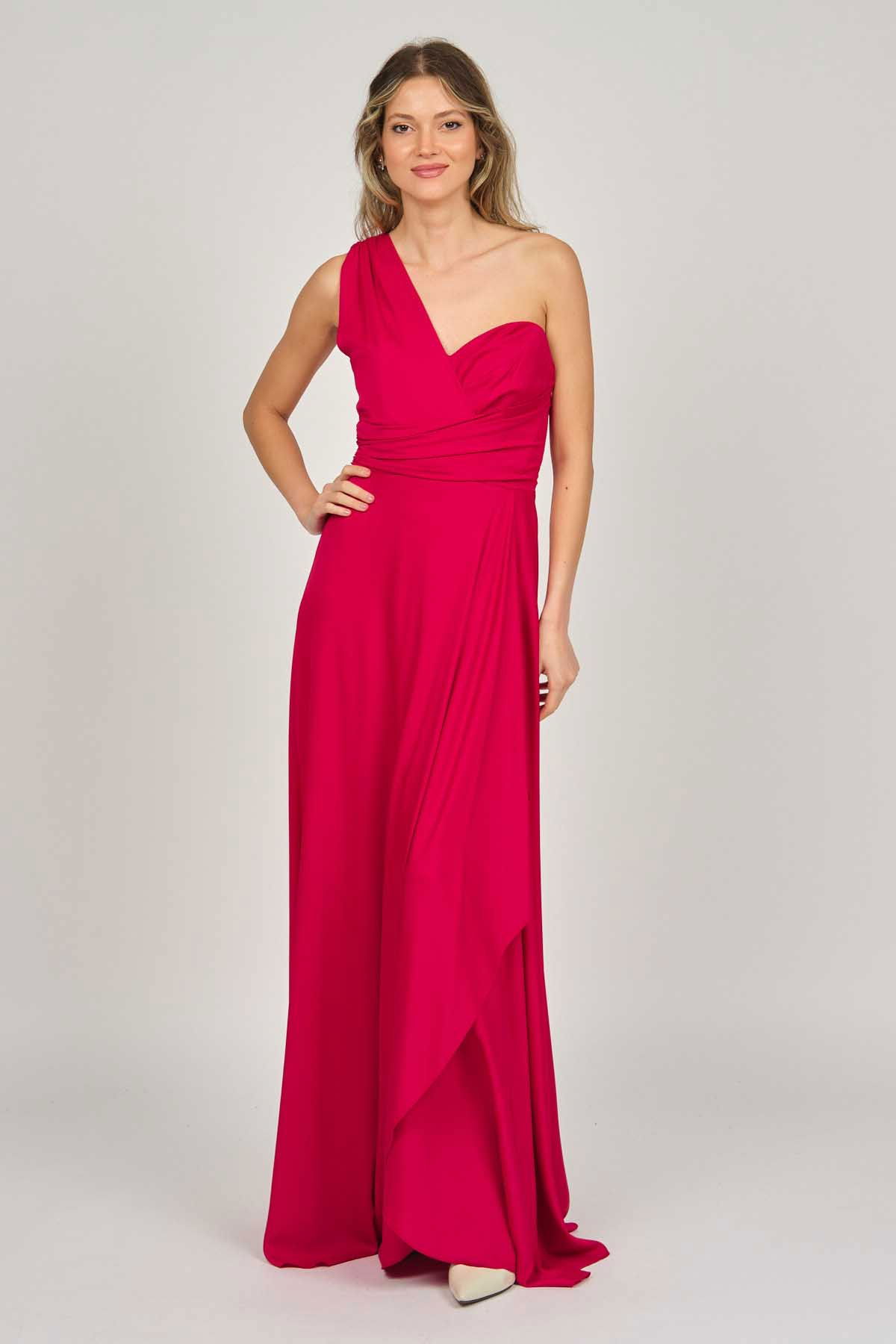 Detay: Tek omuz, anvelop, kloş, astarlı abiye elbise;