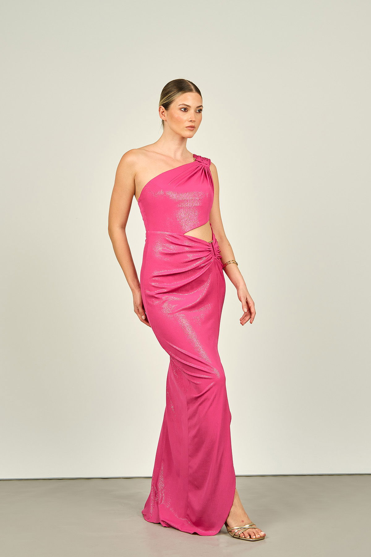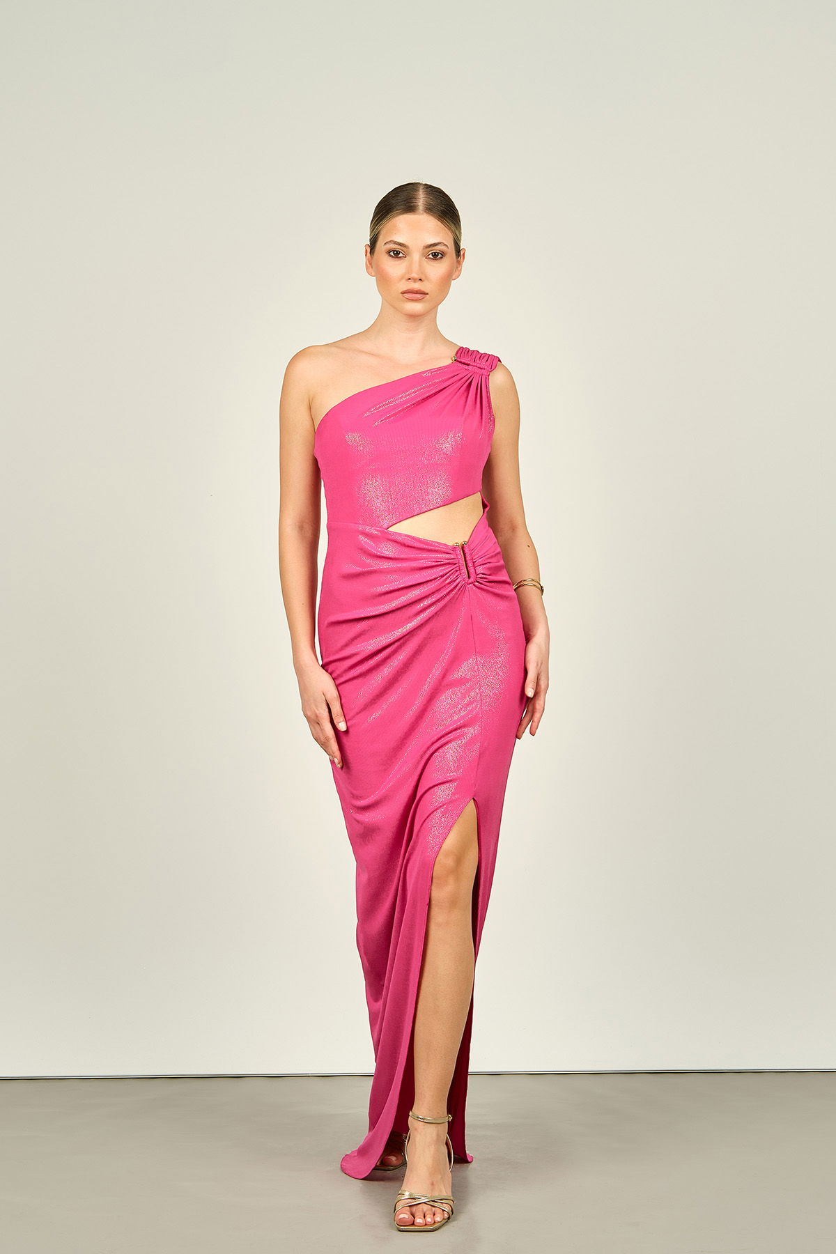 Detay: Tek omuz, belde demir tokalı, beli drapeli, derin yırtmaçlı, parlak kumaş, astarlı, uzun abiye elbise;