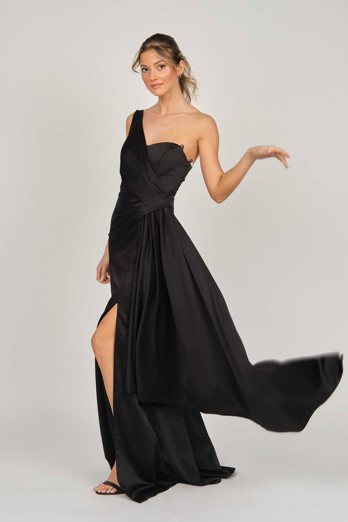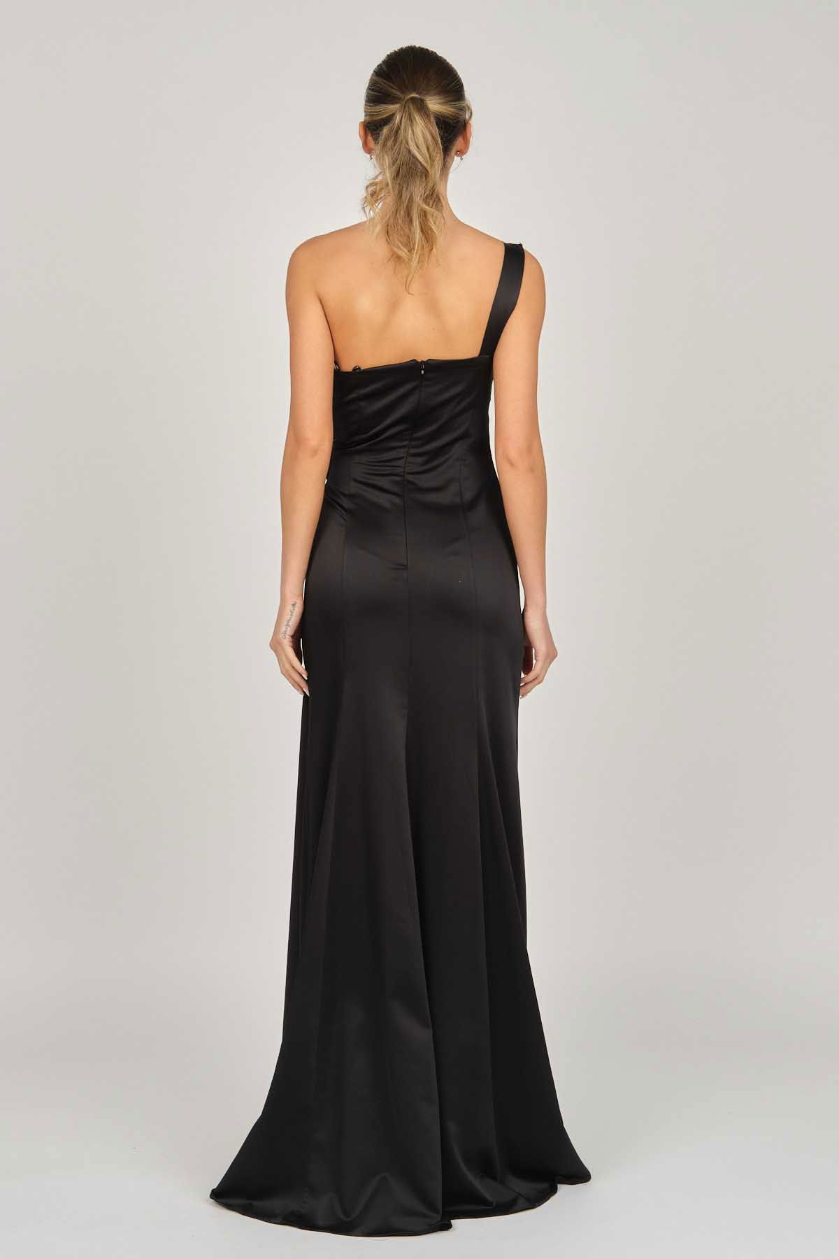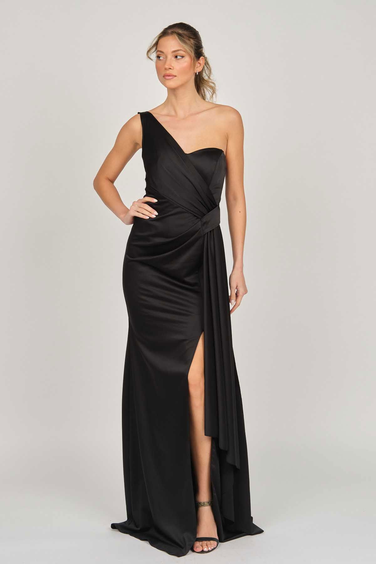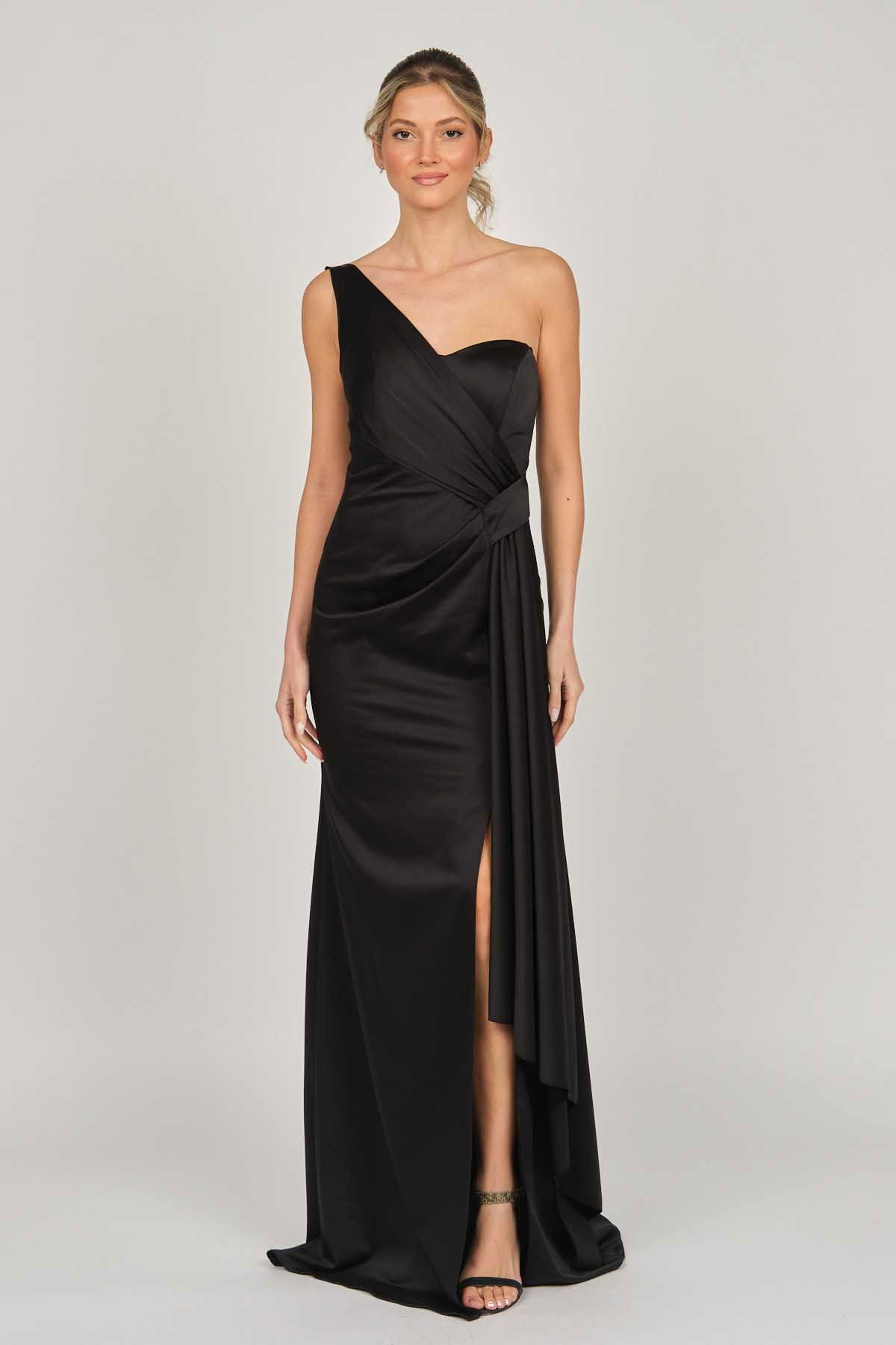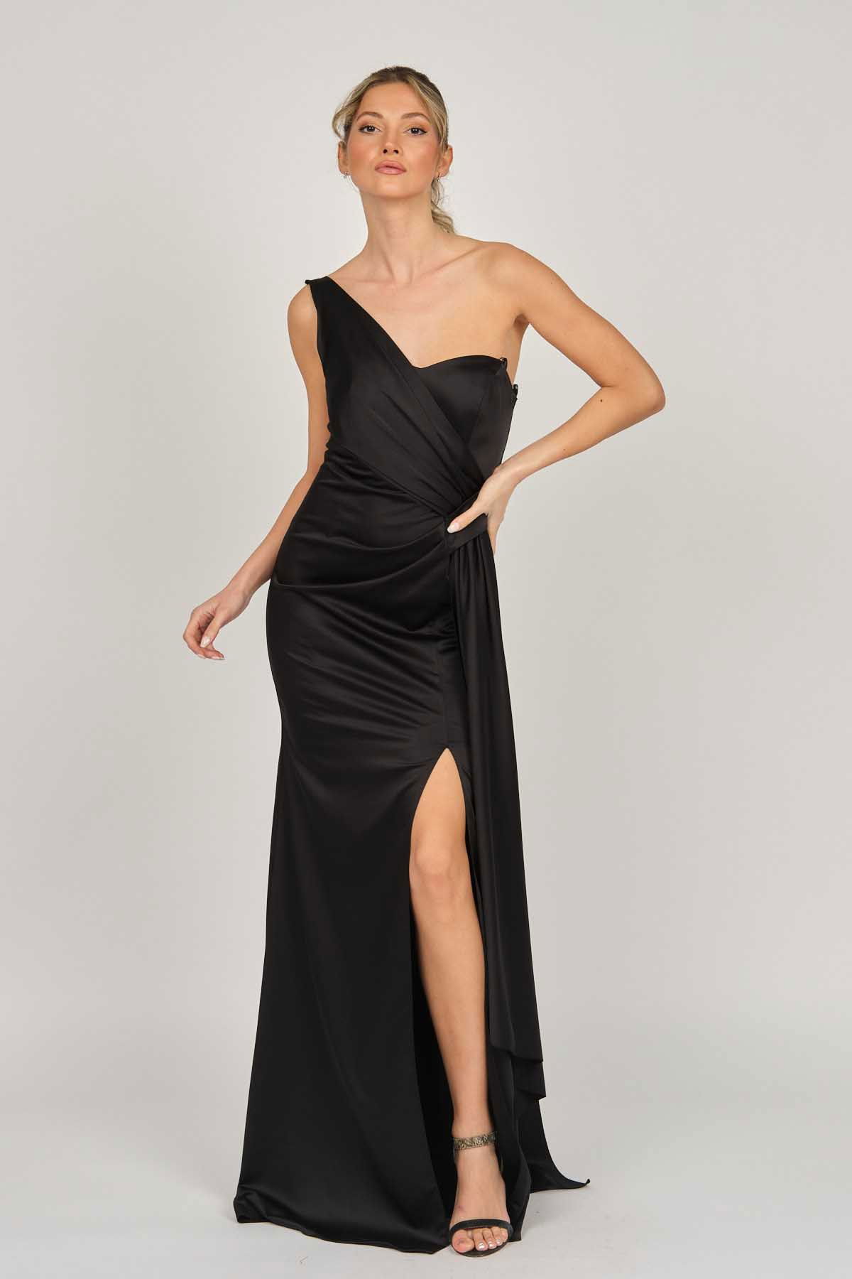 Detay: Tek omuz, derin yırtmaçlı, astarlı abiye elbise;