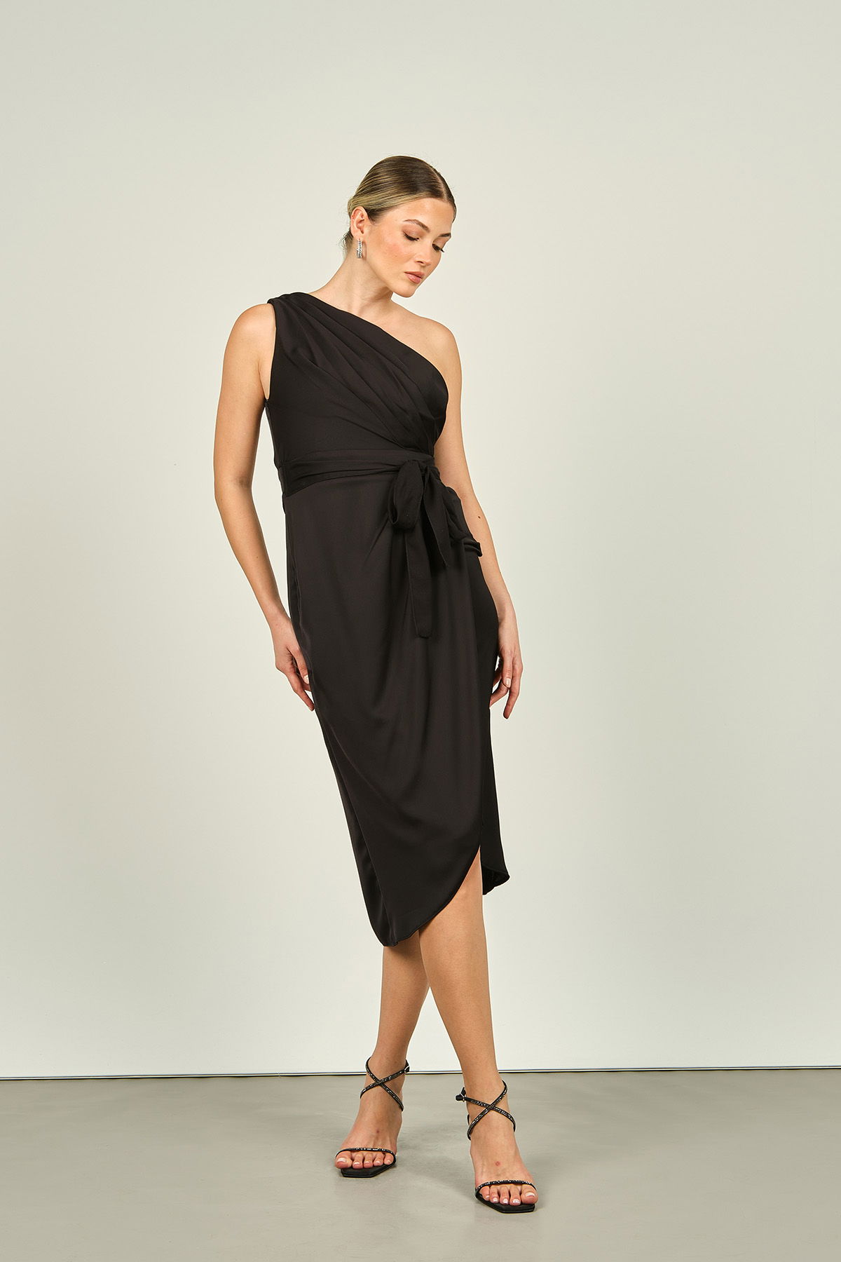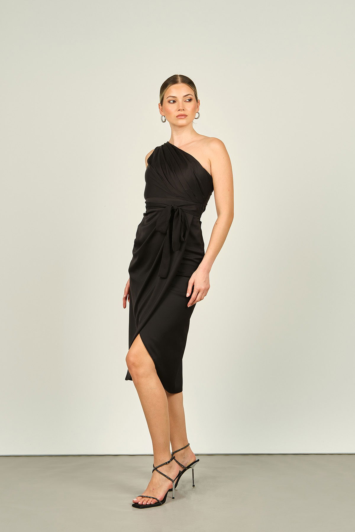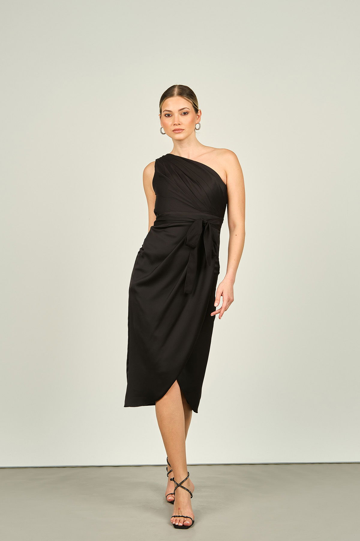 Doridorca Kadın Tek Omuz Saten Midi Abiye Elbise 5081 Siyah