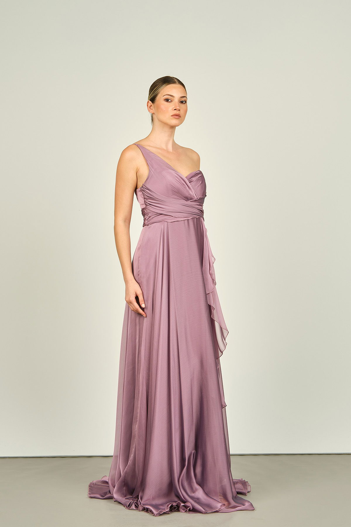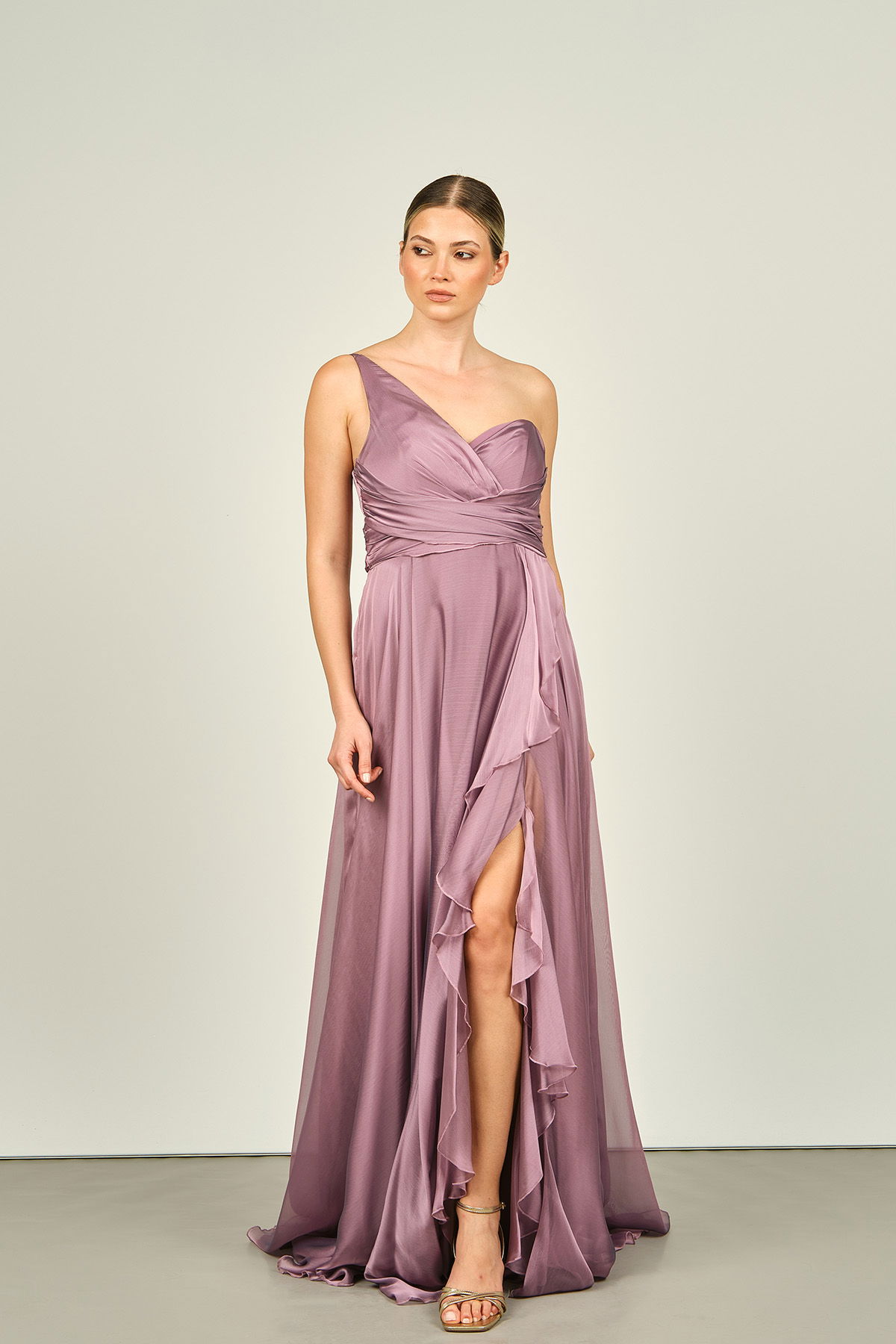 Detay: Tek omuz, fırfırlı, astarlı, uzun abiye elbise;