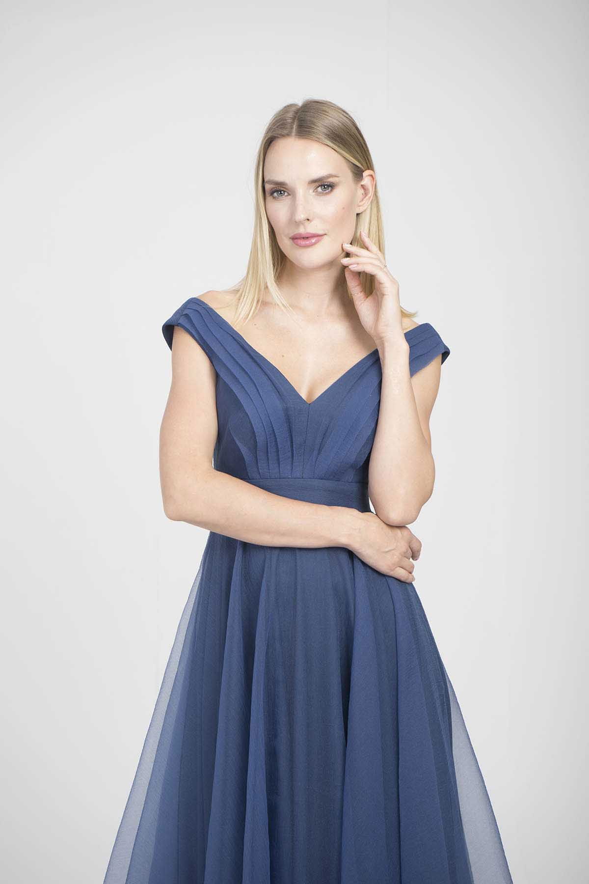 Detay: Derin yaka, kloş, uzun, astarlı abiye elbise;