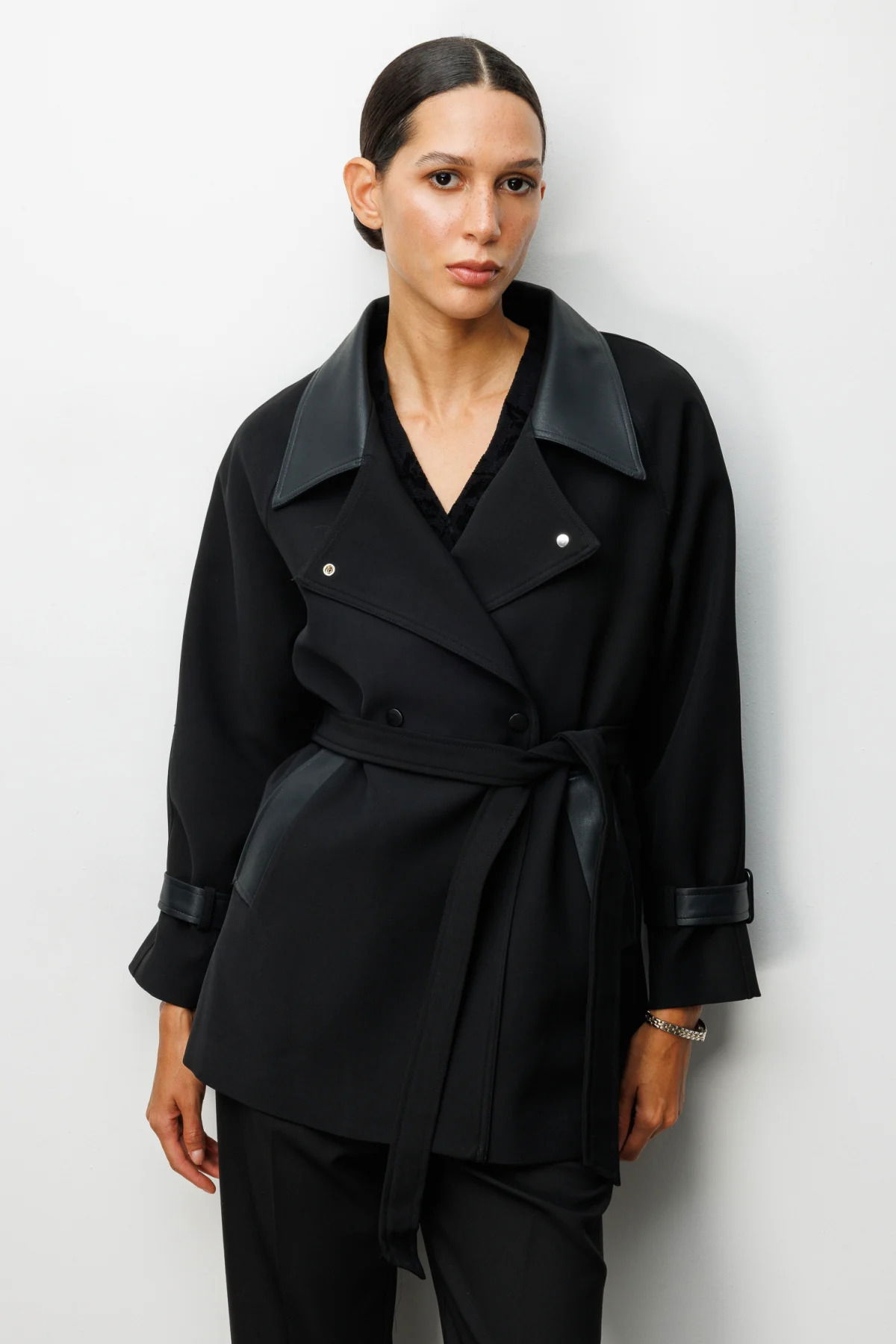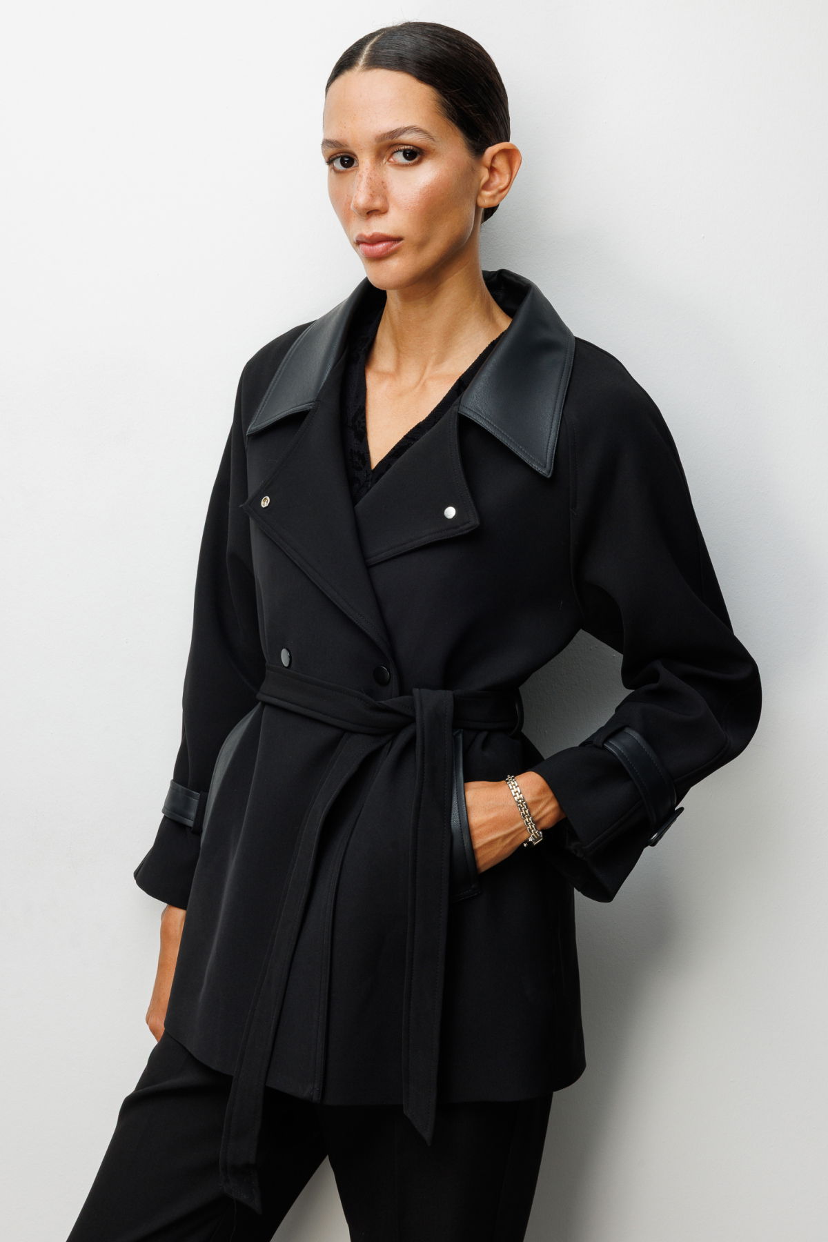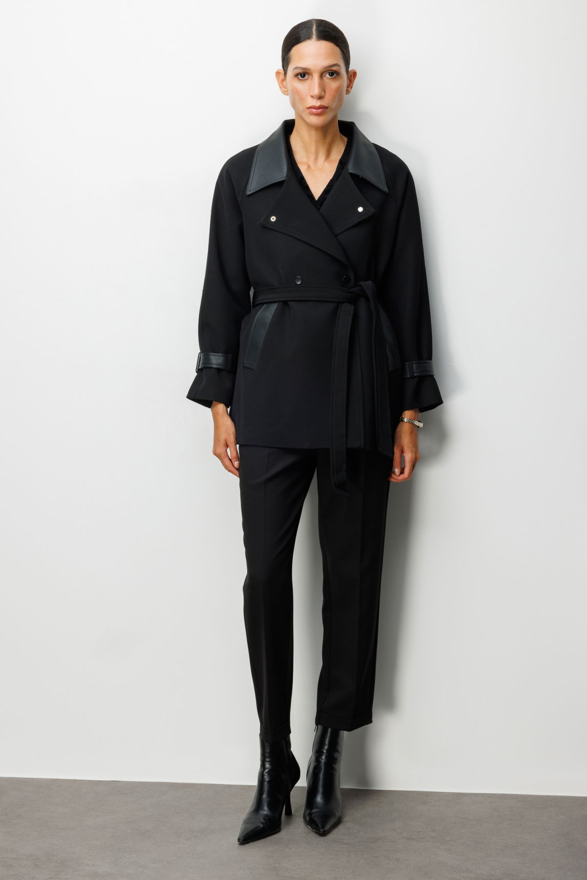 Detay: Dokuma kumaştan üretilen, astarlı yapısıyla konfor sağlayan kruvaze yaka trençkot zarif bir duruş sergiler. Uzun kollu tasarımı ve çıt çıt kapama detayıyla modern bir görünüm sunarken, kuşaklı bel hattı silueti daha feminen hale getirir. Yan cepleriyle fonksiyonelliği artıran bu trençkot, hem günlük şehir stilinde hem de özel kombinlerde şıklığıyla öne çıkan vazgeçilmez bir parçadır;