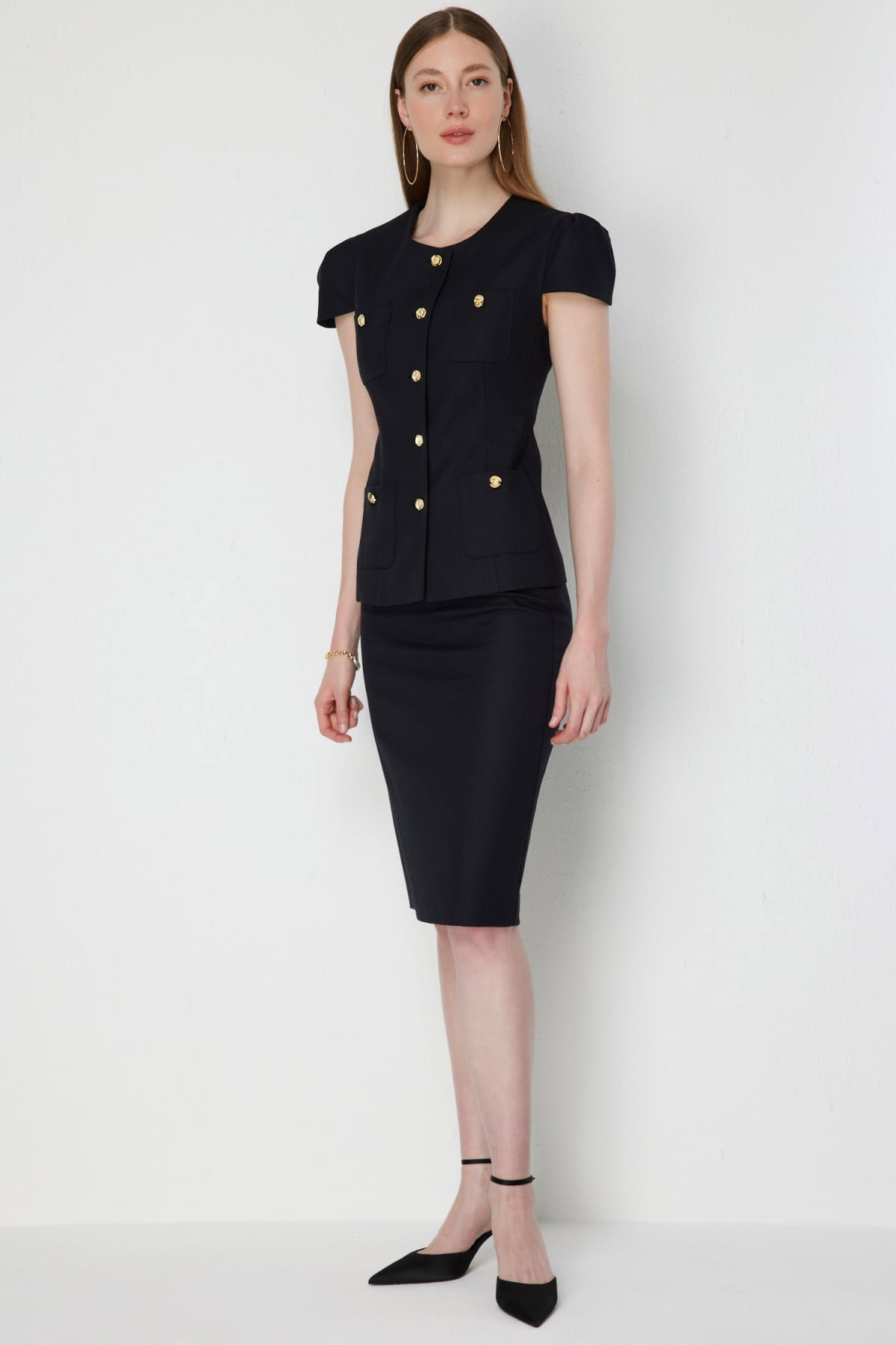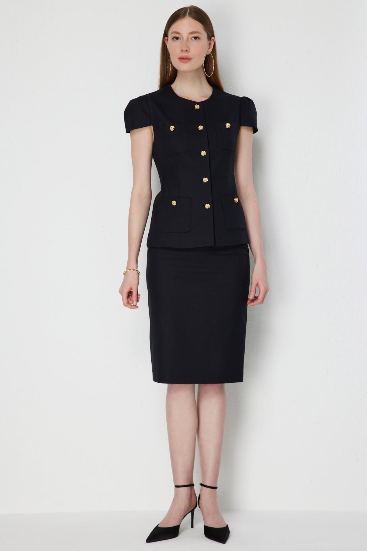 Detay: Dokuma kumaş, astarlı ve fermuarlı kapama detayıyla tasarlanan bu etek modern bir şıklık sunuyor. Astarlı yapısı sayesinde konforlu bir kullanım sağlarken, fermuar detayı pratiklik ve zarif bir görünüm kazandırıyor. Dokuma kumaşın kaliteli duruşu ile birleşen bu tasarım, günlük kombinlerden özel davetlere kadar çok yönlü bir tercih haline geliyor;