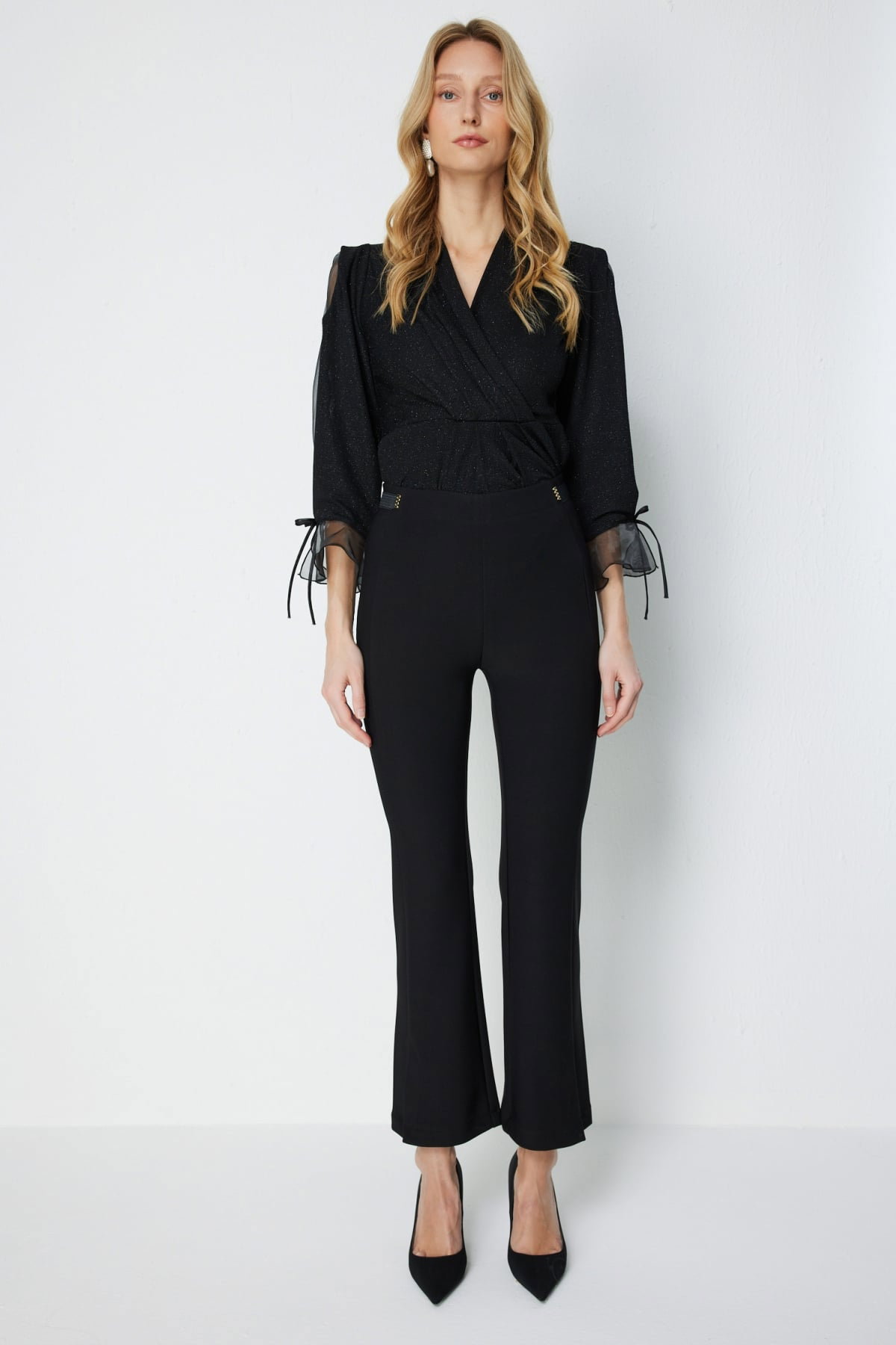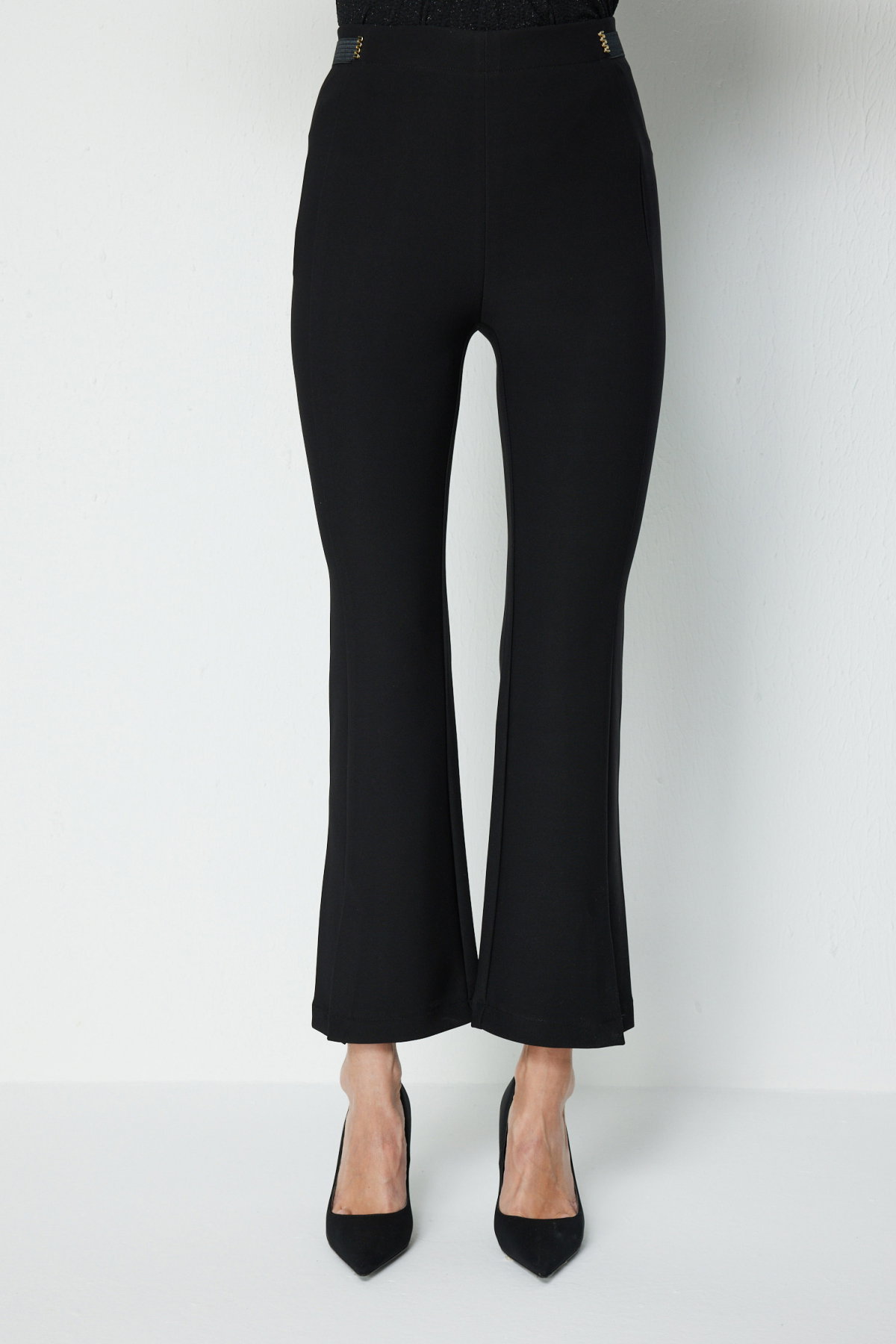 Detay: Lastikli bel formunda, İspanyol paça kesimli, cepsiz, dokuma kumaştan ve astarsız bu pantolon zarif bir tasarıma sahiptir. Lastikli bel rahat bir kullanım sağlarken İspanyol paça kesimi feminen ve şık bir görünüm kazandırır. Cepsiz yapısı ise sade ve modern bir duruş sunar;