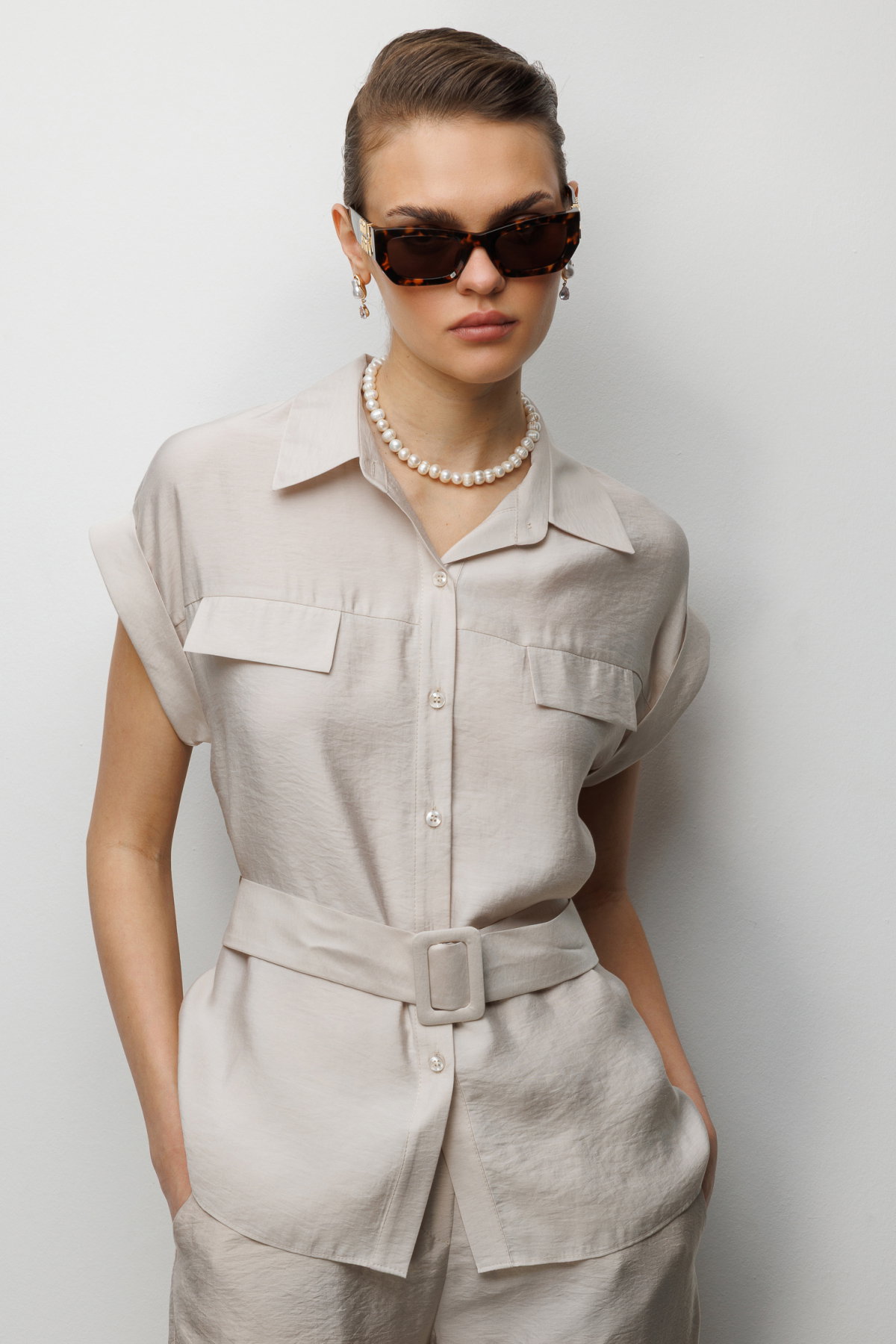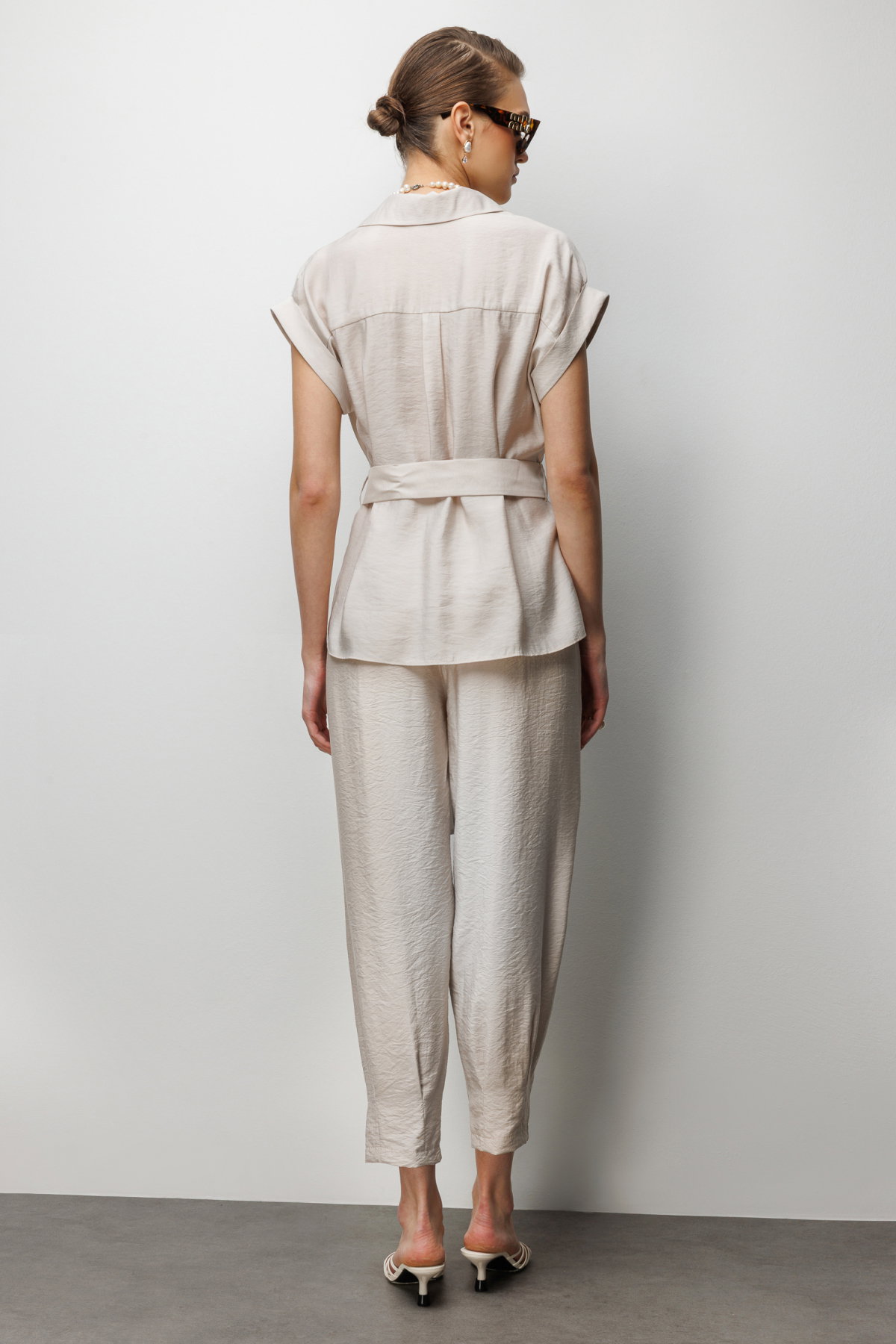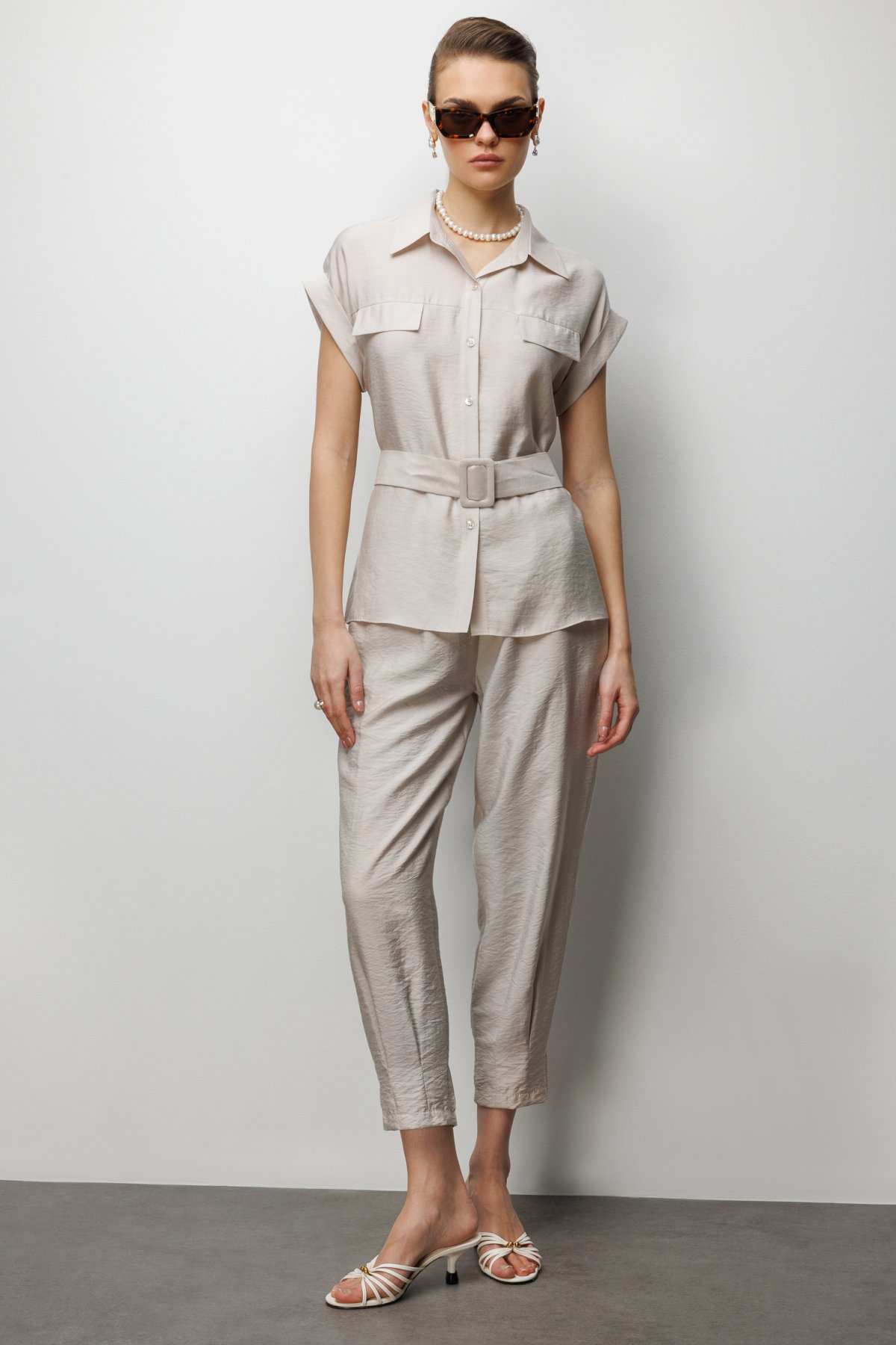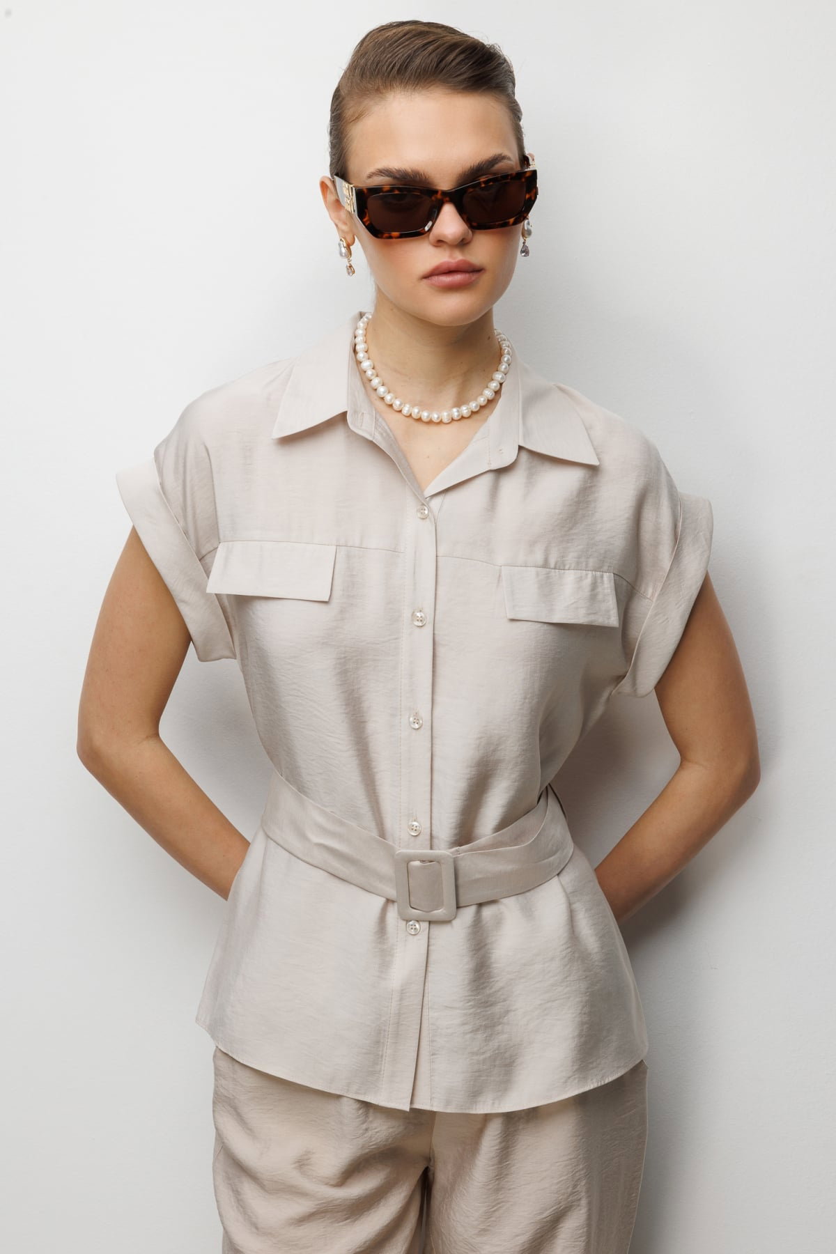 Ekol Kadın Beli Kemerli Kısa Kollu Bluz 2086 Bej