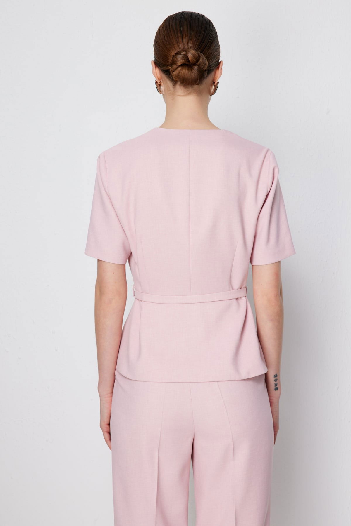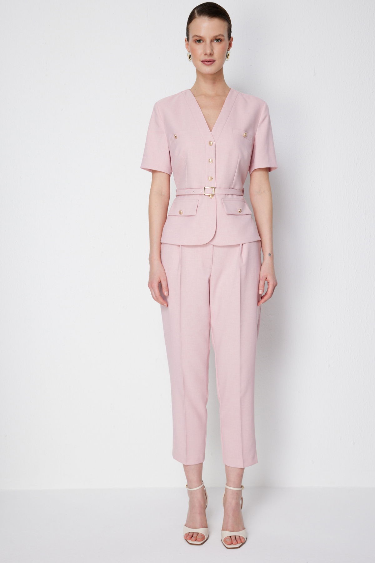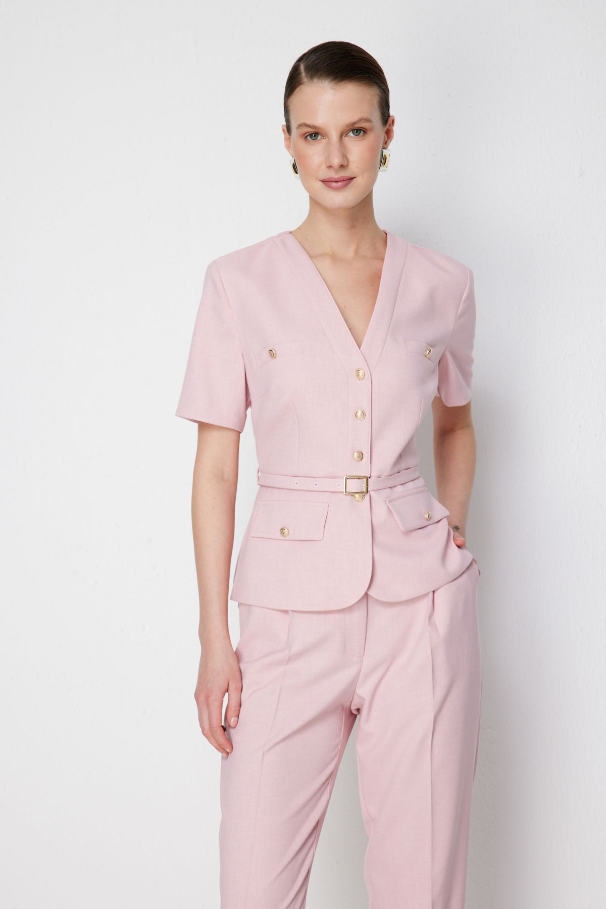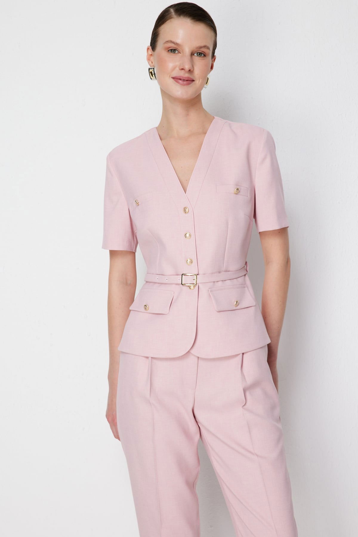 Detay: Polyester kumaştan üretilen, astarlı, V yaka, kısa kollu, kemerli ve düğmeli bu ceket modeli tüm bu özellikleri ile zarif ve modern bir görünüm sunar. V yaka detayı feminen bir şıklık katarken astarlı yapısı düzgün bir duruş sağlar. Kısa kollu tasarımı mevsim geçişlerinde rahat kullanım imkânı verirken kemer detayı bel hattını vurgulayarak silueti daha zarif hale getirir. Düğmeli kapama şekli ise klasik bir dokunuşla pratiklik sunarak ceket modelini hem iş hayatında hem de özel davetlerde şık bir tamamlayıcı haline getirir;