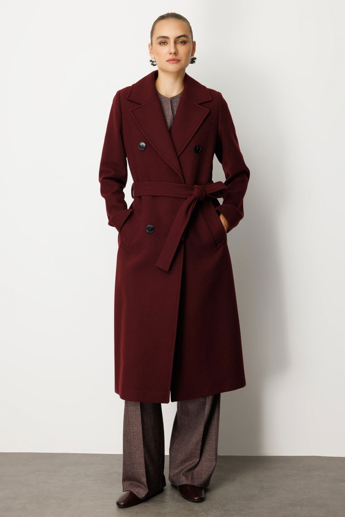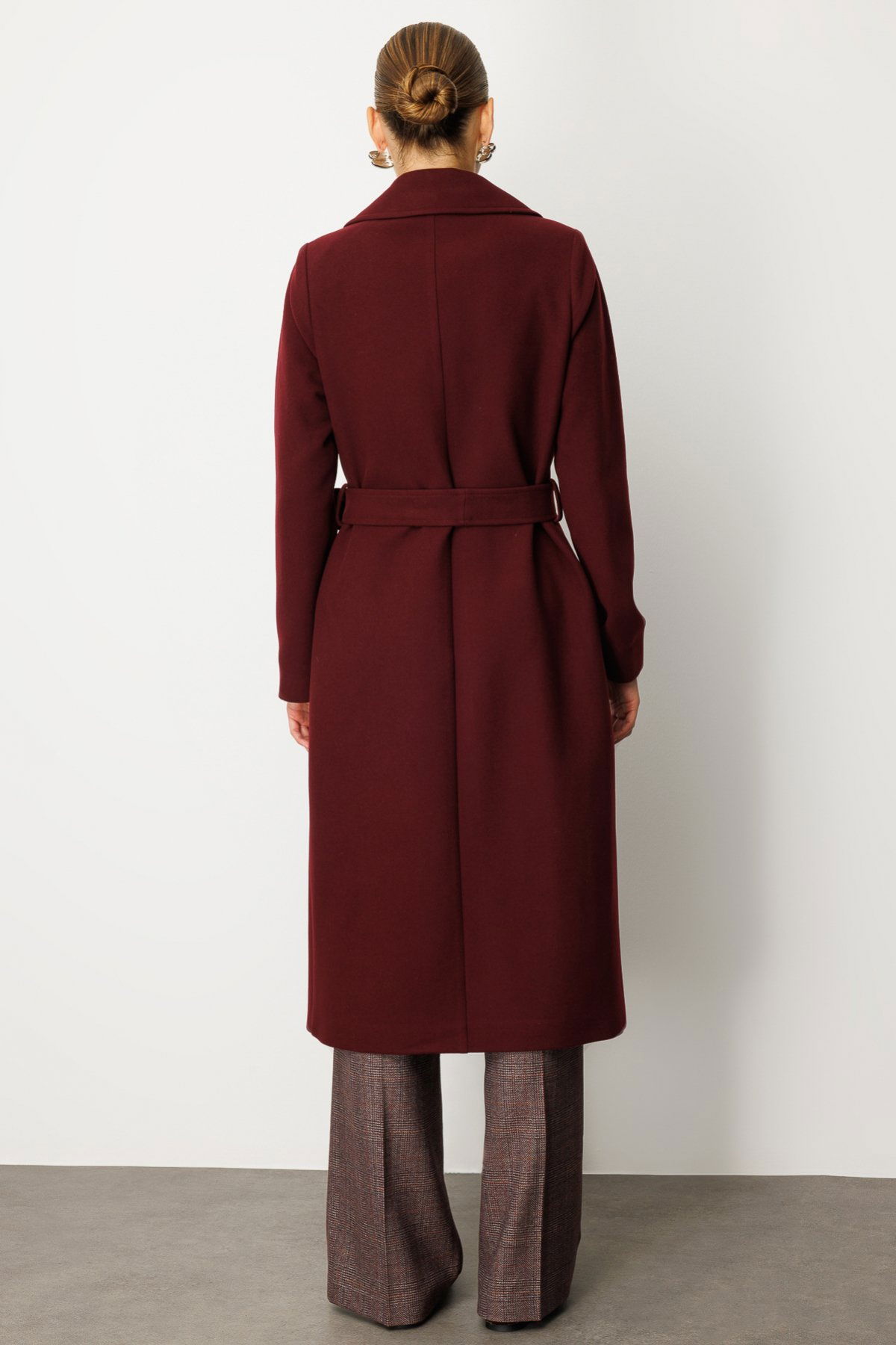 Ekol Kadın Beli Kuşaklı Kruvaze Yaka Kaban 6063 Bordo