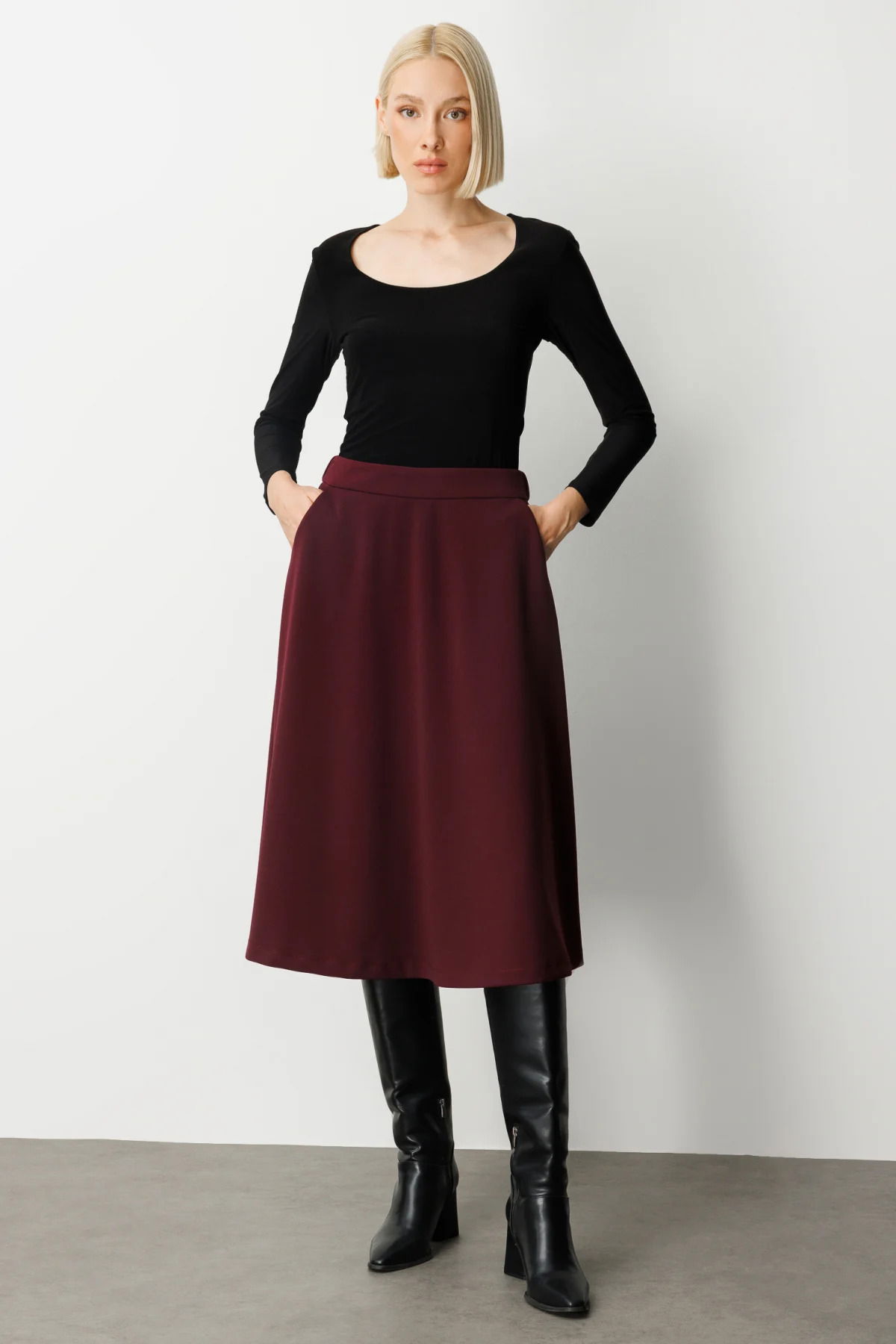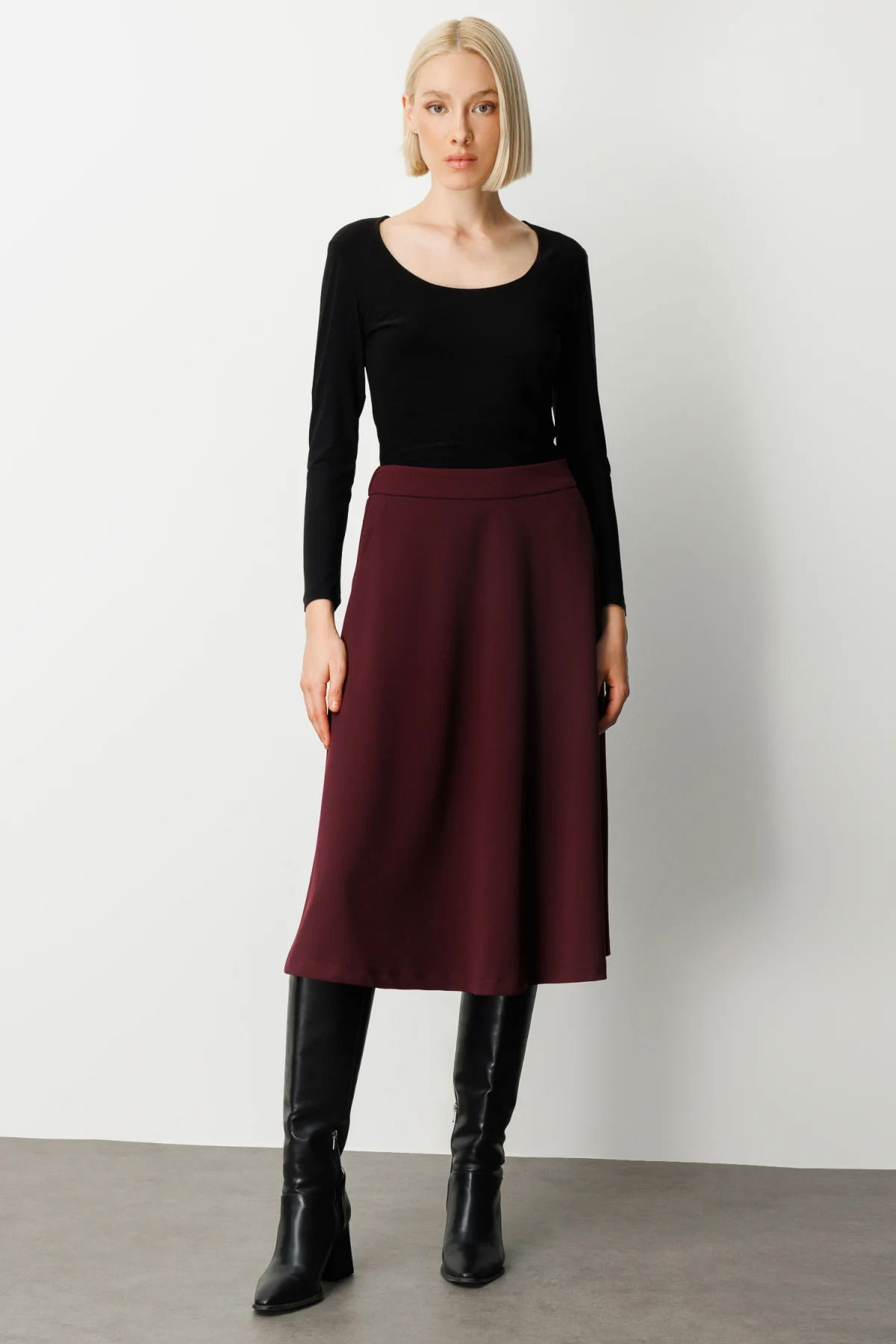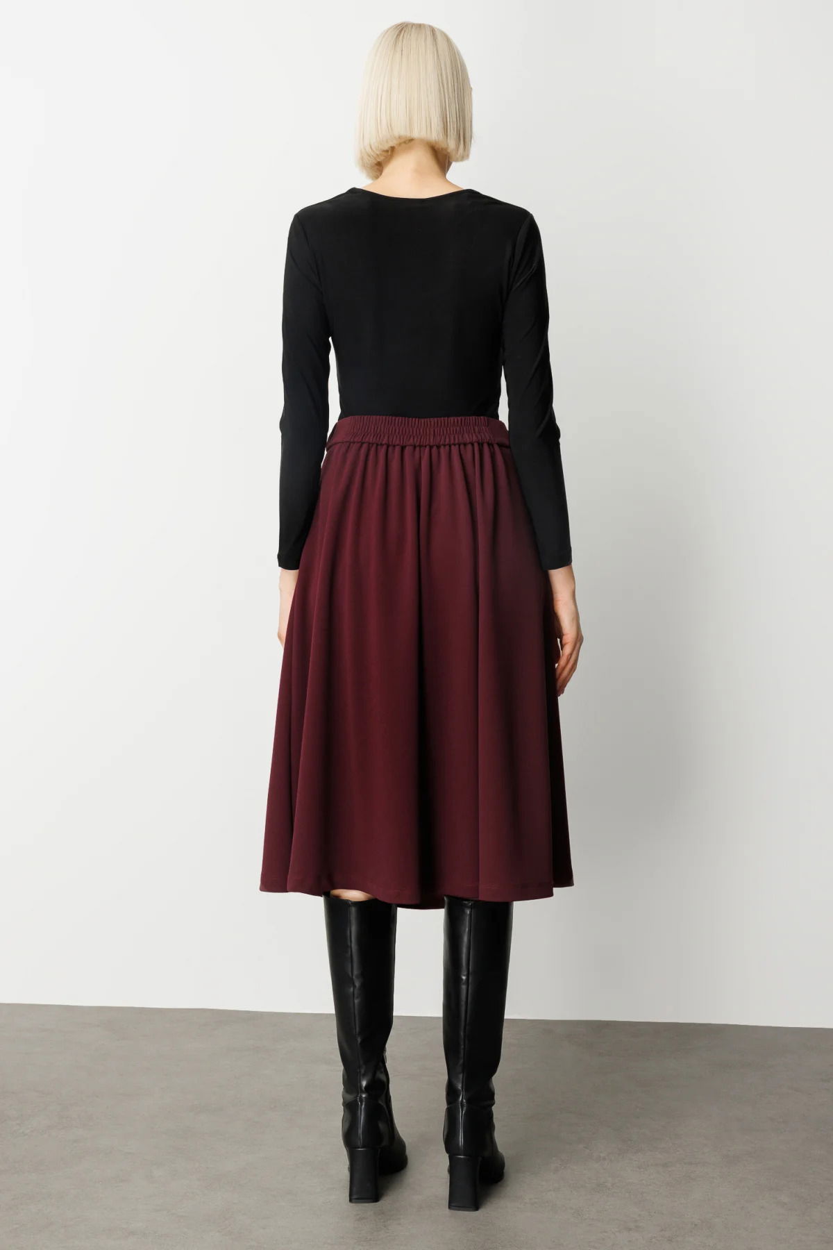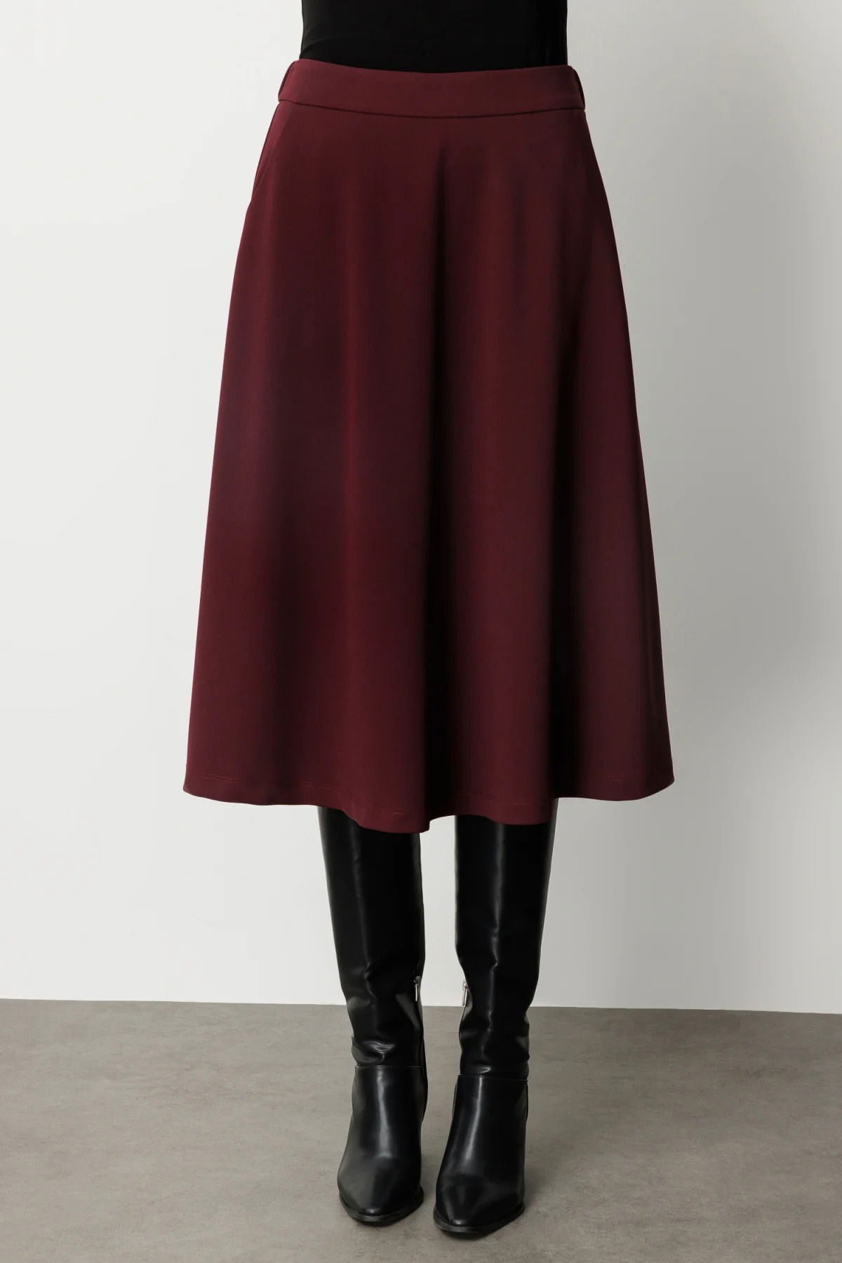 Ekol Kadın Beli Lastikli Volanlı Midi Etek 2023 Bordo