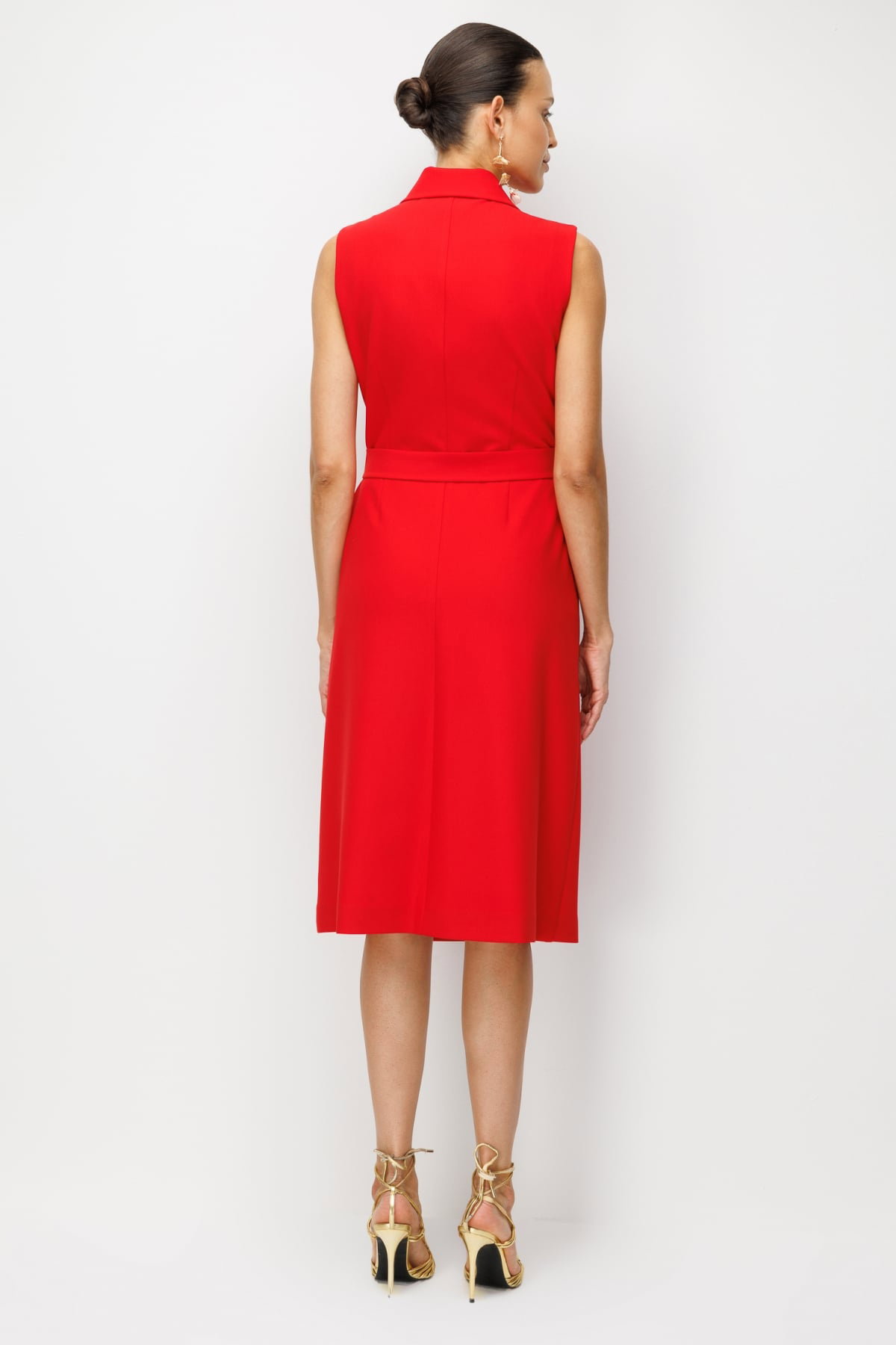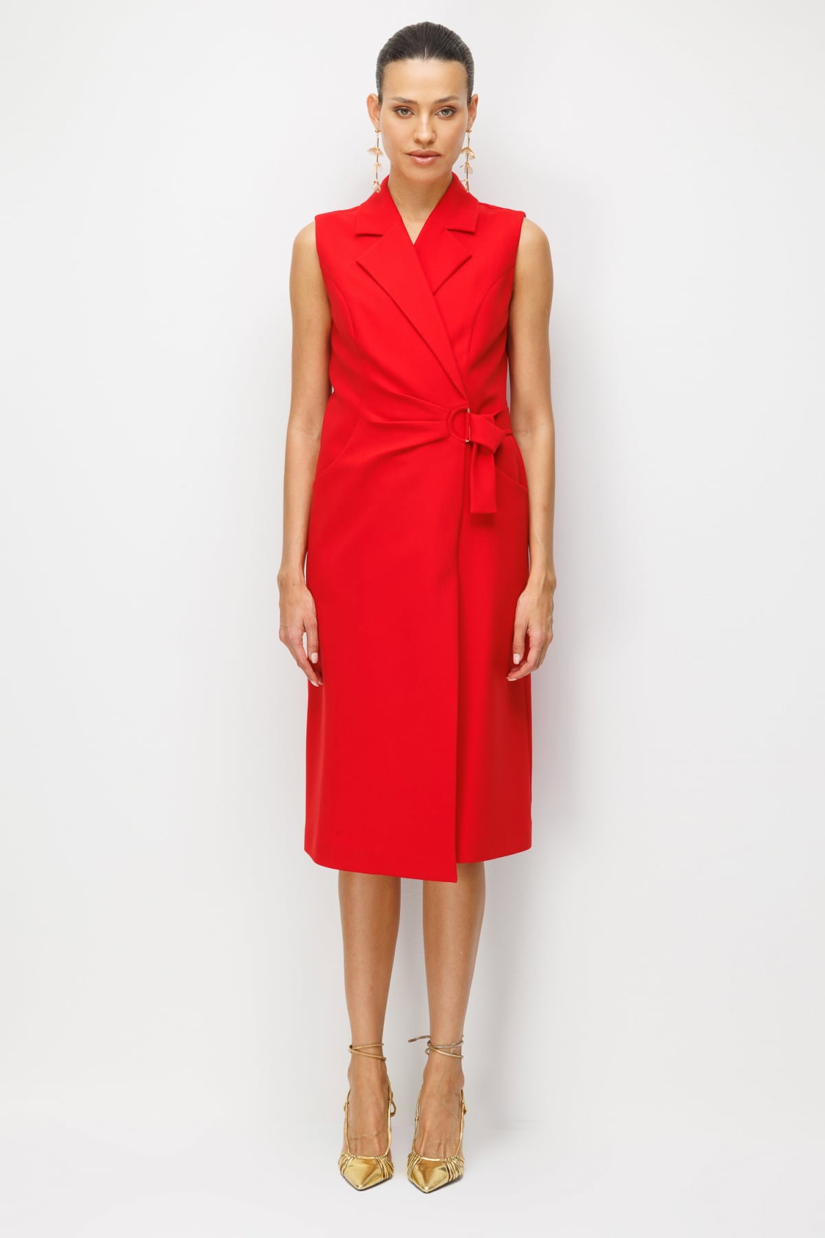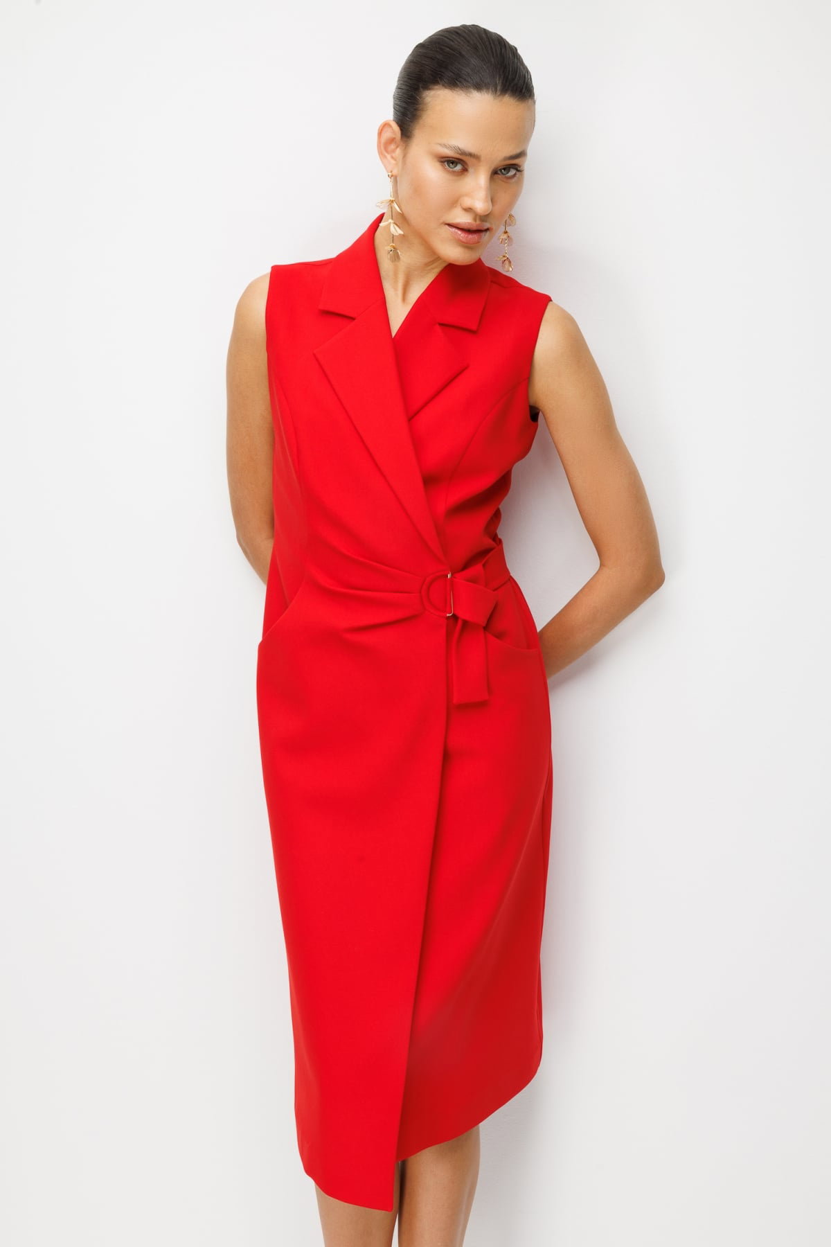 Detay: Dokuma kumaştan üretilen, astarlı, kruvaze yaka, kolsuz, kuşaklı, çıt çıt kapamalı ve yan cepli tasarımıyla öne çıkan bu midi elbise modern ve zarif bir görünüm sunar. Dokuma kumaş yapısı dayanıklılık ve kaliteli bir duruş sağlarken astarlı formu konforlu bir kullanım imkânı verir. Kruvaze yaka klasik bir şıklık kazandırırken kolsuz tasarım özgür bir hareket alanı sunar. Kuşak detayı bel hattını vurgulayarak feminen bir siluet oluşturur, çıt çıt kapama pratik bir kullanım sağlar, yan cepler ise hem fonksiyonel hem de şık bir detay olarak öne çıkar;