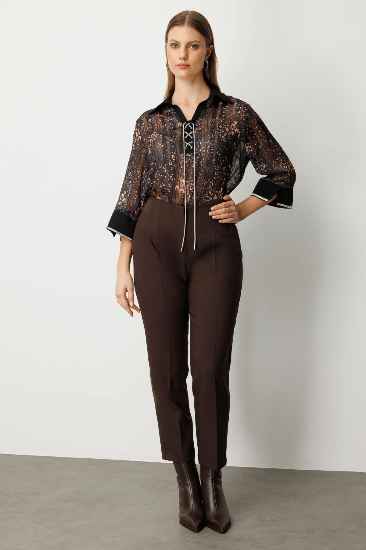 Detay: Şıklığı ve konforu bir araya getiren bu boru paça pantolon, dokuma kumaşıyla zarif bir duruş sergilerken astarsız yapısıyla hafif ve rahat bir kullanım sunar. Lastikli beli sayesinde gün boyu konfor sağlarken, fermuarlı kapama detayıyla pratiklik kazandırır. Fleto cep tasarımıyla sade ve modern bir görünüm sunan bu pantolon, hem ofis stiline hem de günlük kombinlere kolayca uyum sağlar;