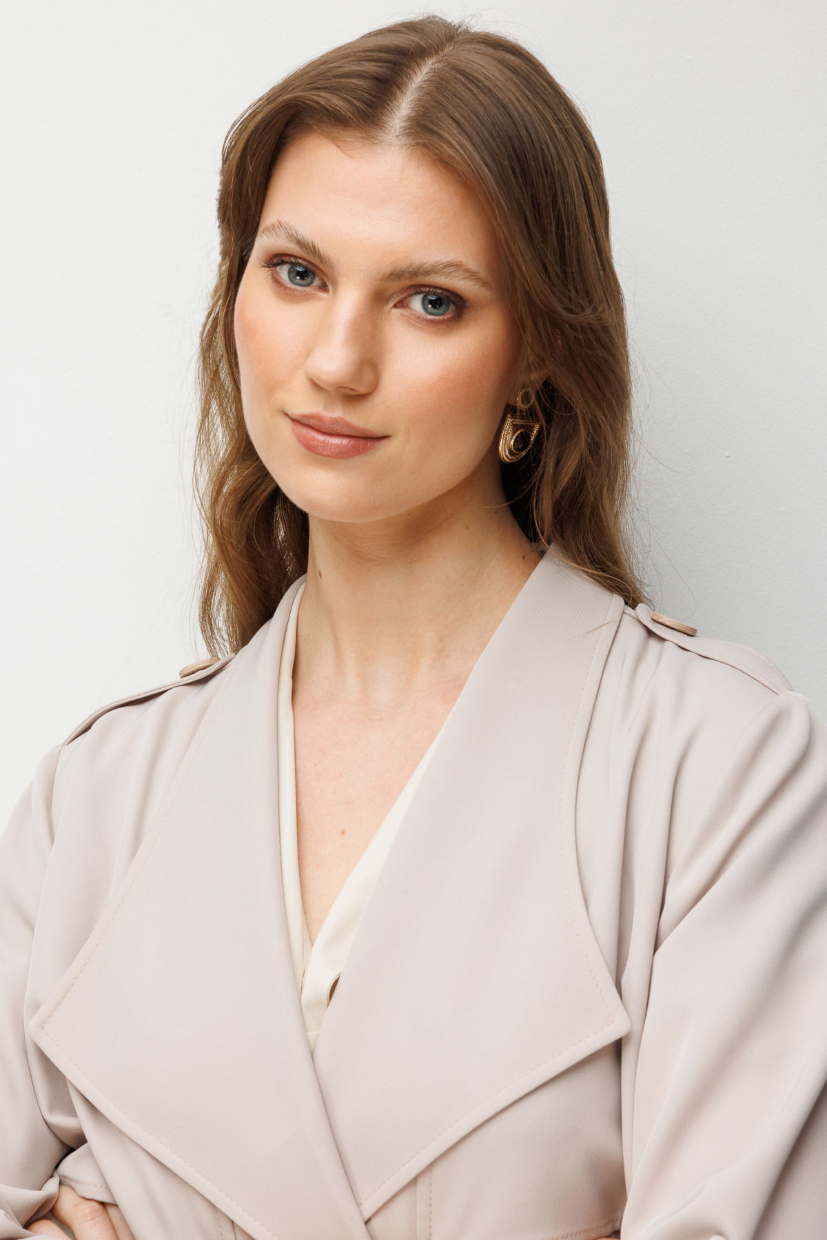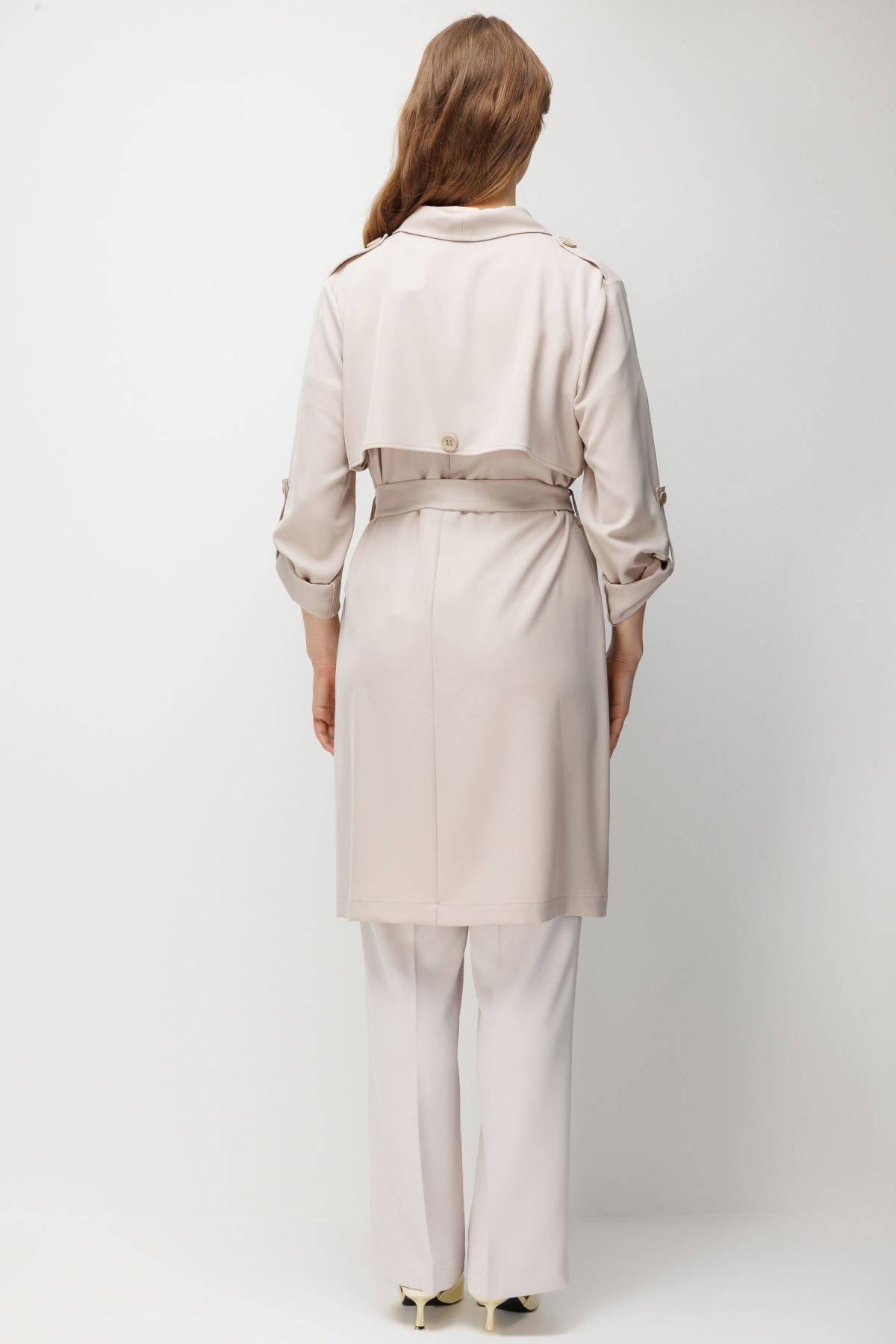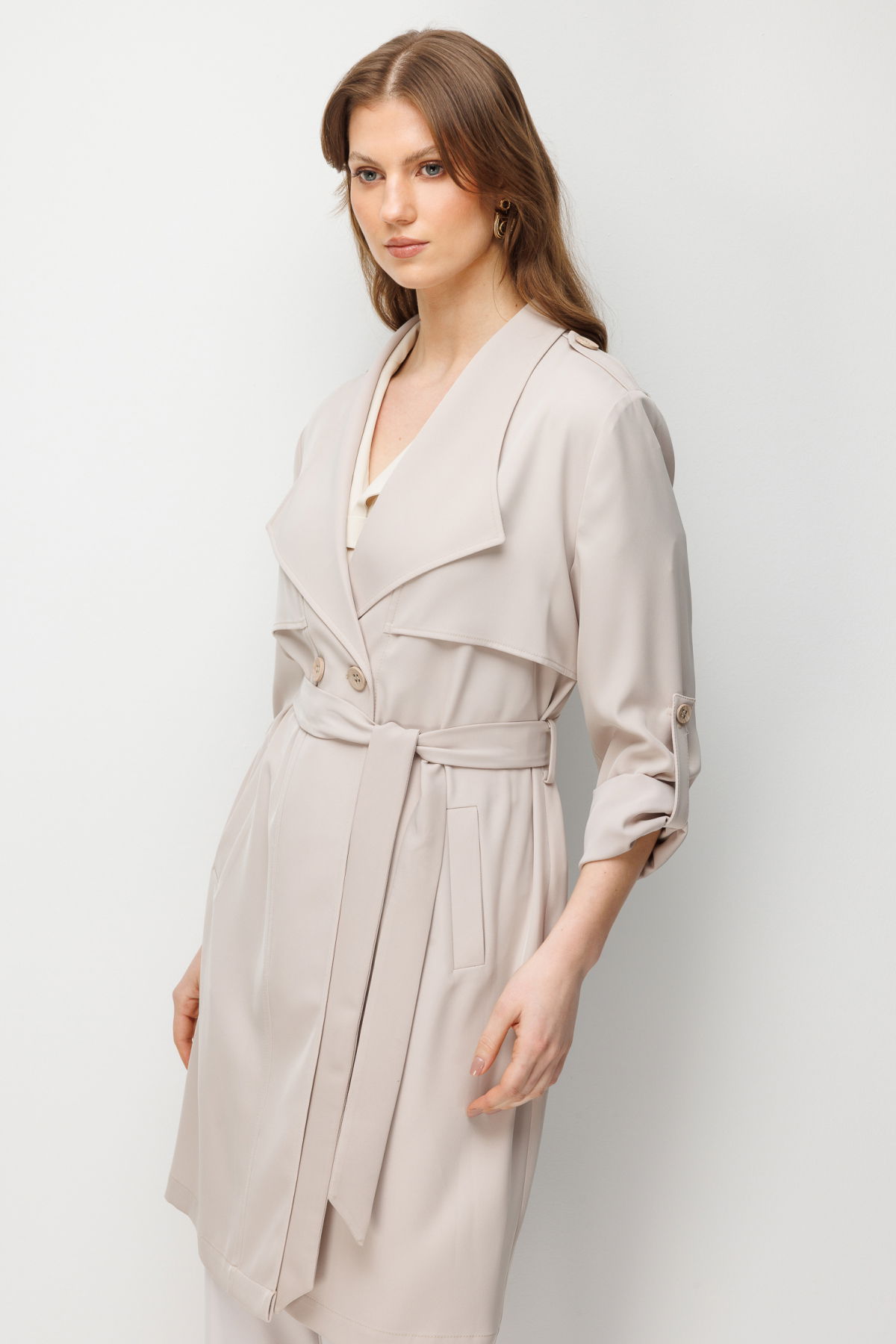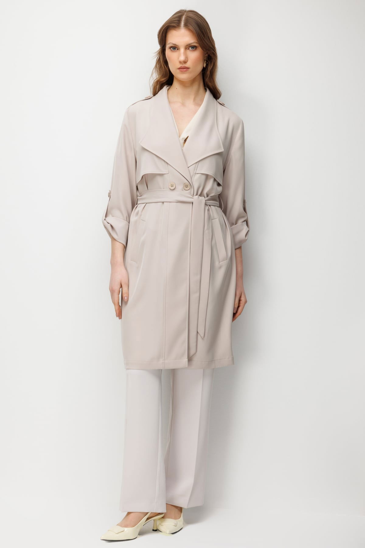 Detay: Dokuma kumaştan üretilen, astarsız, ceket yaka, uzun kollu, kuşaklı, düğmeli ve yan cepli bu trençkot modeli tüm bu özellikleri ile klasik ve zarif bir görünüm sunar. Ceket yaka tasarımı şıklığı ön plana çıkarırken uzun kol formu mevsim geçişlerinde ideal bir kullanım sağlar. Kuşak detayı bel hattını vurgulayarak feminen bir siluet oluşturur. Düğmeli kapama şekli klasik bir dokunuş katarken yan cep detayı işlevsellik kazandırarak trençkotu hem günlük hem de özel kombinlerde kullanışlı bir parça haline getirir;