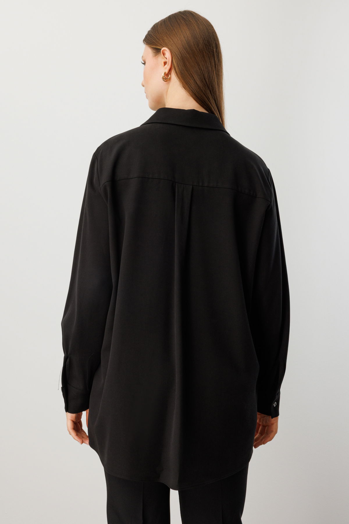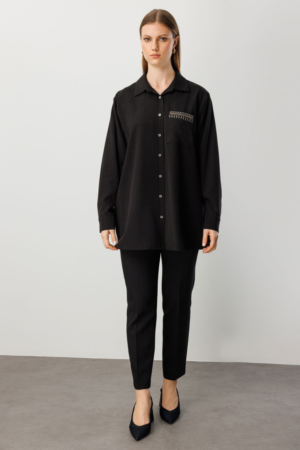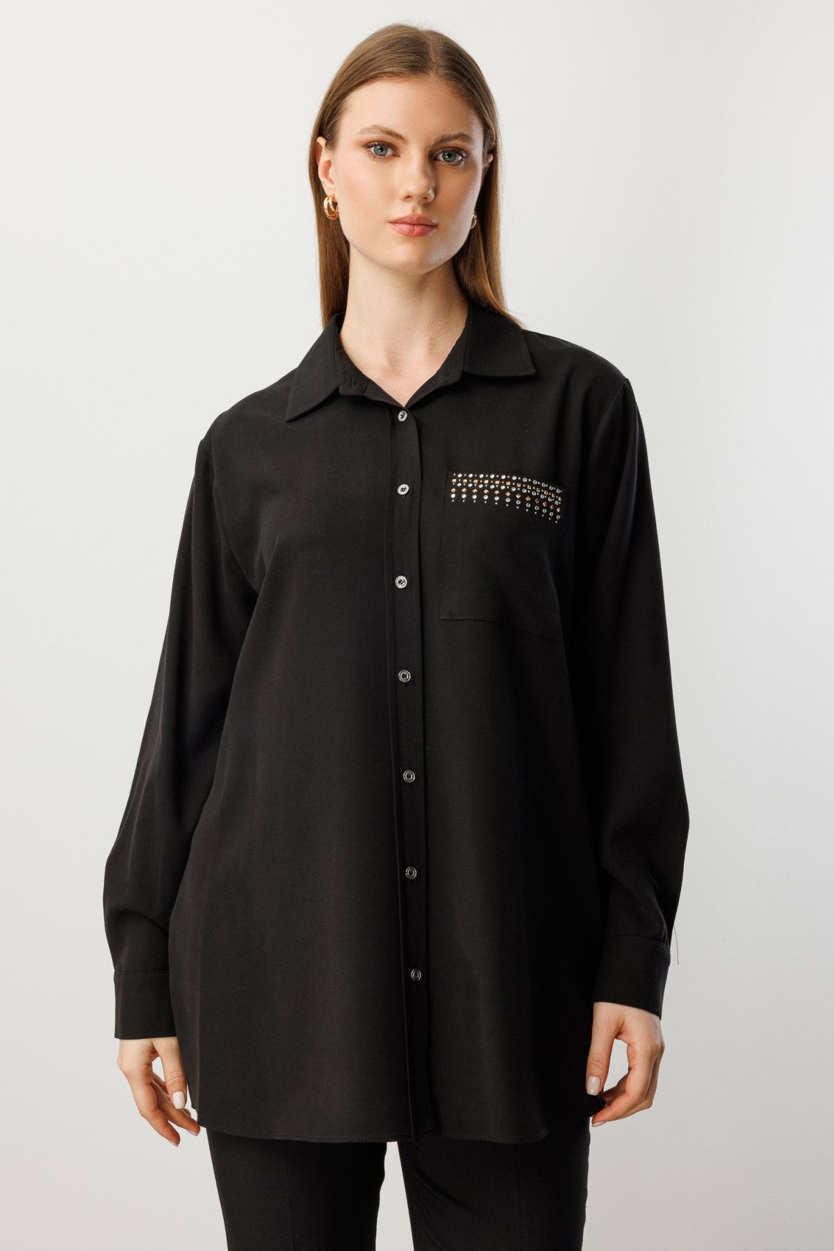 Ekol Kadın Büyük Beden Cebi Taş İşlemeli Gömlek 3561 Siyah