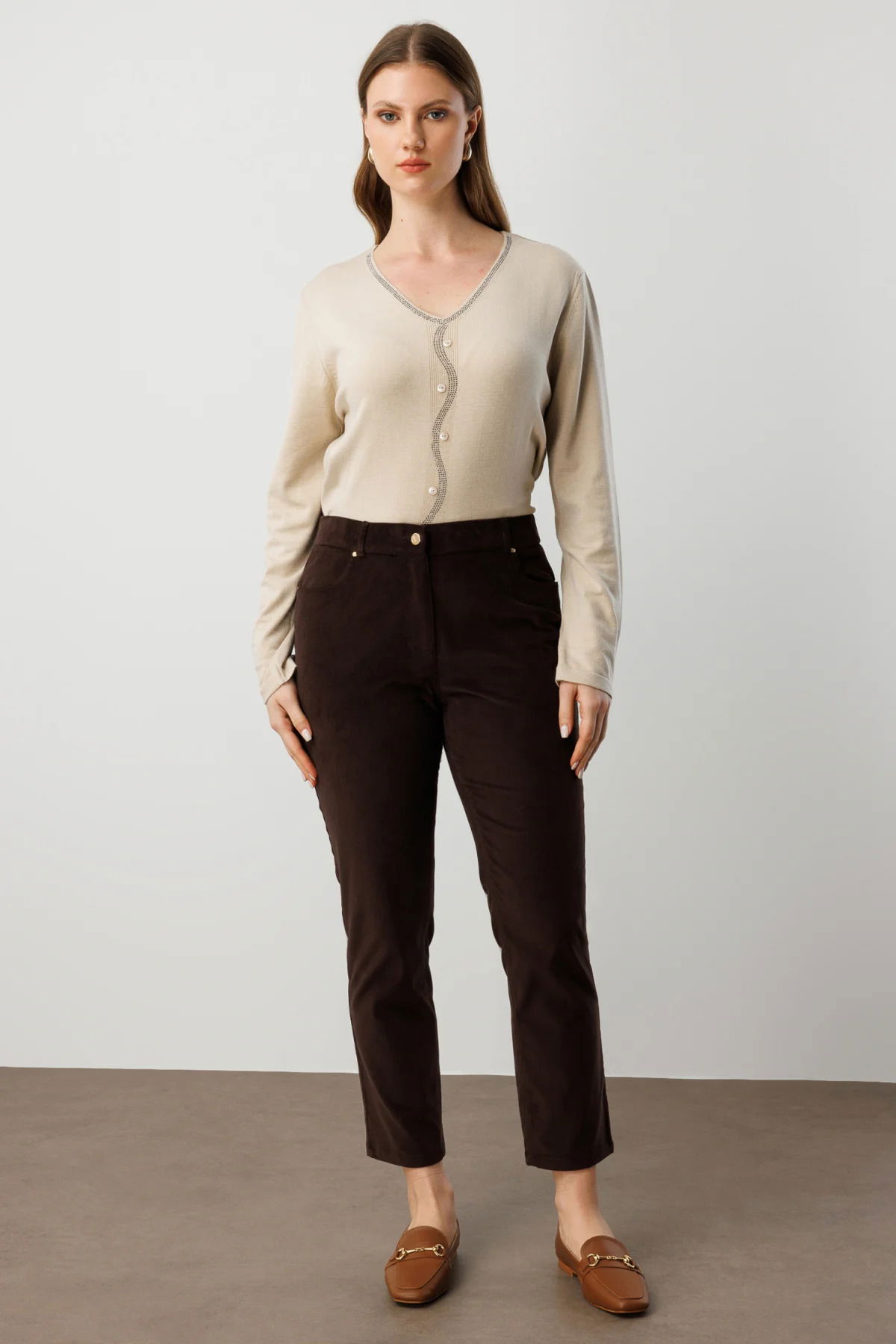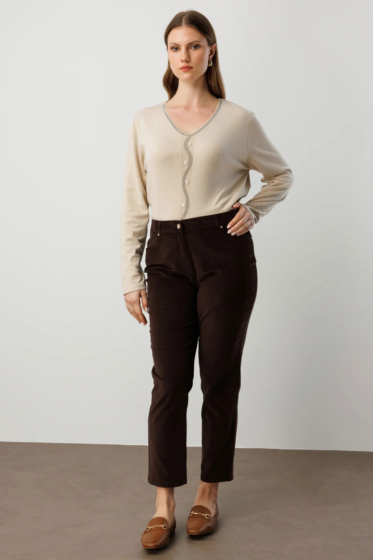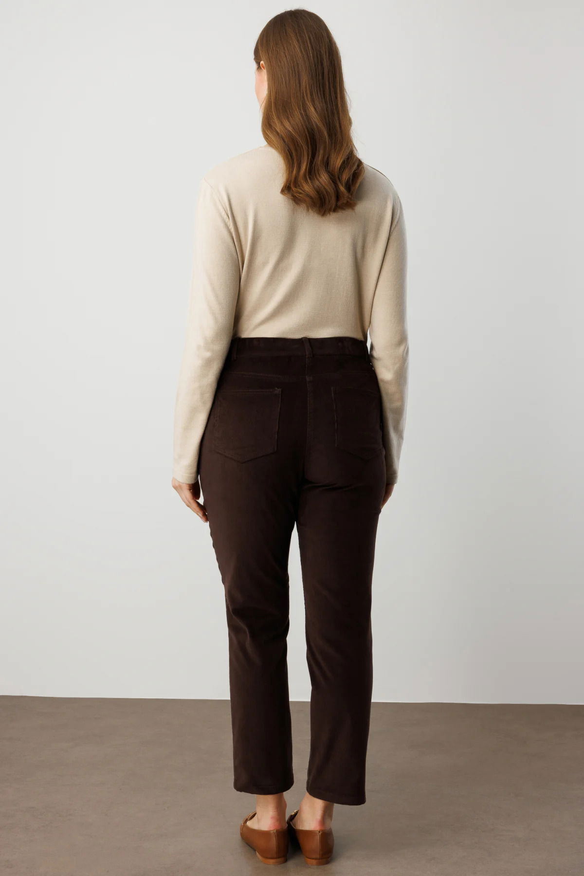 Detay: Kadife kumaştan üretilmiş, astarsız yapısı ve normal bel kesimiyle konforu ön planda tutan bu pantolon, dar paça formu ile modern bir şıklık sunar. Fermuarlı kapama ve yan cep detayları sayesinde hem pratik hem de fonksiyonel bir kullanım sağlar. Günlük kombinlerden özel davetlere kadar her ortamda stilinizi tamamlayacak kadife dar paça pantolon, gardırobunuzun vazgeçilmez parçalarından biri olur;