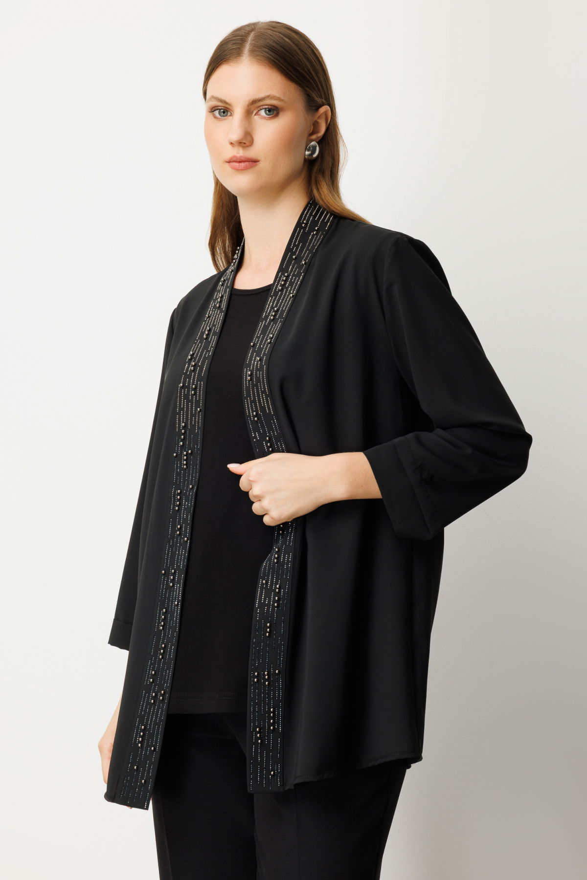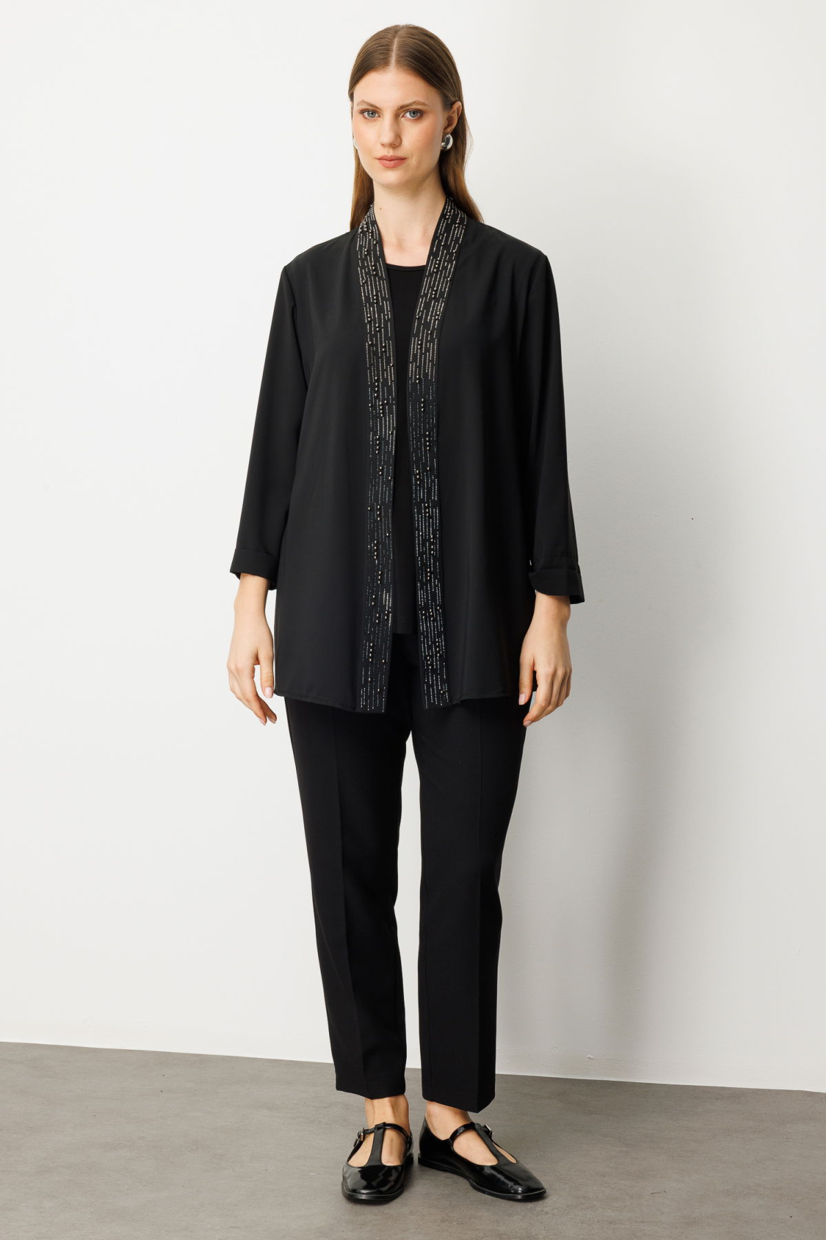 Detay: Polyester kumaştan üretilmiş, astarsız ve şal yaka tasarıma sahip bu uzun ceket, hafif yapısıyla mevsim geçişlerinde ideal bir tercihtir. Yarım kol detayı modern bir dokunuş sunarken, şal yaka ile zarif bir siluet oluşturur. Günlük kombinlerden ofis stiline kadar şıklığı tamamlayan kullanışlı bir parçadır;