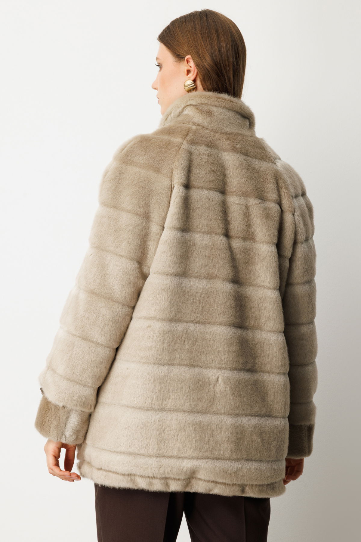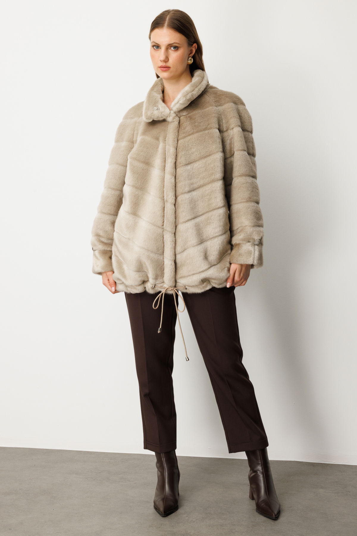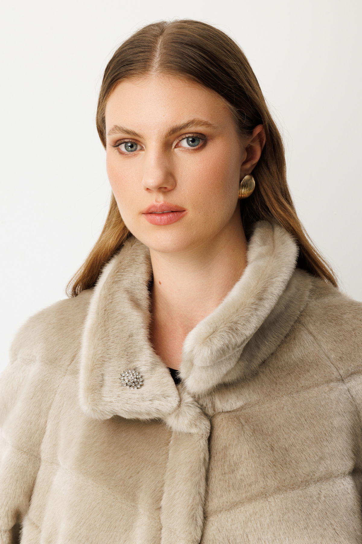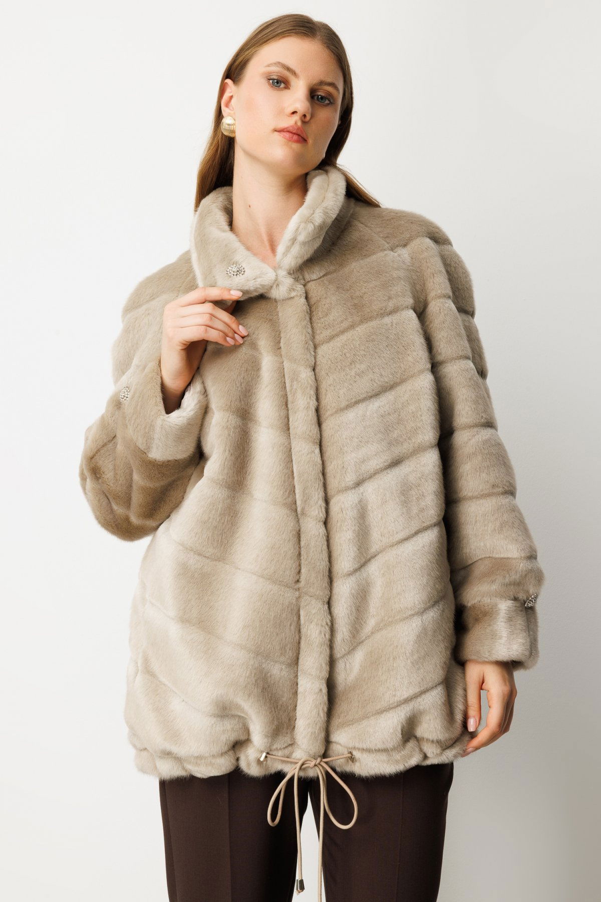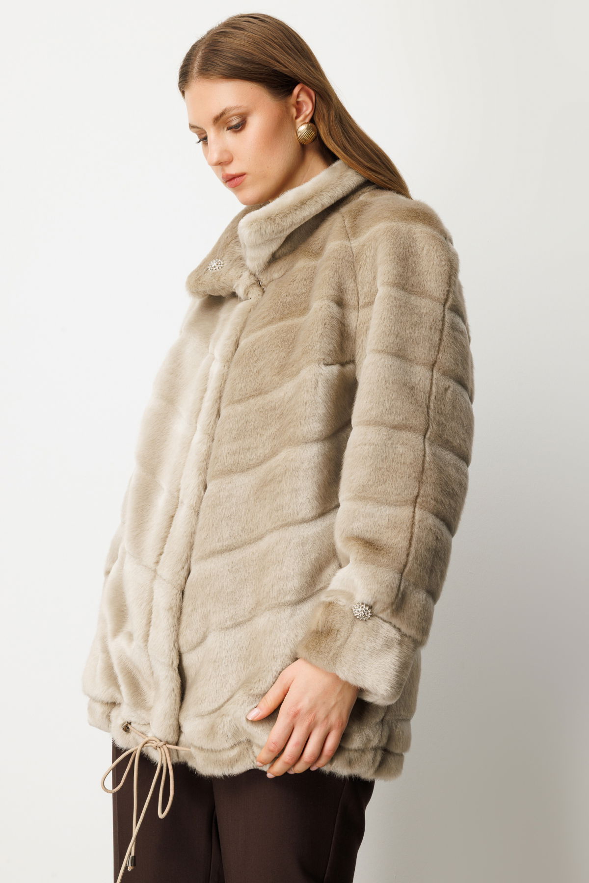 Ekol Kadın Büyük Beden Metal Aksesuarlı Peluş Kaban 6305 Vizon