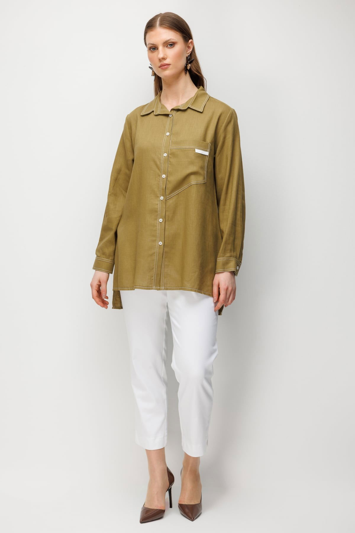 Detay: Dokuma kumaştan üretilen, astarsız, polo yaka, uzun kollu, düğmeli ve torba cepli bu keten gömlek modeli tüm bu özellikleri ile klasik ve modern bir görünüm sunar. Polo yaka detayı sportif bir şıklık katarken astarsız yapısı hafiflik sağlar. Uzun kollu tasarımı mevsim geçişlerinde rahat kullanım imkânı verirken düğmeli kapama şekli pratiklik sunar. Torba cepli formu ise hem işlevsel hem de stil sahibi bir detay olarak gömleğe karakter kazandırır;