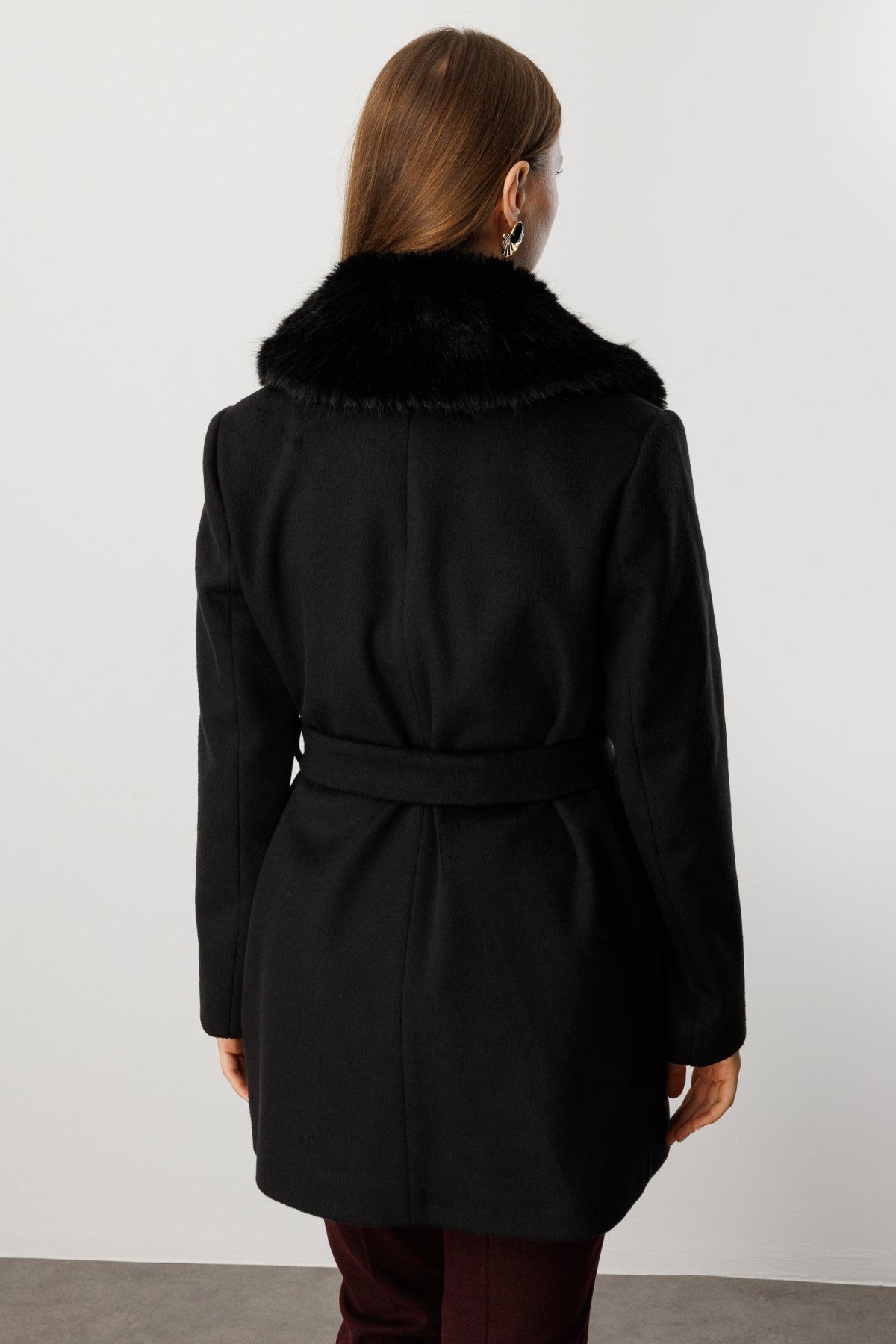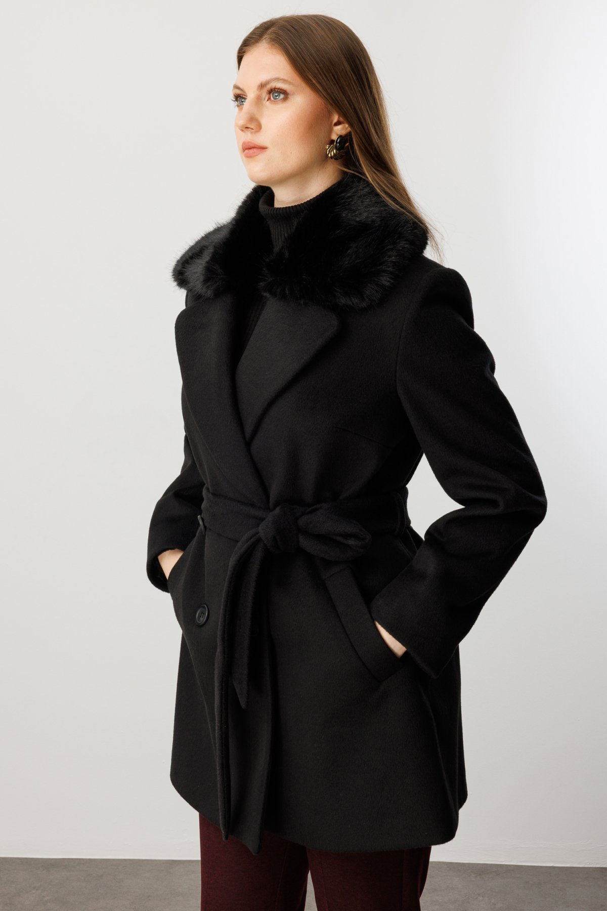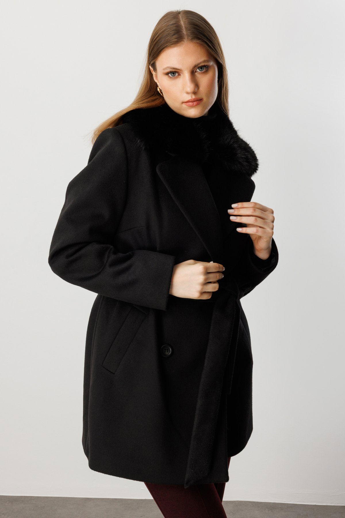 Ekol Kadın Büyük Beden Yakası Kürklü Kaban 6333 Siyah