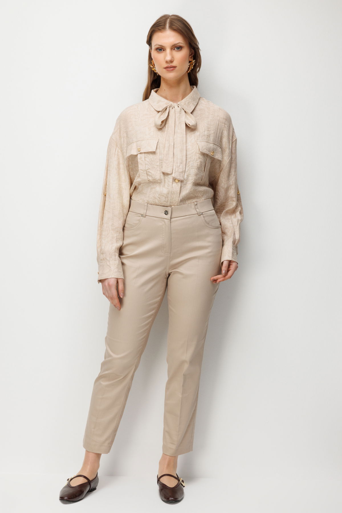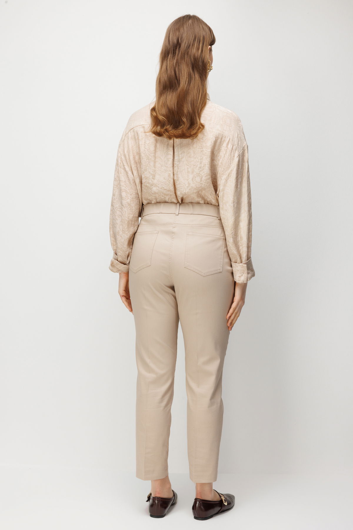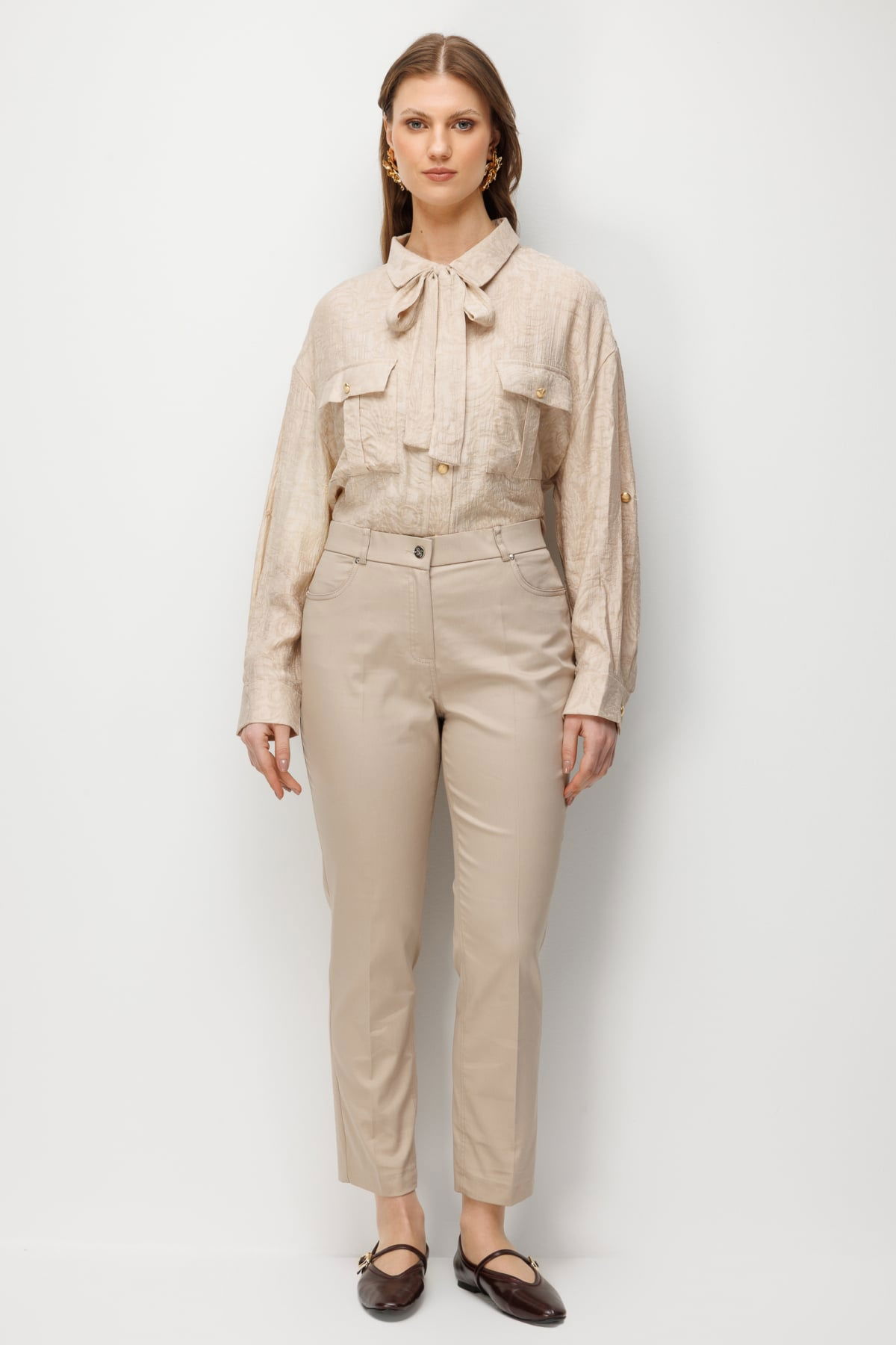Detay: Dokuma kumaştan üretilen, astarsız, yüksek bel, dar paça, fermuarlı ve yan cepli bu pantolon modeli tüm bu özellikleri ile modern ve kullanışlı bir görünüm sunar. Yüksek bel tasarımı bel hattını vurgulayarak daha uzun bir siluet etkisi yaratırken dar paça formu şık ve zarif bir duruş sağlar. Fermuarlı kapama şekli pratiklik sunarken yan cep detayı işlevsellik katarak pantolonu hem günlük kombinlerde hem de daha şık stillerde tercih edilebilir hale getirir;