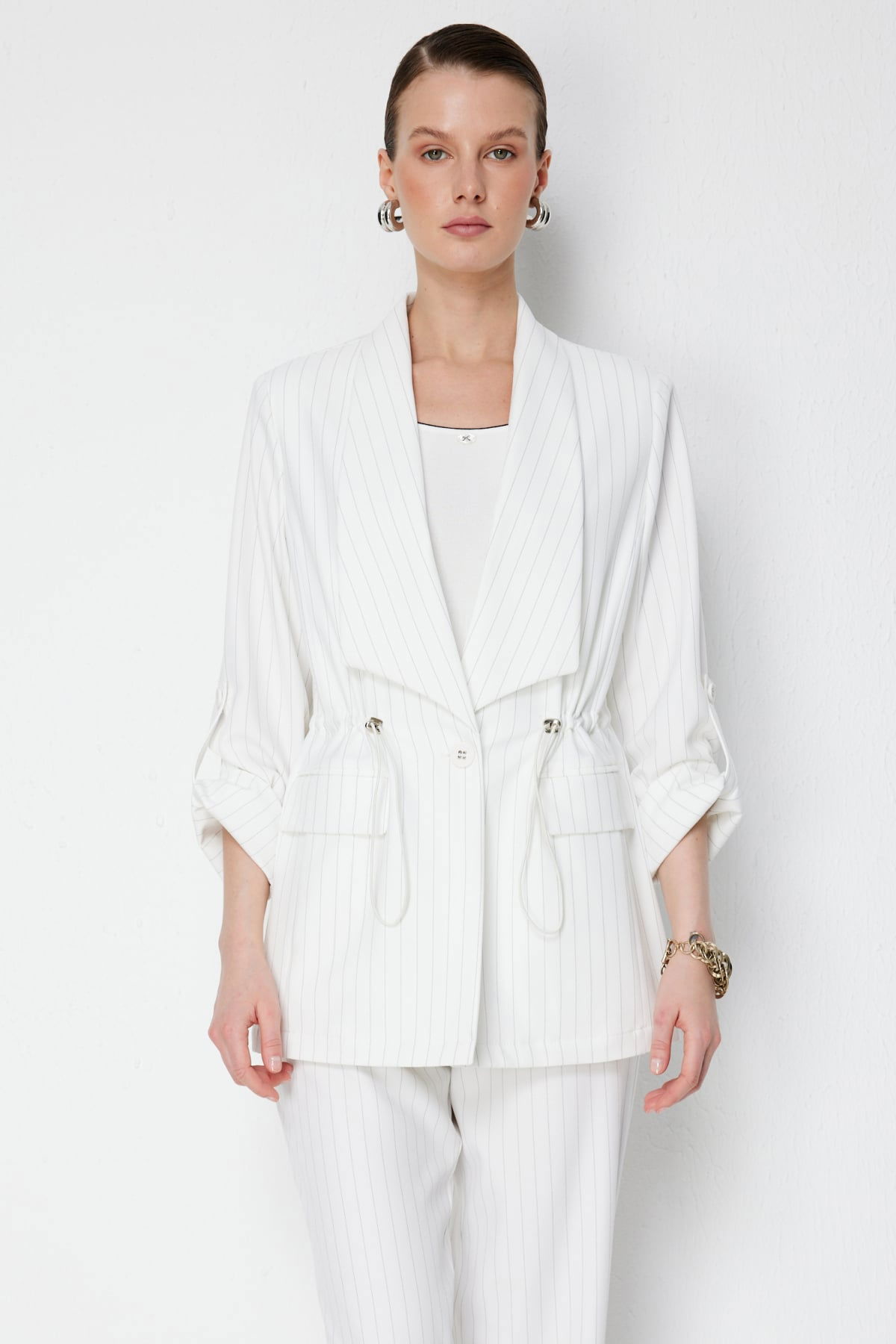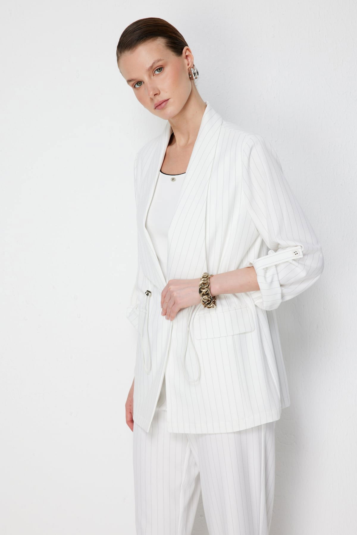 Detay: Bu ceket modeli, dokuma kumaş yapısıyla kaliteli ve dayanıklı bir kullanım sunarken astarsız tasarımı sayesinde hafif bir giyim deneyimi sağlar. Uzun kollu vatkalı formu güçlü ve modern bir siluet oluştururken, ceket yaka detayı klasik bir şıklık kazandırır. Düğmeli kapama şekli pratik kullanım sağlarken, kapaklı cep detayı hem fonksiyonel hem de zarif bir görünüm sunar. Günlük kombinlerden ofis şıklığına kadar geniş bir kullanım alanı yaratan bu parça, gardırobunuzun öne çıkan seçeneklerinden biri olmaya adaydır;