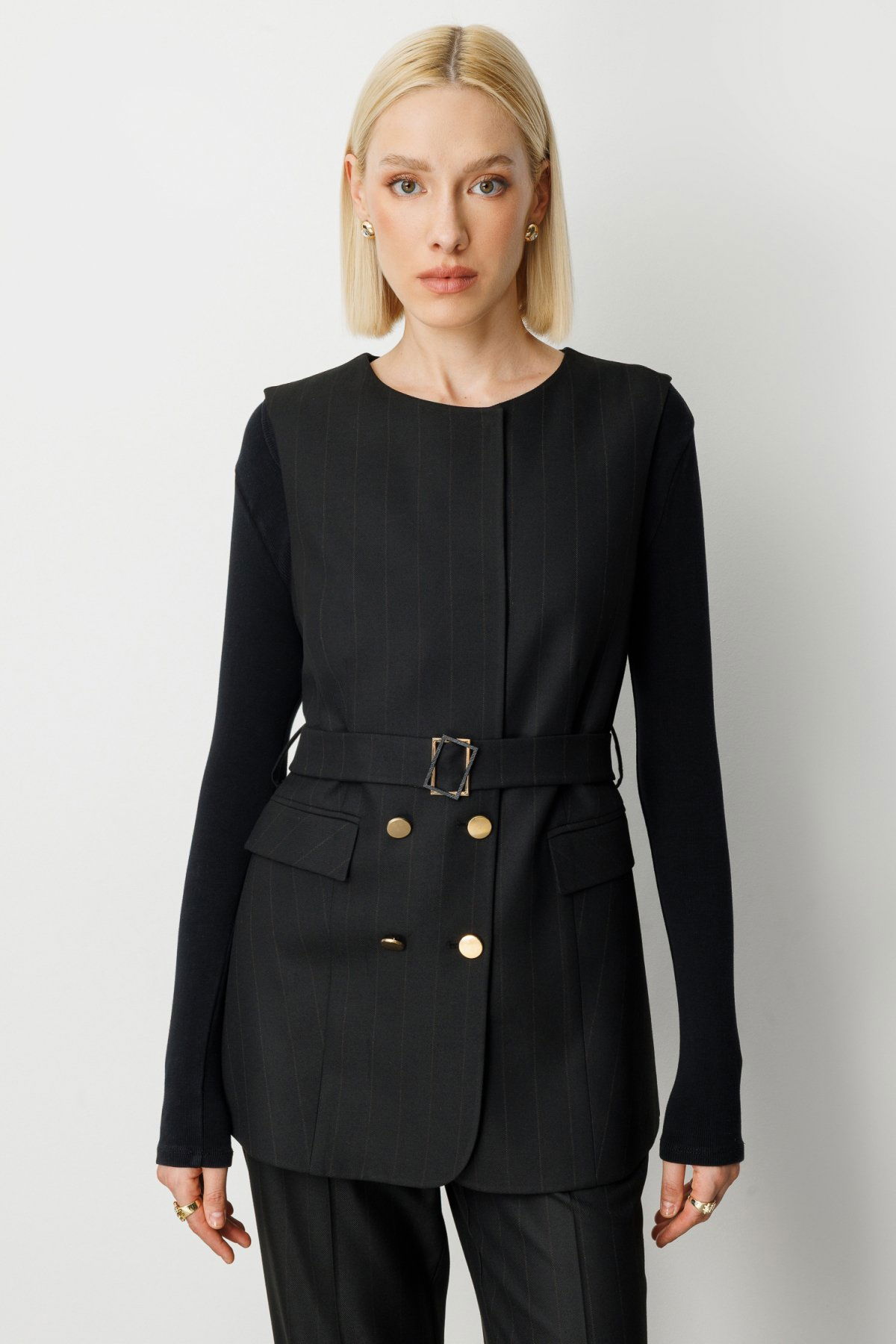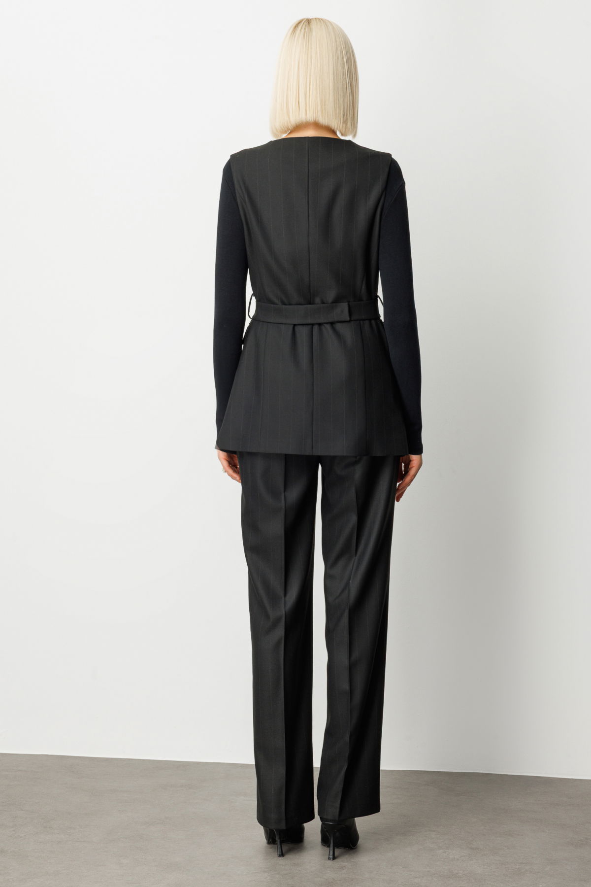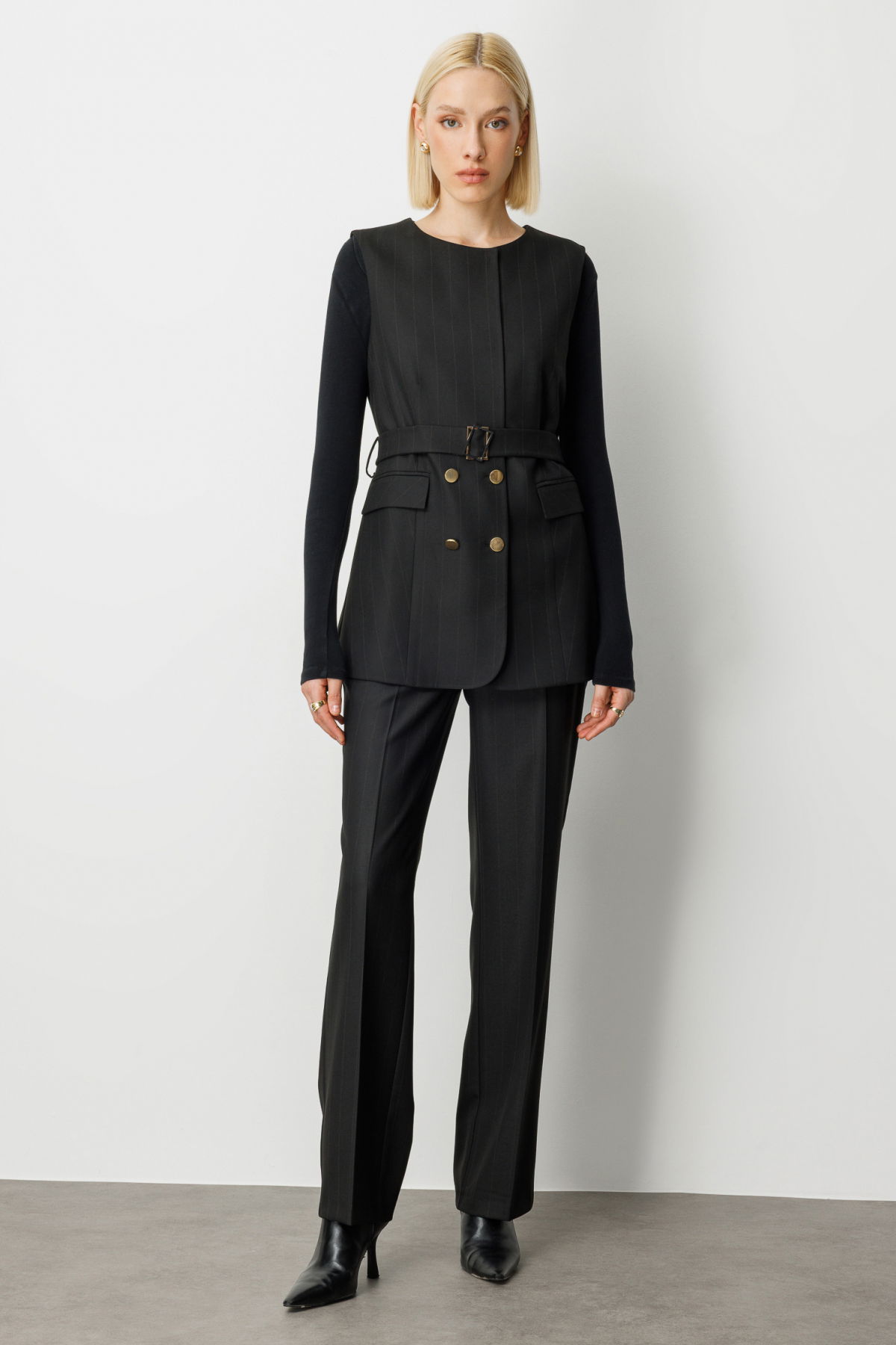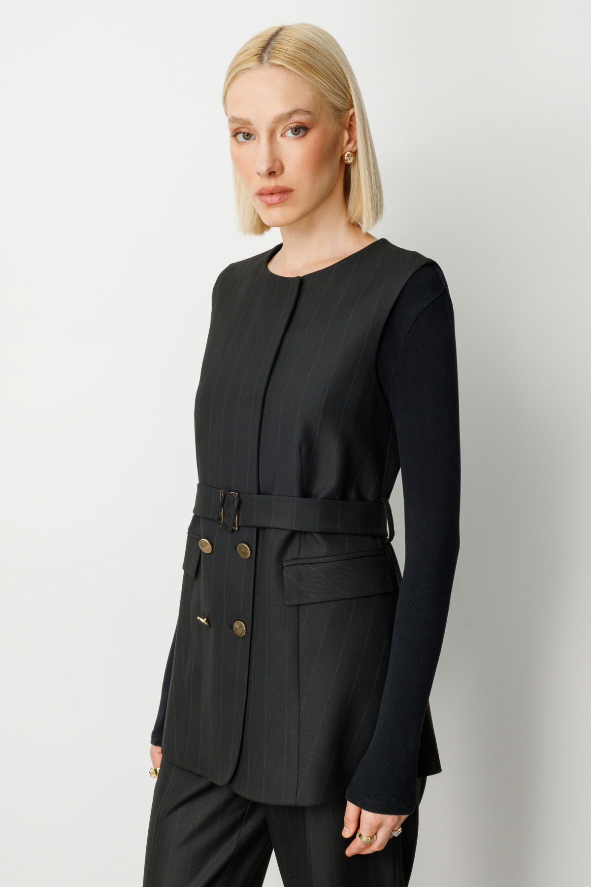 Detay: Dokuma kumaştan üretilmiş astarlı ve sıfır yaka tasarıma sahip bu kolsuz yelek, kemerli yapısıyla vücut formunu zarifçe ortaya çıkarır. Çıt çıt kapama detayı ve kapaklı cepleriyle hem pratik hem de şık bir kullanım sunan bu model, modern şehir stiline güçlü bir dokunuş katar. Astarlı dokusu sayesinde konforlu bir giyim deneyimi sunan kemerli yelekler, sonbahar kombinlerinin vazgeçilmez parçası haline geliyor;