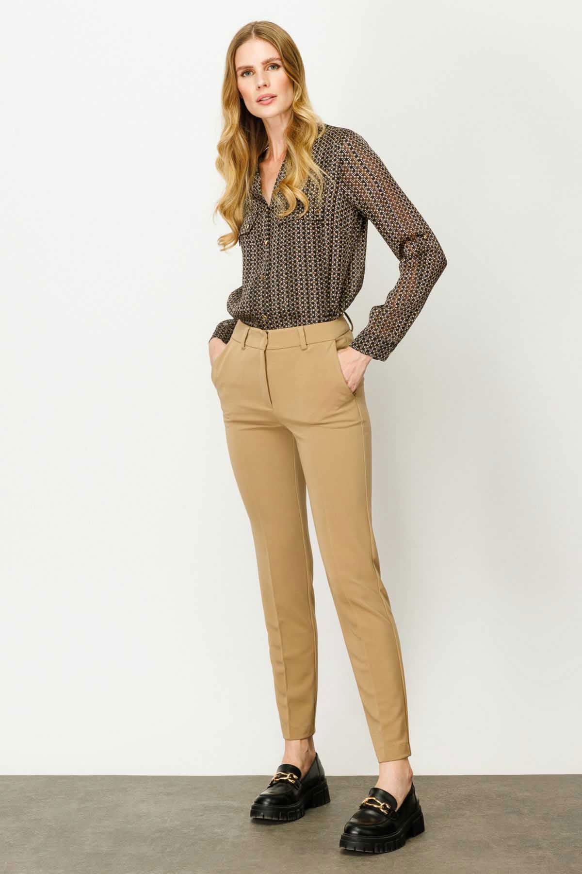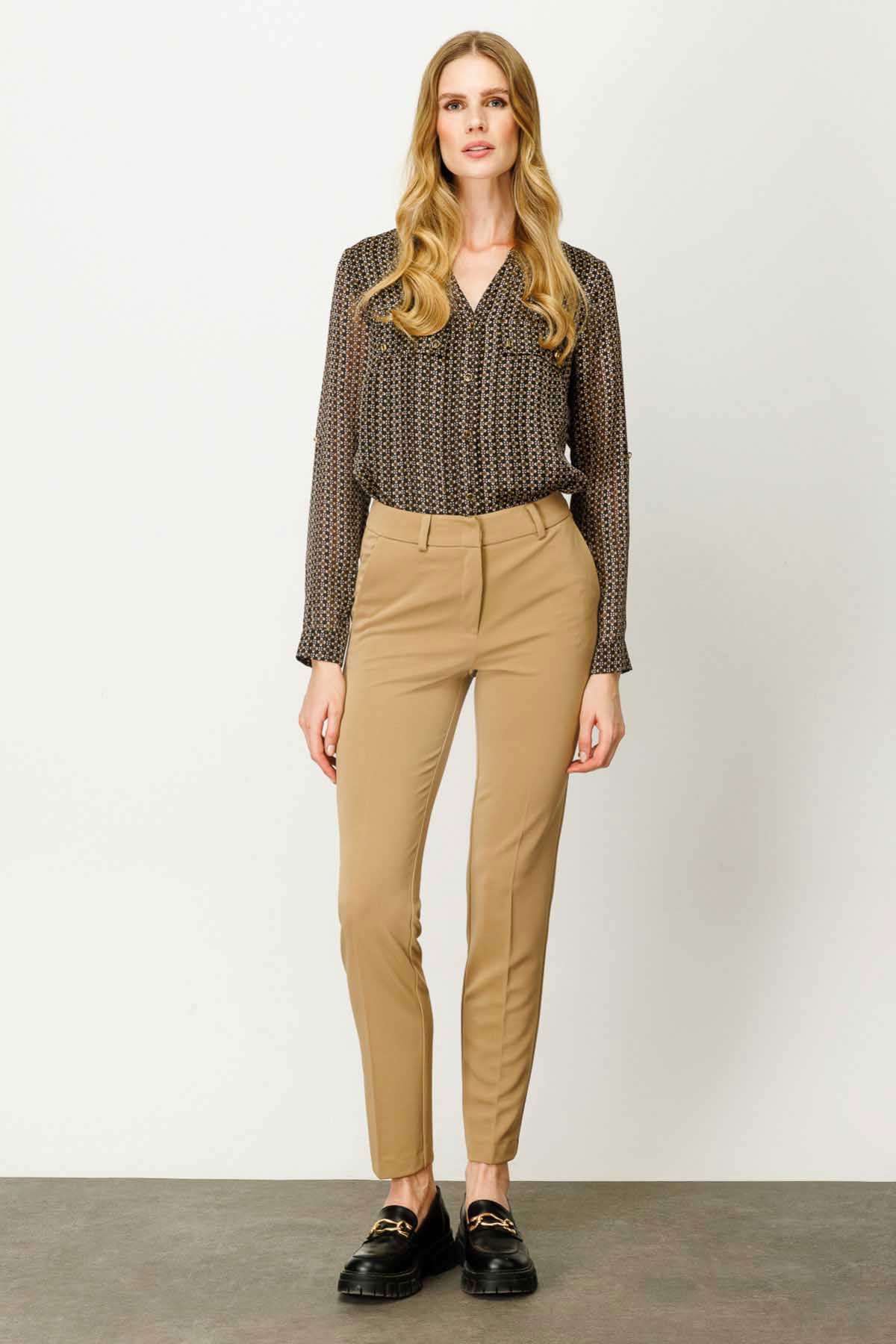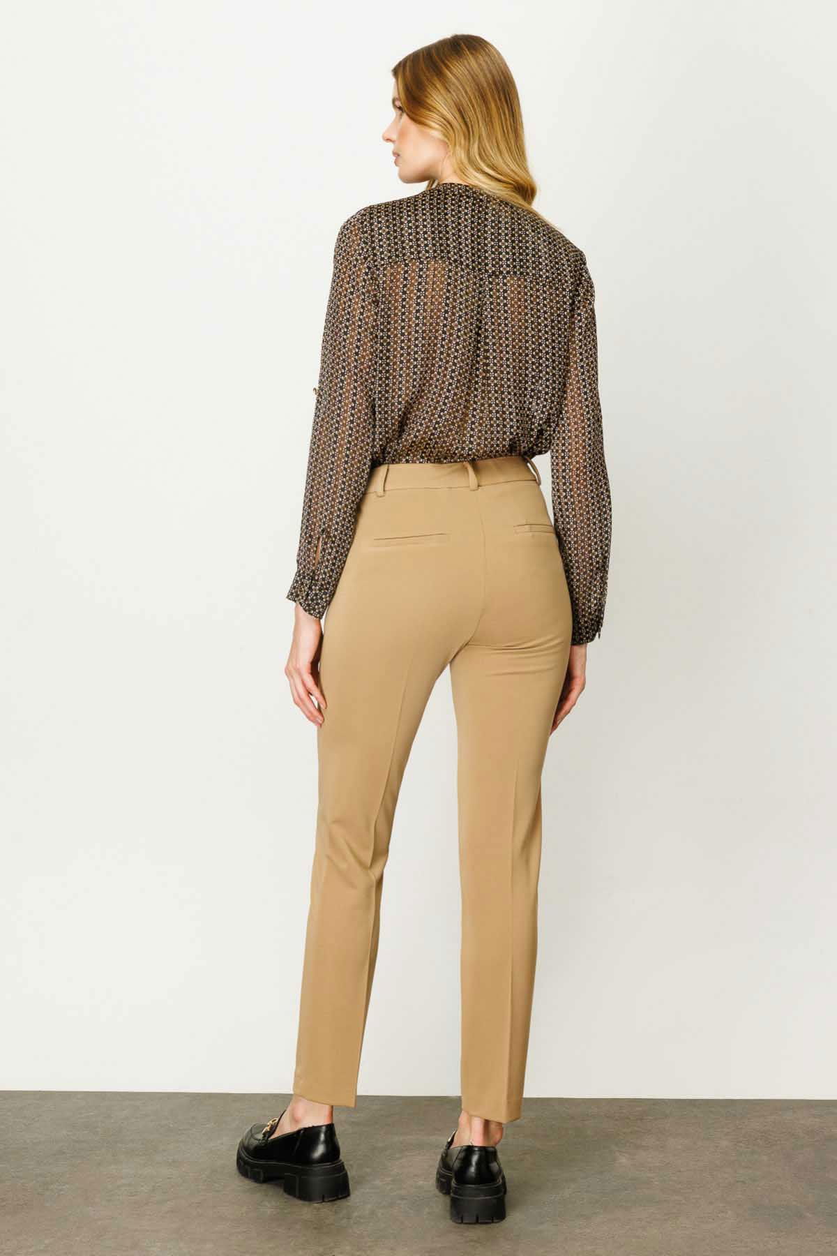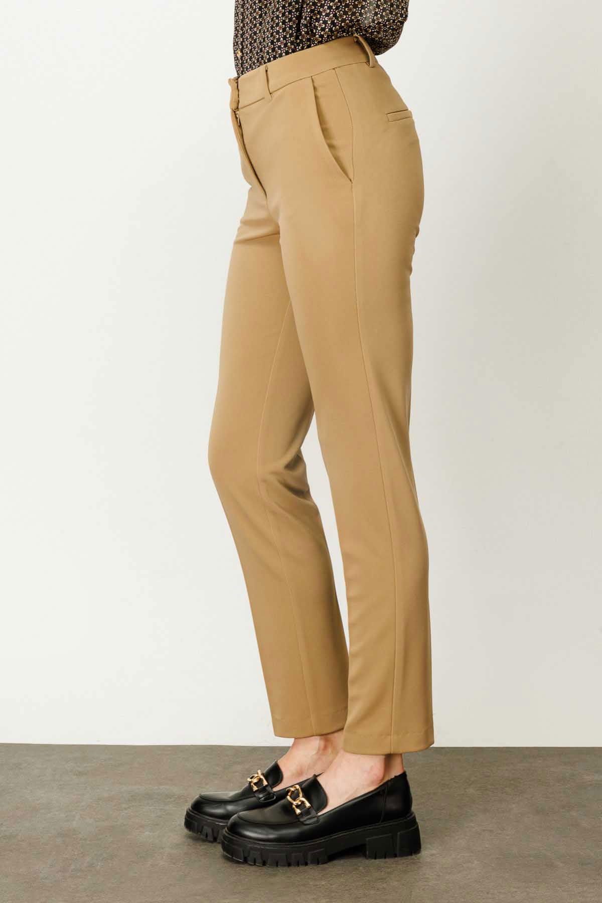 Detay: Dar paça, cepli, ara bel, kendinden dokulu kumaş pantolon;