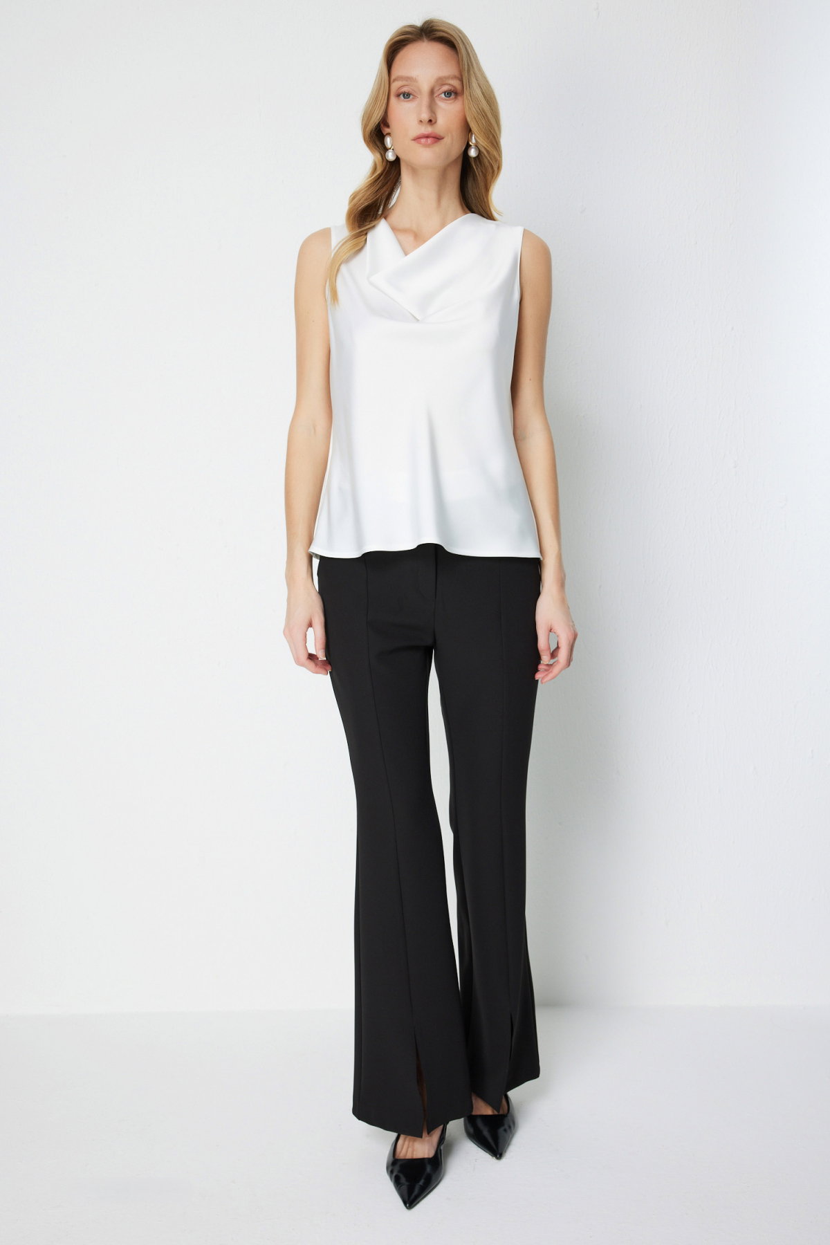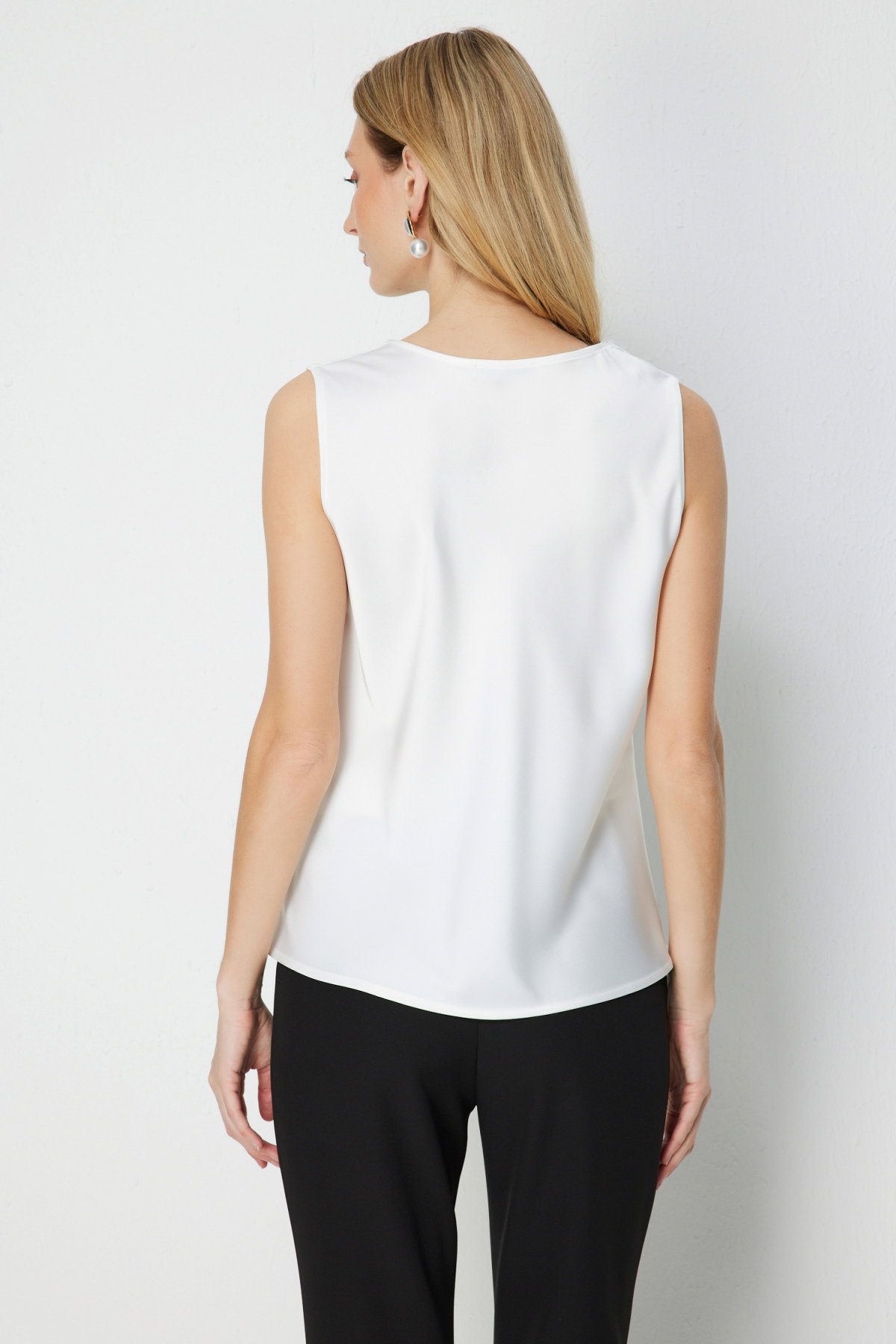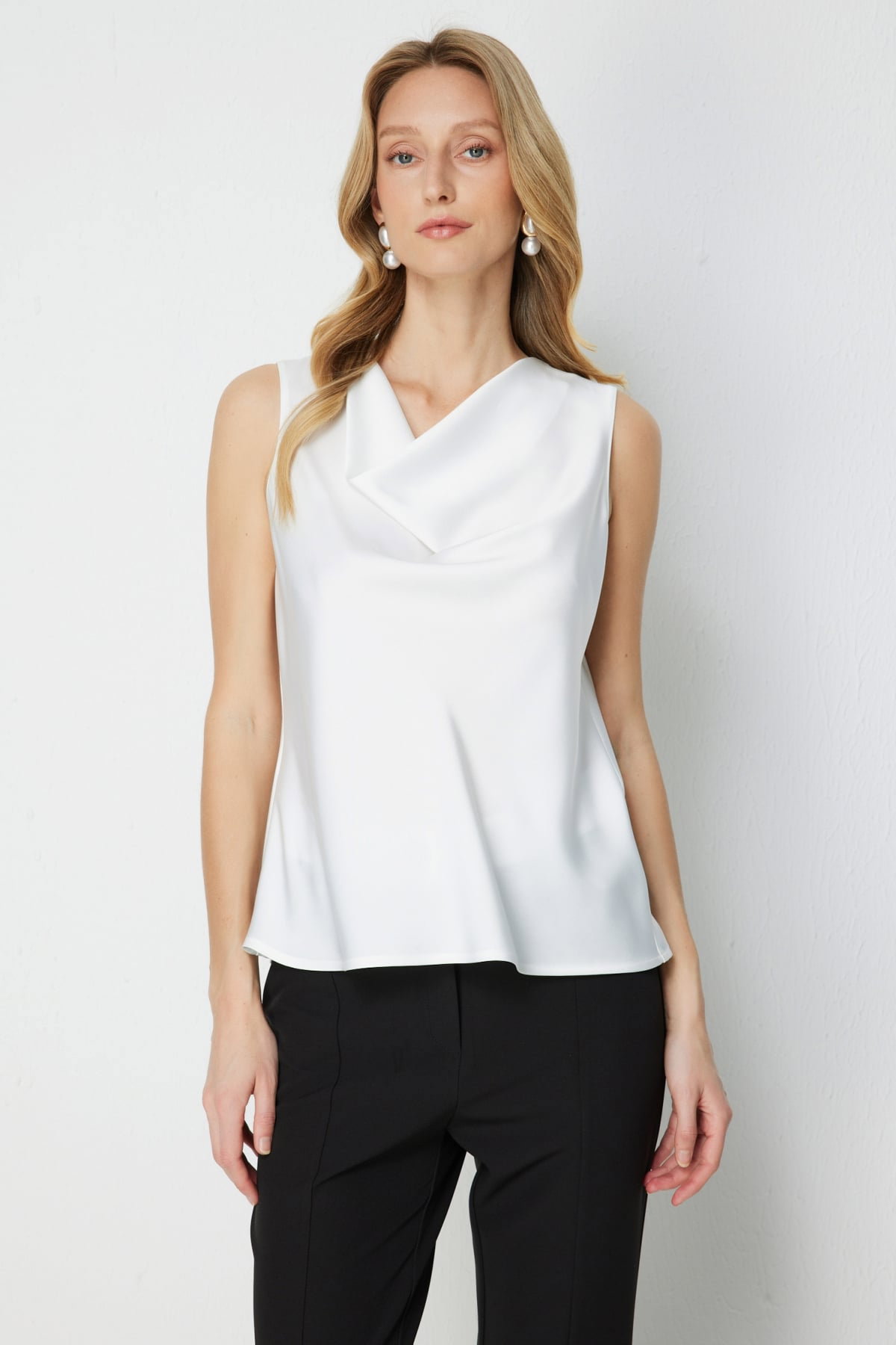 Detay: Polyester kumaş, astarsız, degaje yaka, kolsuz bluz tüm bu özellikleri ile zarif ve feminen bir görünüm sunar. Degaje yaka detayı şıklığı ön plana çıkarırken astarsız yapısı hafiflik sağlar. Kolsuz formu ise rahat bir kullanım sunarak farklı kombinlerde modern bir tarz yaratır;