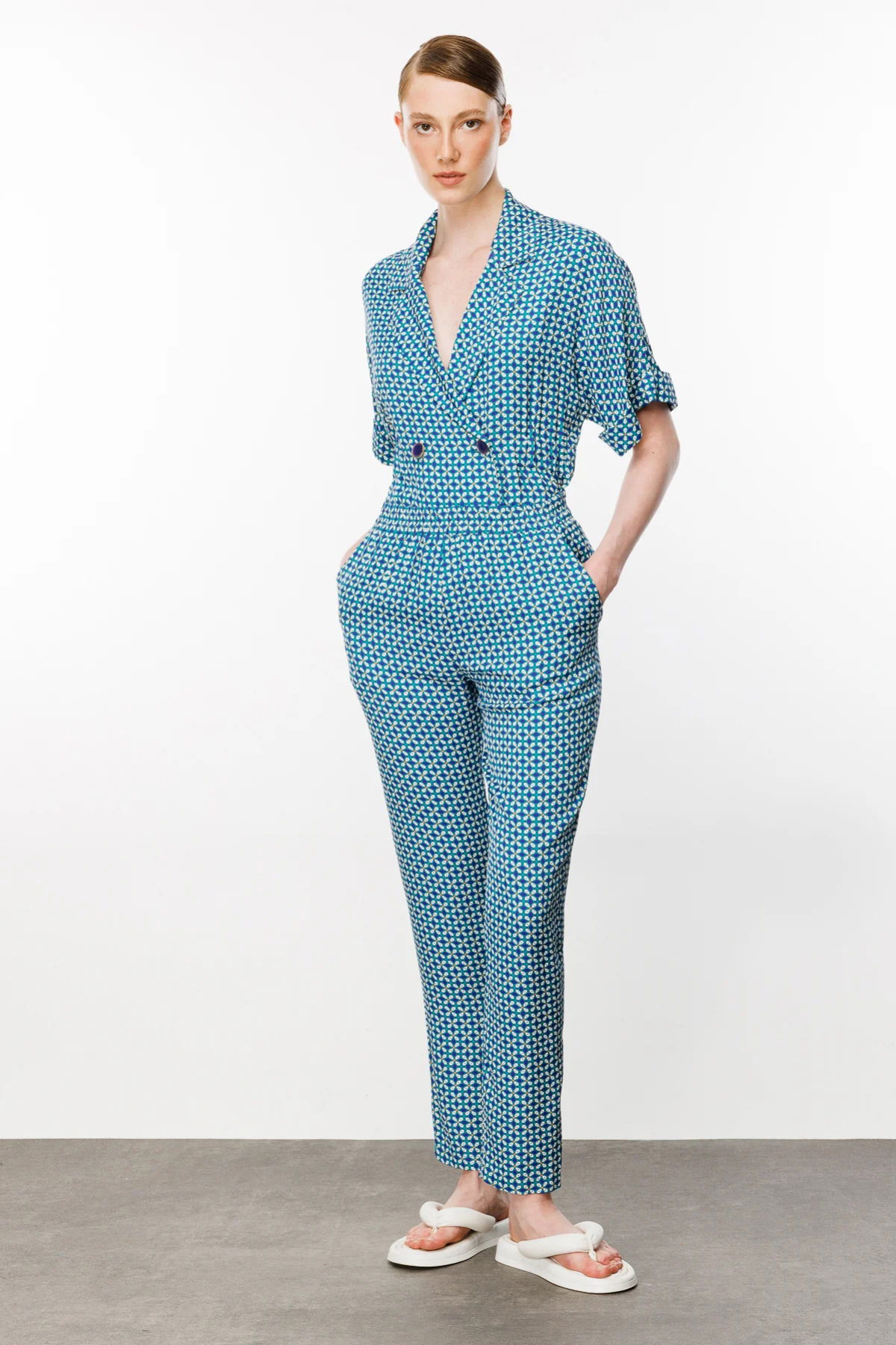 Detay: Beli lastikli, desenli ,dar paça, cepli pantolon, takım üst: 01178;