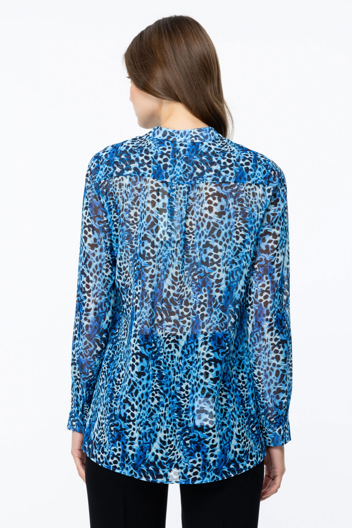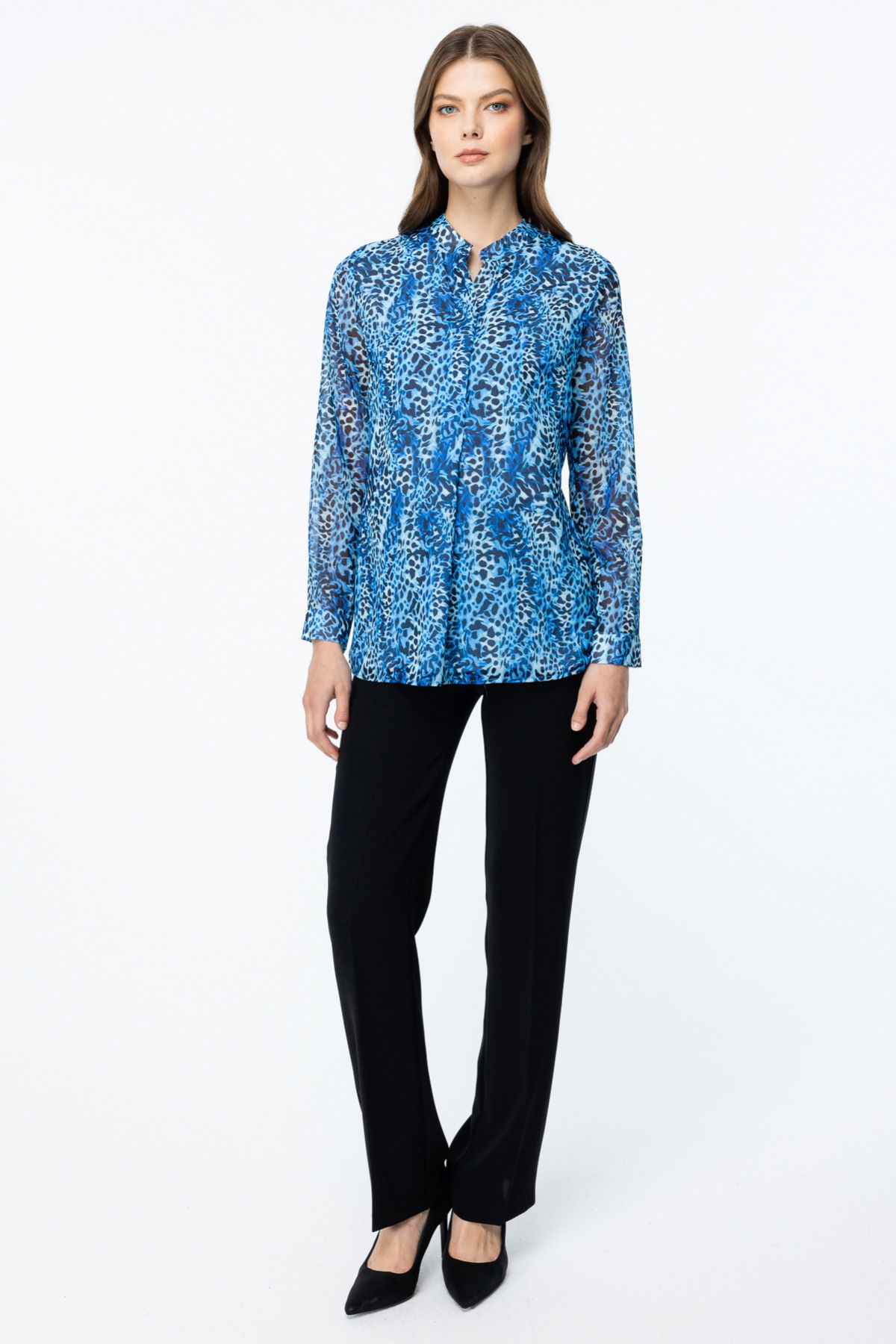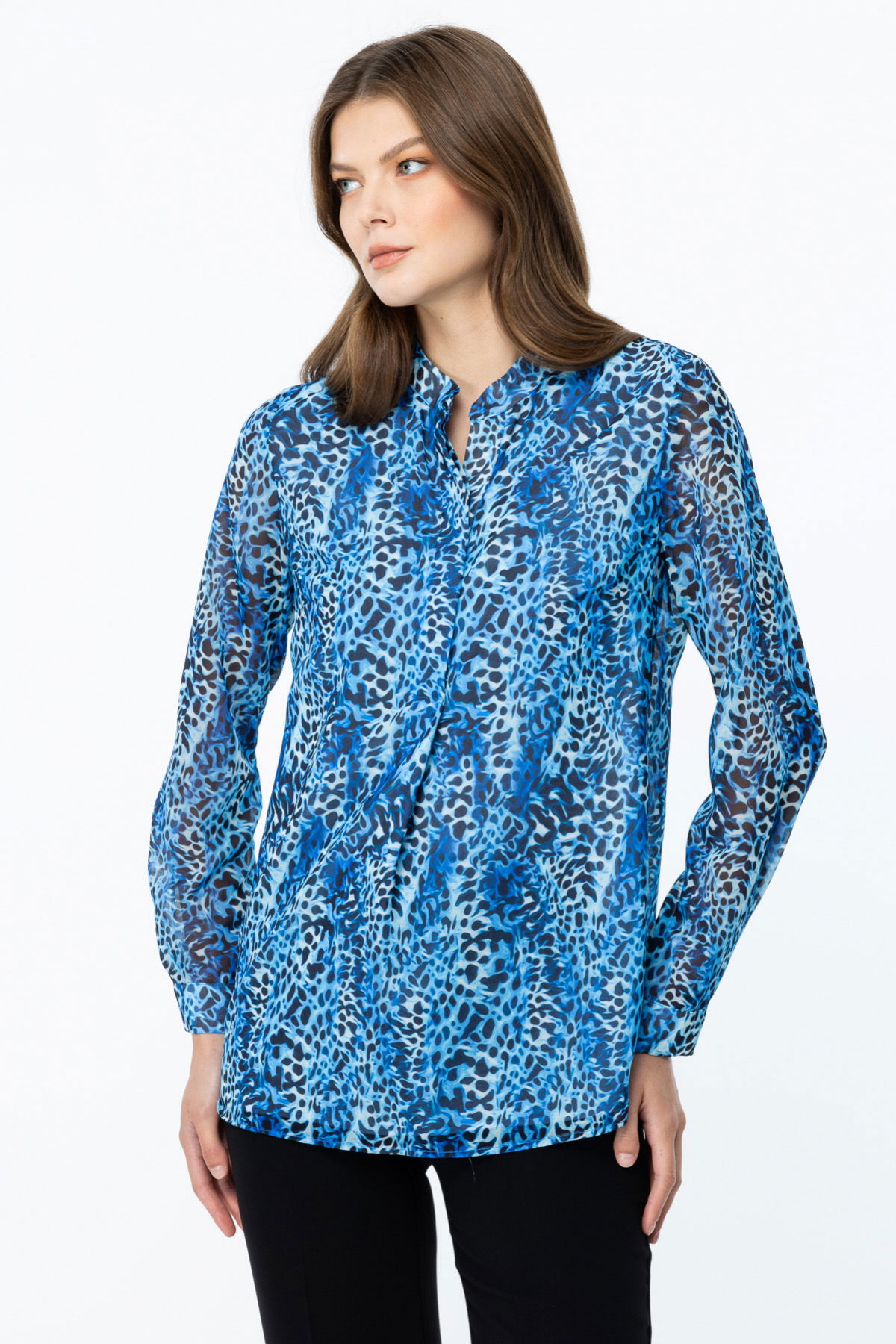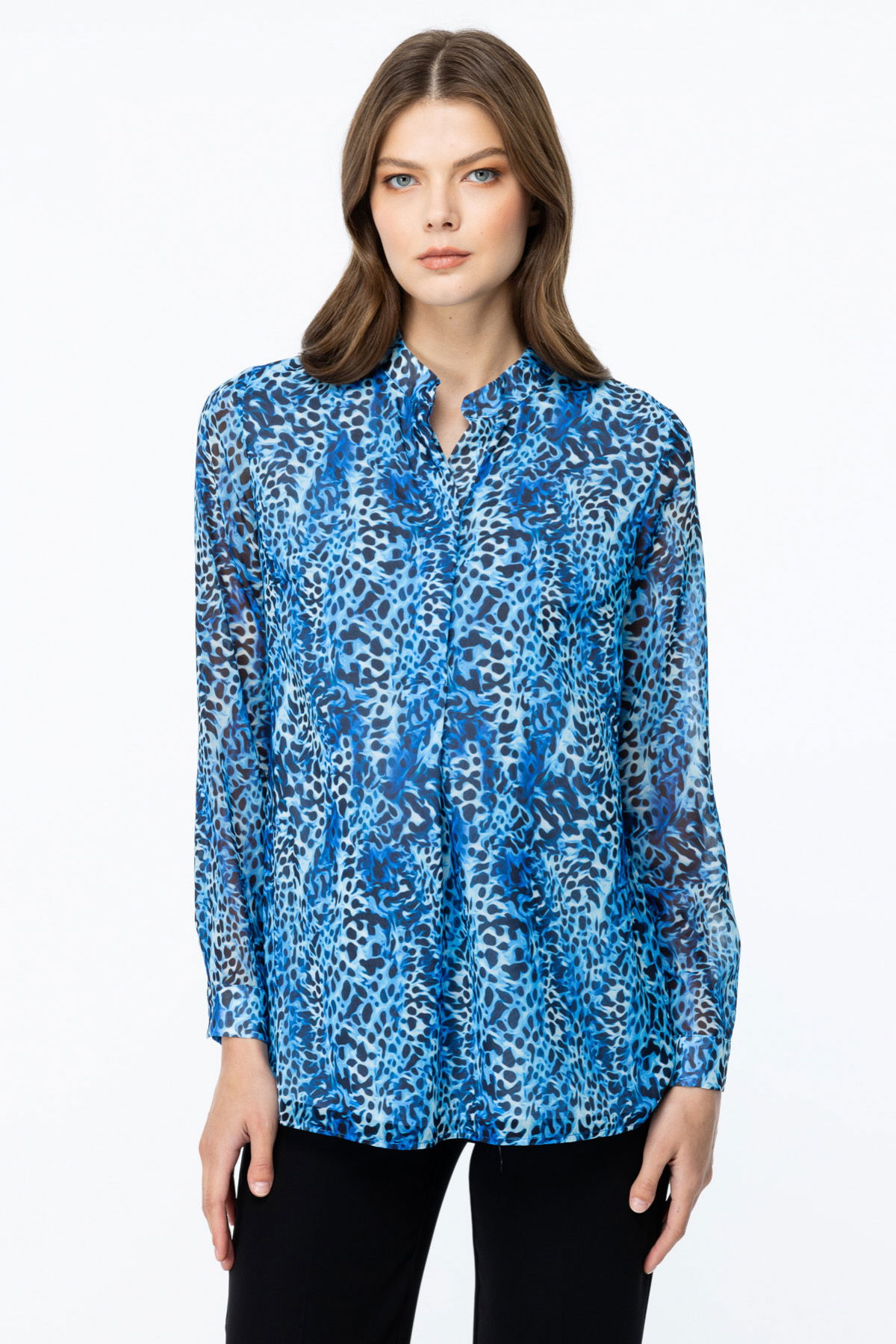 Detay: Desenli, uzun kol, önü düğmeli, hakim yaka bluz;