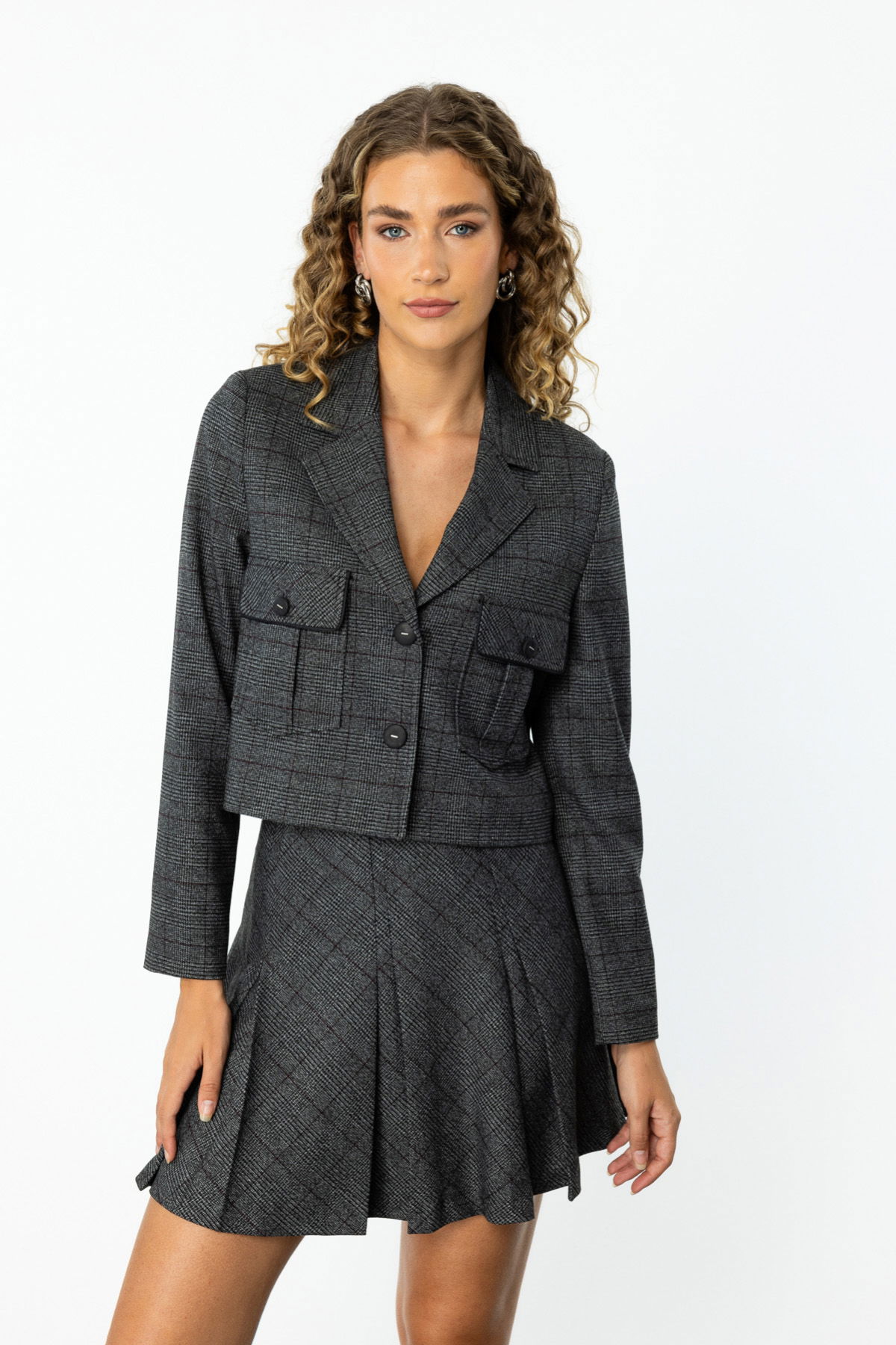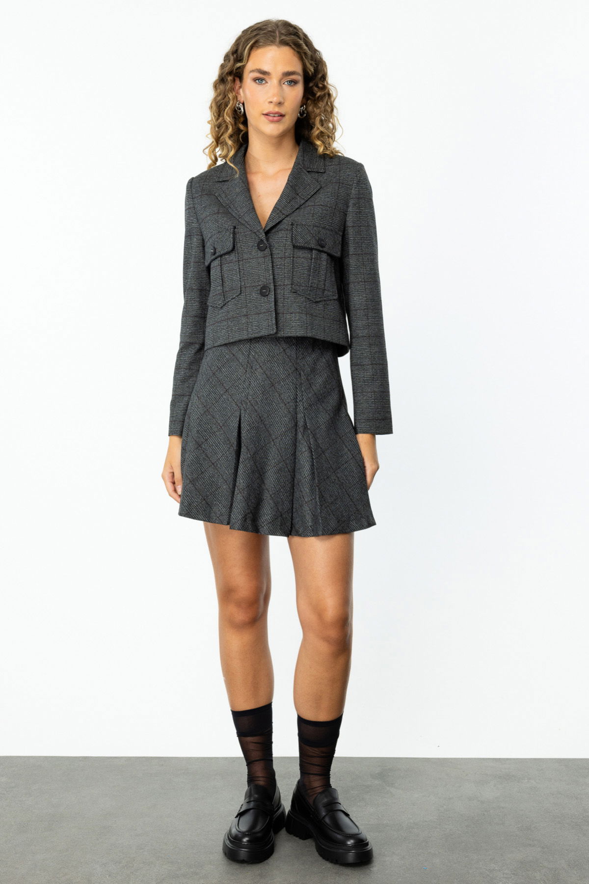 Detay: Ekoseli, kapak cepli, kısa ceket;