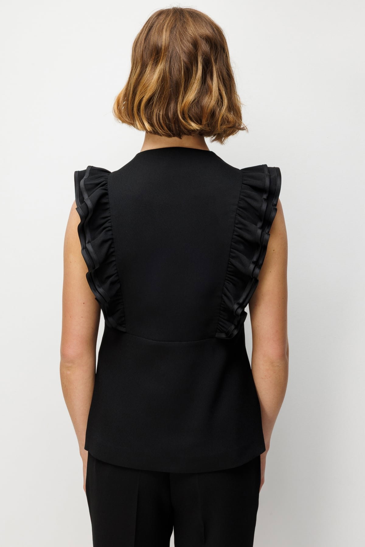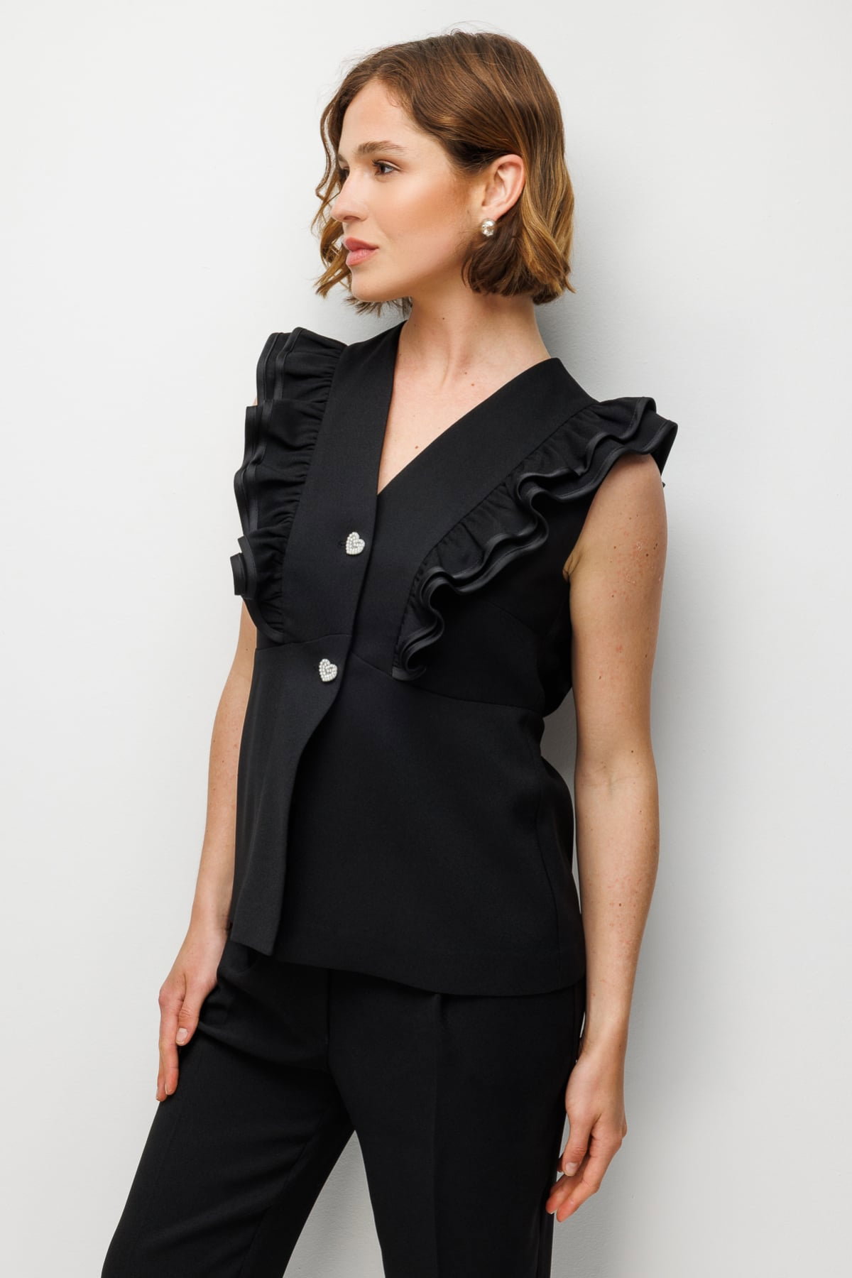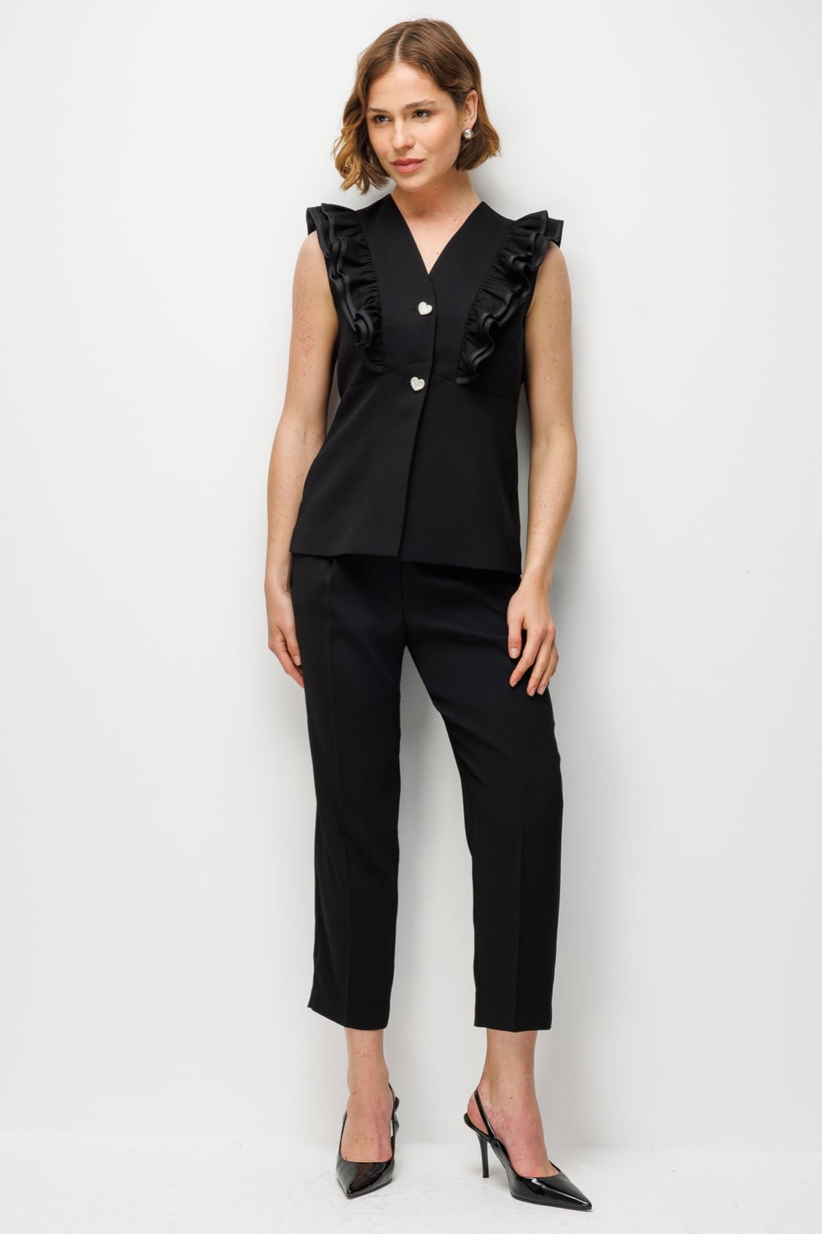 Detay: Dokuma kumaş, astarlı, V yaka, kolsuz, düğmeli kapama detaylarıyla öne çıkan bu yelek klasik ve zarif bir şıklık sunuyor. V yaka tasarımı feminen ve sofistike bir duruş kazandırırken, kolsuz formu özgür bir hareket alanı sağlıyor. Düğmeli kapama klasik bir görünüm oluştururken, astar konforlu bir kullanım hissi veriyor. Dokuma kumaşın dayanıklı yapısı sayesinde hem günlük kombinlerde hem de özel davetlerde çok yönlü bir tercih haline geliyor;