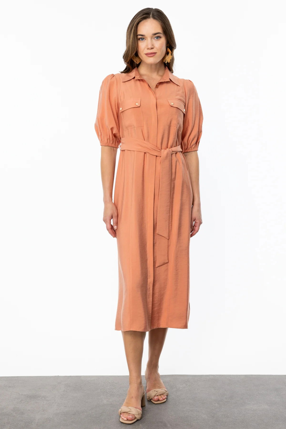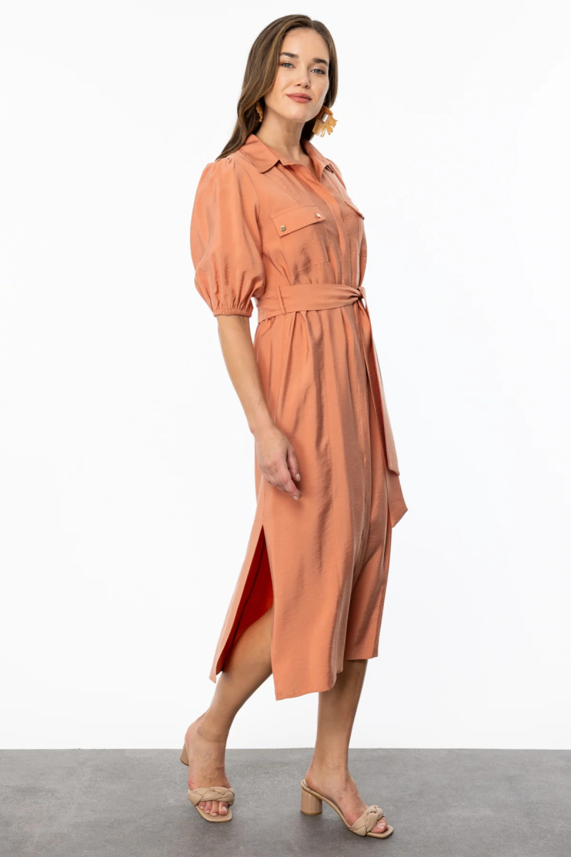 Detay: Polo yaka, gizli düğmeli ,balon kol, cepli, kuşak kemerli, midi boy, yandan yırtmaçlı, astarsız elbise;